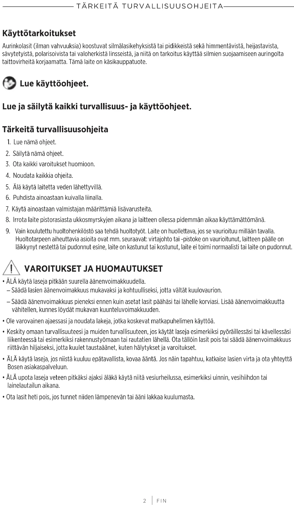 FIN Käyttötarkoitukset Aurinkolasit (ilman vahvuuksia) koostuvat silmälasikehyksistä tai pidikkeistä sekä himmentävistä, heijastavista, sävytetyistä, polarisoivista tai valoherkistä linsseistä, ja niitä on tarkoitus käyttää silmien suojaamiseen auringolta taittovirheitä korjaamatta. Tämä laite on käsikauppatuote. Lue käyttöohjeet. Lue ja säilytä kaikki turvallisuus- ja käyttöohjeet. Tärkeitä turvallisuusohjeita