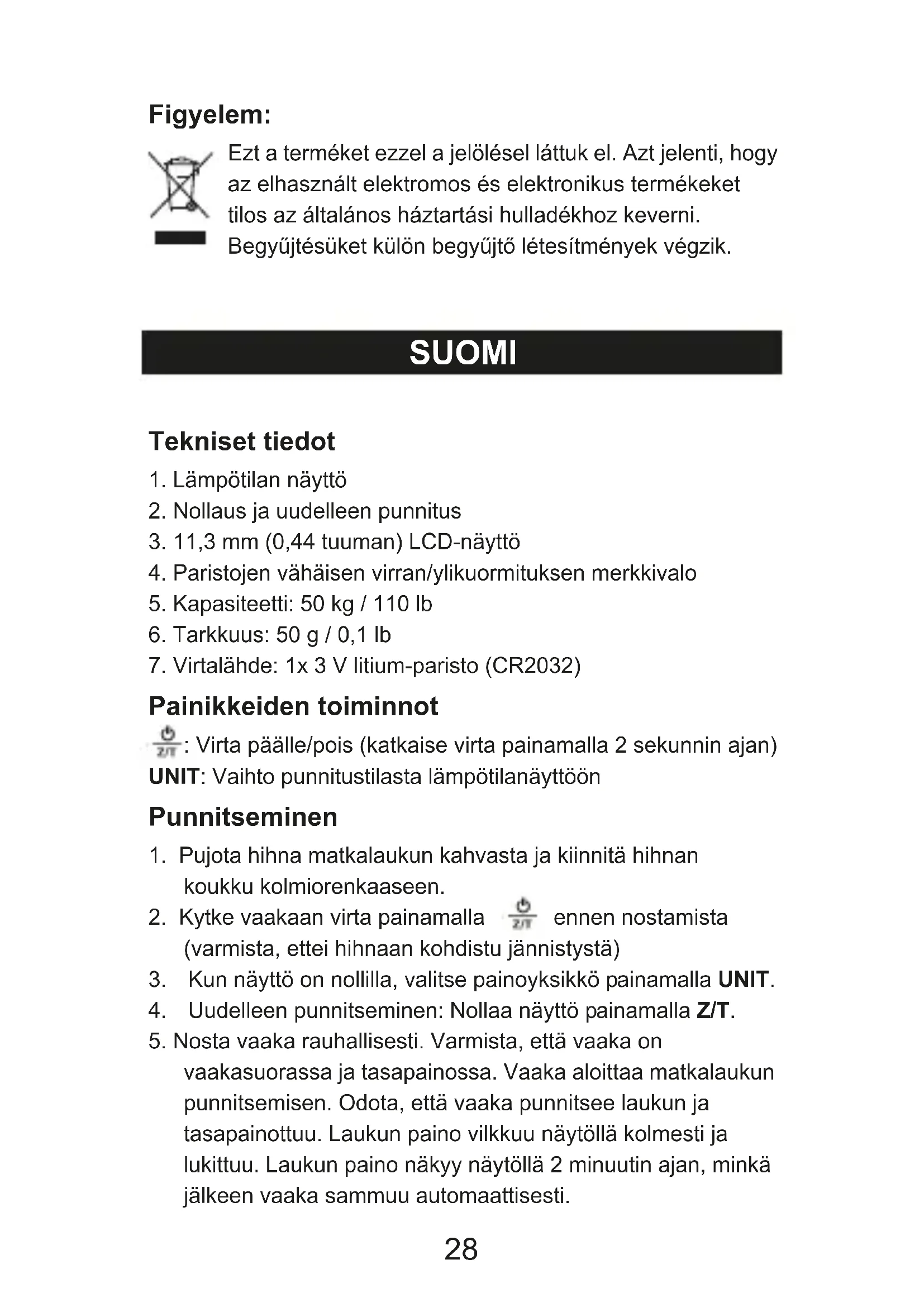 nämä niele paristoa tai muita pieniä osia. Turvallisuuteen liittyvät varoitukset: Sähköiskun riskin pienentämiseksi, AINOASTAAN valtuutettu huoltohenkilö saa avata tämän laitteen huoltoa varten. Jos ongelmia ilmenee, irrota laite verkkovirrasta ja muista laitteista. Älä altista laitetta vedelle äläkä kosteudelle. Huolto: Puhdista ainoastaan kuivalla kankaalla. Älä käytä liuottimia tai hankausaineita. Takuu: Takuu ja vastuuvelvollisuus mitätöityvät, jos tuote vaurioituu siihen tehtyjen muutoksien tai sen väärinkäytön takia. Yleistä: - Muutoksia malliin ja teknisiin ominaisuuksiin voidaan tehdä ilmoituksetta.31 - Kaikki logot, merkit ja tuotenimet ovat niiden vastaavien omistajien tuotemerkkejä tai rekisteröityjä tuotemerkkejä ja niitä on käsiteltävä sellaisina. - Kaikki oikeudet pidätetään. 1(',6 ei ole vastuussa mistään tämän käyttöohjeen sisältämistä virheistä tai niiden seurauksista. - Säilytä käyttöohjeet ja pakkaus myöhempää käyttötarvetta varten. Huomio: Tuote on varustettu tällä merkillä. Se merkitsee, ettei käytettyjä sähkö- tai elektronisia tuotteita saa hävittää kotitalousjätteen mukana. Kyseisille tuotteille on olemassa erillinen keräysjärjestelmä. SVENSKA Elektronisk bagagevåg Specifikationer