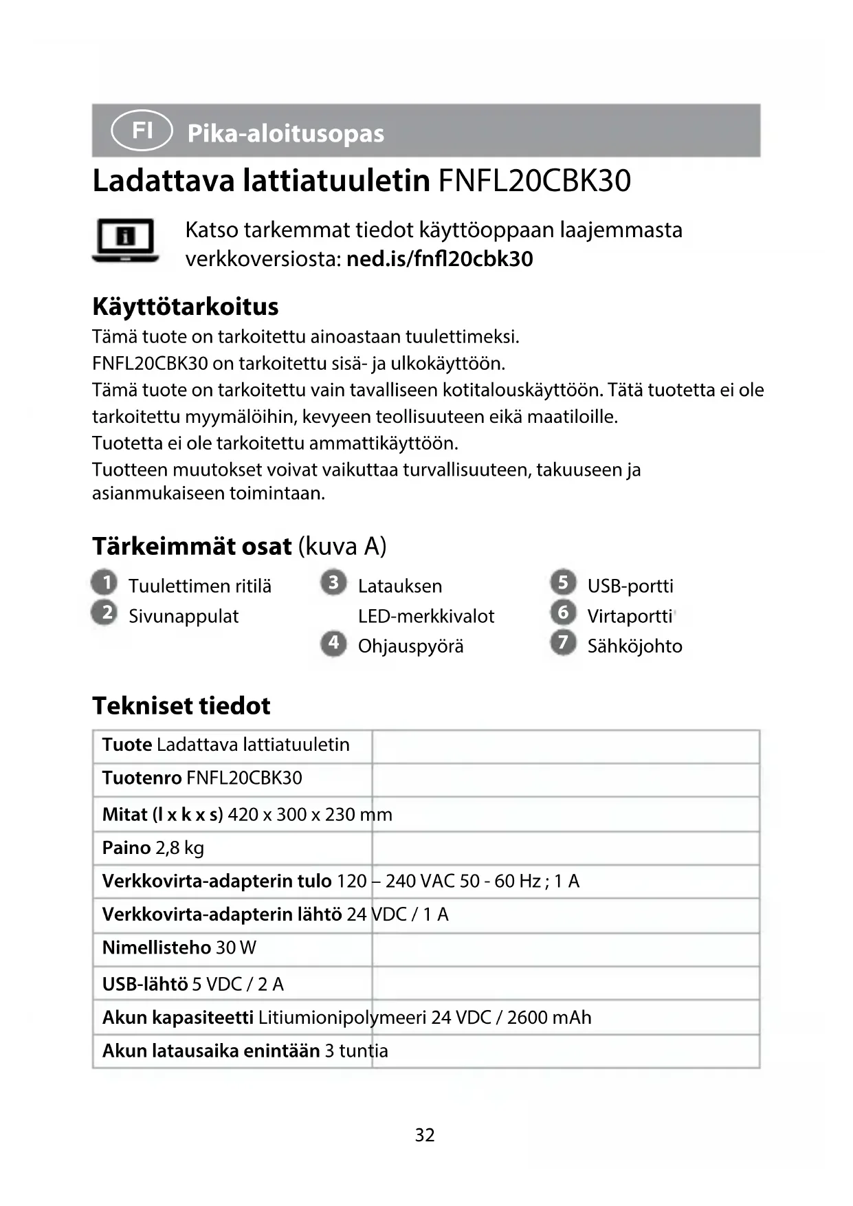 Pika-aloitusopas Ladattava lattiatuuletin FNFL20CBK30 Katso tarkemmat tiedot käyttöoppaan laajemmasta verkkoversiosta: ned.is/fn20cbk30 Käyttötarkoitus Tämä tuote on tarkoitettu ainoastaan tuulettimeksi. FNFL20CBK30 on tarkoitettu sisä- ja ulkokäyttöön. Tämä tuote on tarkoitettu vain tavalliseen kotitalouskäyttöön. Tätä tuotetta ei ole tarkoitettu myymälöihin, kevyeen teollisuuteen eikä maatiloille. Tuotetta ei ole tarkoitettu ammattikäyttöön. Tuotteen muutokset voivat vaikuttaa turvallisuuteen, takuuseen ja asianmukaiseen toimintaan. Tärkeimmät osat (kuva A)
