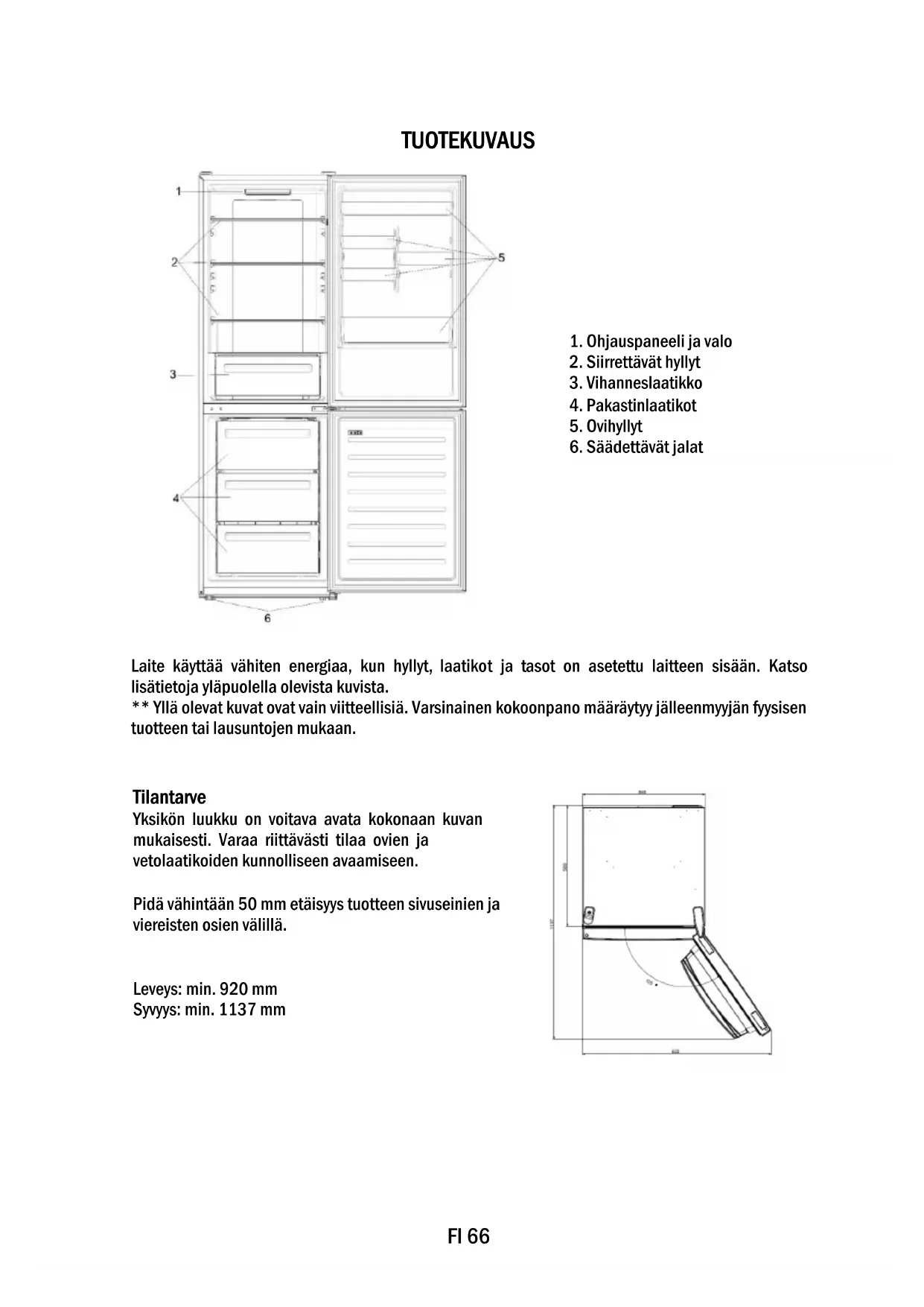 Laite käyttää vähiten energiaa, kun hyllyt, laatikot ja tasot on asetettu laitteen sisään. Katso lisätietoja yläpuolella olevista kuvista. ** Yllä olevat kuvat ovat vain viitteellisiä. Varsinainen kokoonpano määräytyy jälleenmyyjän fyysisen tuotteen tai lausuntojen mukaan. Tilantarve Yksikön luukku on voitava avata kokonaan kuvan mukaisesti. Varaa riittävästi tilaa ovien ja vetolaatikoiden kunnolliseen avaamiseen. Pidä vähintään 50 mm etäisyys tuotteen sivuseinien ja viereisten osien välillä. Leveys: min. 920 mm Syvyys: min. 1137 mmFI 67 KÄYTTÖ ➀ ON/OFF-painike, jolla laite kytketään päälle/pois. ➁ Mode-painike, jolla valitaan jääkaapin lämpötila tai erikoistoiminnot. ➂ Wi-Fi-kuvake, osoittaa, onko laite liitetty sovellukseen. ➃ Super Cool -kuvake, näyttää, onko toiminto aktivoitu. ➄ Lämpötilatasot, näyttää, mikä on valittu lämpötila. Käyttö