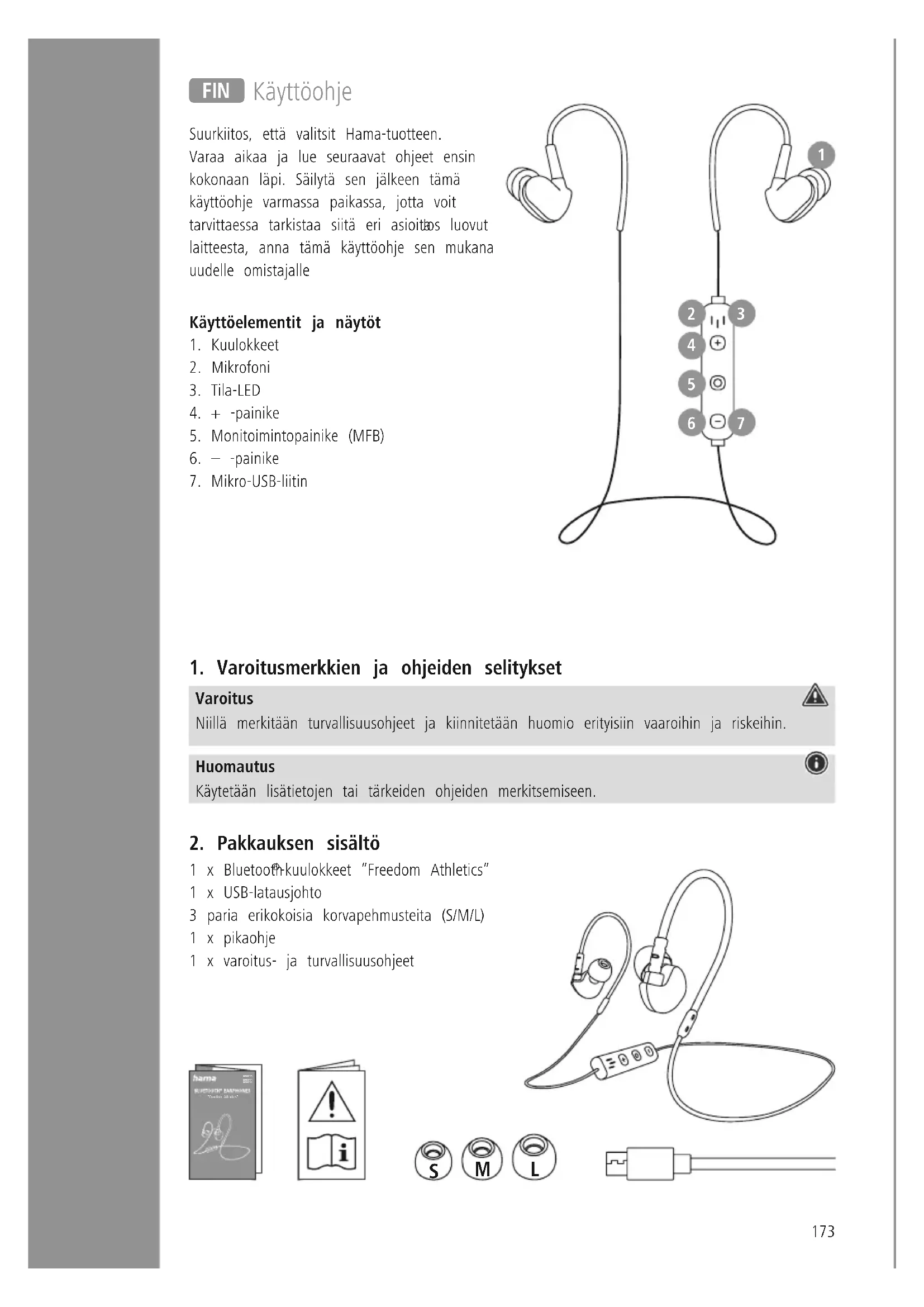 -kuulokkeet ”Freedom Athletics” 1 x USB-latausjohto 3 paria erikokoisia korvapehmusteita (S/M/L) 1 x pikaohje 1 x varoitus- ja turvallisuusohjeet 001841180018411900184120”Freedom Athletics”