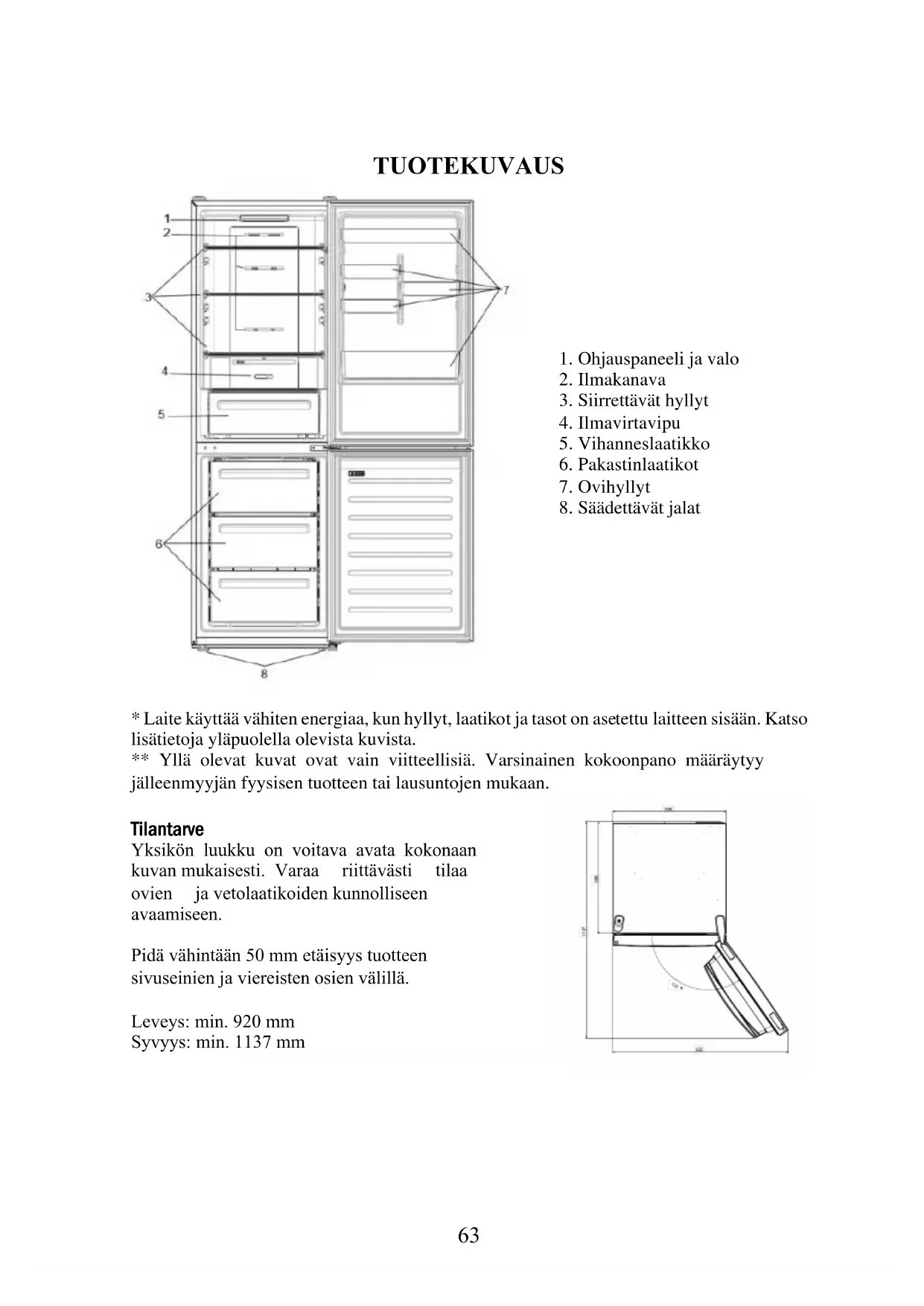 - Laite käyttää vähiten energiaa, kun hyllyt, laatikot ja tasot on asetettu laitteen sisään. Katso lisätietoja yläpuolella olevista kuvista. ** Yllä olevat kuvat ovat vain viitteellisiä. Varsinainen kokoonpano määräytyy jälleenmyyjän fyysisen tuotteen tai lausuntojen mukaan. Tilantarve Yksikön luukku on voitava avata kokonaan kuvan mukaisesti. Varaa riittävästi tilaa ovien ja vetolaatikoiden kunnolliseen avaamiseen. Pidä vähintään 50 mm etäisyys tuotteen sivuseinien ja viereisten osien välillä. Leveys: min. 920 mm Syvyys: min. 1137 mm64 Käyttö