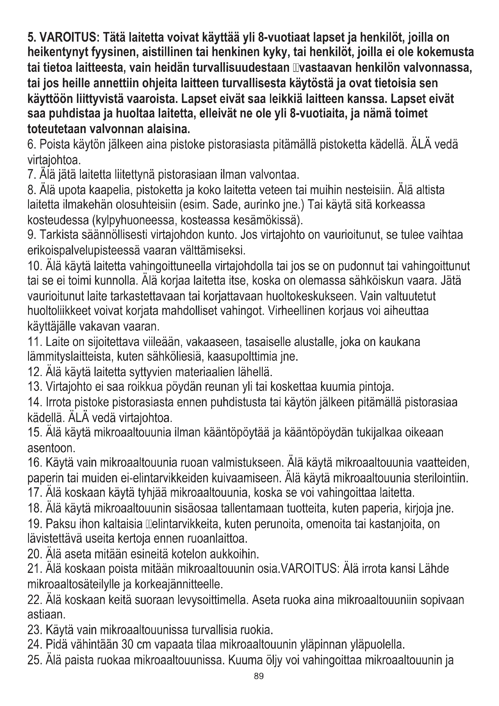vaikuttaa haitallisesti mikroaaltouunin kestävyyteen ja johtaa siten vaarallisiin tilanteisiin. 9048. VAROITUS: Anna lasten käyttää uunia ilman valvontaa vasta, kun heille on annettu asianmukaiset ohjeet, jotta he voivat käyttää uunia turvallisesti ja olla tietoisia väärinkäytöstä aiheutuvista vaaroista.