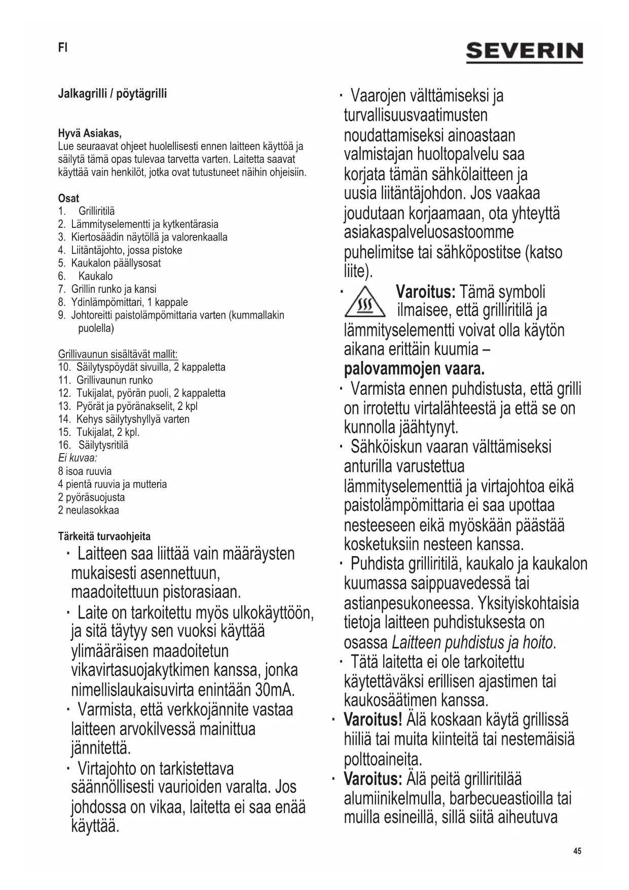 Varoitus: Tämä symboli ilmaisee, että grilliritilä ja lämmityselementti voivat olla käytön aikana erittäin kuumia – palovammojen vaara. ∙ Varmista ennen puhdistusta, että grilli on irrotettu virtalähteestä ja että se on kunnolla jäähtynyt. ∙ Sähköiskun vaaran välttämiseksi anturilla varustettua lämmityselementtiä ja virtajohtoa eikä paistolämpömittaria ei saa upottaa nesteeseen eikä myöskään päästää kosketuksiin nesteen kanssa. ∙ Puhdista grilliritilä, kaukalo ja kaukalon kuumassa saippuavedessä tai astianpesukoneessa. Yksityiskohtaisia tietoja laitteen puhdistuksesta on osassa Laitteen puhdistus ja hoito. ∙ Tätä laitetta ei ole tarkoitettu käytettäväksi erillisen ajastimen tai kaukosäätimen kanssa. ∙ Varoitus! Älä koskaan käytä grillissä hiiliä tai muita kiinteitä tai nestemäisiä polttoaineita. ∙ Varoitus: Älä peitä grilliritilää alumiinikelmulla, barbecueastioilla tai muilla esineillä, sillä siitä aiheutuva FI46 142 x 208 mm kuumuus voi vahingoittaa grilliä. ∙ Kaukaloon voidaan lisätä enintään 2,0 l vettä. ∙ Tämä laite on tarkoitettu kotitalouskäyttöön tai vastaavaan, kuten - ruokalat, toimistot ja muut kaupalliset ympäristöt, - maatalousyritykset, - hotellien, motellien jne. ja vastaavien yritysten asiakkaat, - aamiaisen ja majoituksen tarjoavat majatalot. ∙ Tätä laitetta saavat käyttää lapset (vähintään 8-vuotiaat) sekä henkilöt, joilla on fyysisesti, aistillisesti tai henkisesti rajoittunut toimintakyky tai joilla on puuttuvat tai vajavaiset tiedot laitteen toiminnasta, mikäli heitä valvotaan tai ohjataan laitteen käytössä ja he ymmärtävät täysin kaikki käyttöön liittyvät vaarat ja turvatoimenpiteet. ∙ Lasten ei saa antaa leikkiä laitteella. ∙ Lasten ei saa antaa tehdä laitteen puhdistus- tai huoltotoimenpiteitä, elleivät he ole aikuisen valvonnassa sekä vähintään 8 vuotta vanhoja. ∙ Laite ja sen liitäntäjohto täytyy aina pitää alle 8-vuotiaiden ulottumattomissa. ∙ Varoitus: Pidä lapset poissa pakkausmateriaalien luota potentiaalisen vaaratilanteen esim. tukehtumisvaaran vuoksi. ∙ Ennen käyttöä laite ja mahdolliset lisäosat tulee tarkistaa vaurioiden varalta. Jos laite putoaa kovalle alustalle, sitä ei saa enää käyttää: näkymättömätkin vauriot voivat aiheuttaa vaaratilanteita laitetta käytettäessä. ∙ Käytön aikana grillin on oltava tulenkestävällä, roiskeet ja tahrautumisen kestävällä työtasolla. Rasvaista tai nestepitoista ruokaa valmistettaessa ei aina ole mahdollista välttää roiskumista. ∙ Älä aseta grilliä seinän viereen tai nurkkaan ja varmista, ettei sen lähellä ole tulenarkoja materiaaleja. ∙ Muista, että varsinkin rasvainen ja nestepitoinen ruoka voi syttyä palamaan; täytä sen takia kaukaloon aina vettä ennen käyttöä. Älä kytke grilliä sähköverkkoon ennen kuin olet lisännyt kaukaloon veden. Vesi jäähdyttää kaukaloa, vähentää savunmuodostusta ja lisäksi helpottaa puhdistamista. ∙ Valvo jatkuvasti veden pinnan tasoa. Lisää vettä hyvissä ajoin ja varmista, ettei se joudu kosketuksiin lämmityselementin kanssa. Varoitus: Kytke grillin liitäntäjohto irti verkkovirrasta ennen kuin lisäät vettä. ∙ Tarkista aina ennen grillin käyttöä, että lämmityselementti on asennettu oikein runkoon ja kaukaloon. ∙ Grilliä ei saa jättää toimintaan ilman valvontaa. ∙ Älä anna liitäntäjohdon koskea laitteen kuumia osia. ∙ Reititä virtajohto niin, ettei kukaan voi kompastua siihen. ∙ Irrota pistoke pistorasiasta aina - ennen veden lisäämistä kaukaloon, - käytön jälkeen, - jos laitteessa ilmenee vikaa, - ennen laitteen puhdistusta. ∙ Jatkojohdon tai johtokelan käyttö aiheuttaa tehon heikkenemistä ja mahdollisesti myöhemmin lämmönmuodostusta johtoon. Siitä syystä johto on vedettävä kokonaan esiin ennen käyttöä. Varmista, että johto on tarkoitettu ulkokäyttöön ja eritellylle teholle (katso arvokilpi). ∙ Grillivaunua ei saa siirtää sivupöydästä työntämällä. Poista ensin sivupöytä ja ota aina kiinni rungosta. ∙ Älä käytä grillivaunua tavaroiden kuljetukseen. ∙ Älä koskaan liikuta grilliä käytön aikana. ∙ Poista vesi käytön jälkeen. ∙ Huomio! Anna grillin aina jäähtyä täydellisesti ennen kuin siirrät, puhdistat, peität tai laitat sen säilytykseen. ∙ Huomio! Jos grilliä ei käytetä, lämmityselementti on kytkentärasioineen irrotettava grillistä ja sitä on säilytettävä sisällä kosteudelta suojattuna. ∙ Muita grillin osia ei saa säilyttää ulkona tai sellaisissa suojaamattomissa paikoissa, missä ne altistuvat säätilan vaikutuksille. ∙ Grilliä saa käyttää vain mukana tulevan ydinlämpömittarin tai SEVERIN-mittarin tuotenumero ZB 8126 kanssa. ∙ Valmistaja ei ole vastuussa mahdollisista vaurioista, jos ne johtuvat laitteen väärinkäytöstä tai käyttöohjeiden laiminlyömisestä. ∙ Tämä tuote on kaikkien voimassa olevien CE-merkintöjä koskevien direktiivien mukainen.47 142 x 208 mm Ennen ensimmäistä käyttöä ∙ Poista laitteesta pakkausmateriaali ja tarrat. ∙ Puhdista grilliritilä, kaukalo ja kaukalon päällysosat kuumassa saippuavedessä; pyyhi ne sitten kauttaaltaan kuiviksi. ∙ Kokoa laite luvussa Laitteen valmistelu olevan kuvauksen mukaisesti. ∙ Anna grillin lämmetä noin 10 minuutin ajan maksimiteholla ilman ruokia (katso Grillauksen tehostusalue). Näin laitteesta poistuu haju, jota ilmenee tavallisesti ensimmäisen käytön yhteydessä. Laitteesta voi tulla jonkin verran savua; sen takia täytyy varmistaa riittävä tuuletus avaamalla ikkuna tai parvekkeen ovi; myös liesituuletinta voidaan käyttää. Grillin kokoaminen ∙ Kokoa grilli kaaviokuvien mukaisesti: ∙ Aseta kaukalo grillin runkoon. ∙ Asenna kaukalon päällysosat niin, että kukin päällysosa peittää neljä ulkonemaa. ∙ Asenna lämmityselementti ja kytkentärasia kaukaloon. Laite sisältä