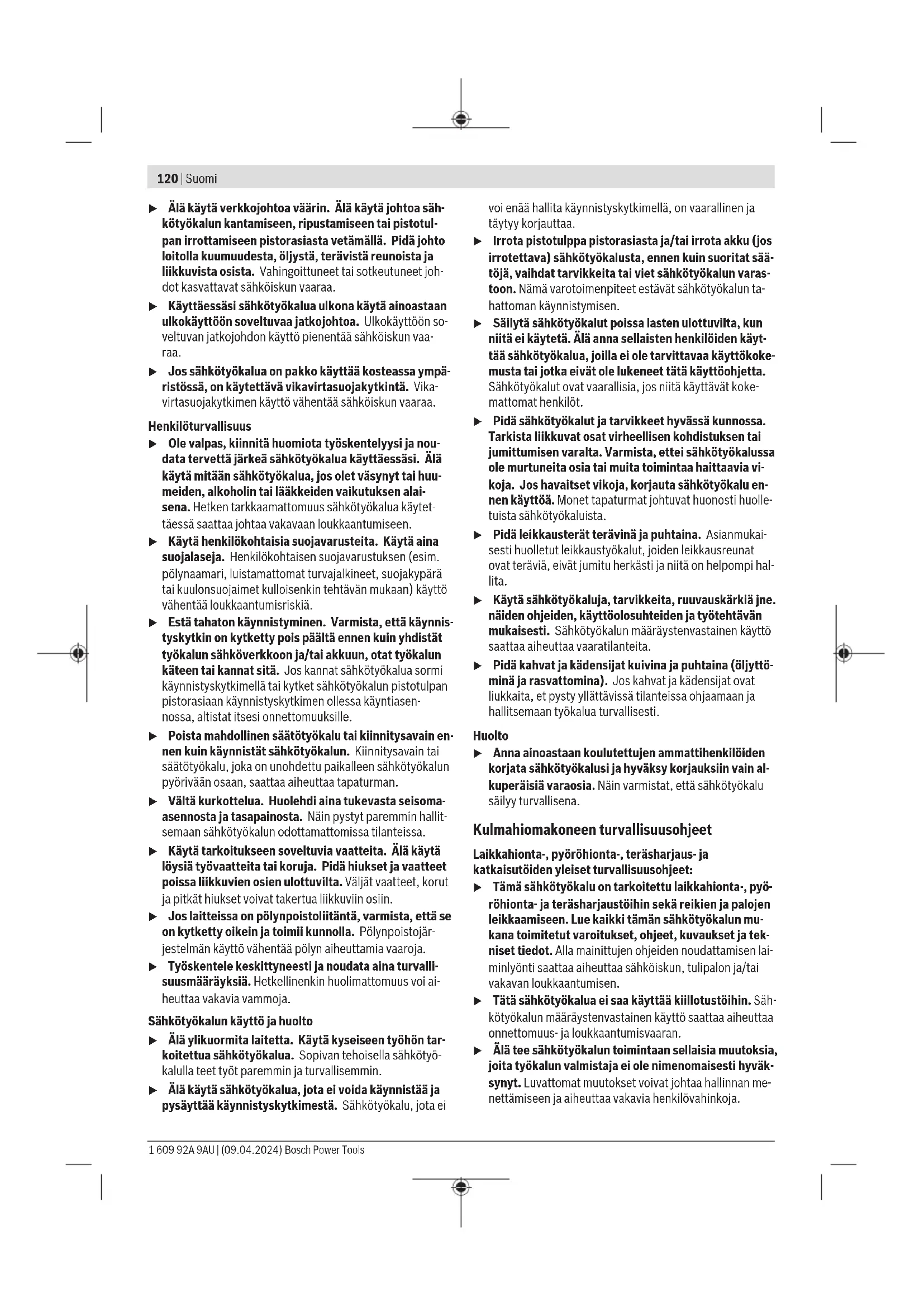 Bryterutførelse med lås For å slå på elektroverktøyet trykker du først på på-/av- bryter(3) ➊, og deretter skyver du den forover ➋. Trykk deretter på den og hold den inne ➌. For å låse den inntrykte på-/av-bryter(3) skyver du på-/av- bryter(3) lenger forover ➍. For å slå av elektroverktøyet slipper du på-/av-bryter(3), eller du trykker kort på på-/av-bryter(3) og slipper den hvis den er låst. Bryterutførelse uten lås 1 609 92A 9AU | (09.04.2024) Bosch Power ToolsSuomi | 119 For å slå på elektroverktøyet trykker du først på på-/av- bryter(3) ➊, og deretter skyver du den forover ➋. Trykk deretter på den og hold den inne ➌. For å slå av elektroverktøyet slipper du på-/av-bryter(3). u Kontroller slipeverktøyet før bruk. Slipeverktøyet må være riktig montert, og må kunne rotere fritt. Test verktøyet i minst ett minutt uten belastning. Bruk ikke skadde, deformerte eller vibrerende slipeverktøy. Skadde slipeverktøy kan gå i stykker og forårsake personskader. Service og vedlikehold Vedlikehold og rengjøring u Før alle arbeider på elektroverktøyet utføres må støpselet trekkes ut av stikkontakten. u Hold selve elektroverktøyet og ventilasjonsslissene alltid rene, for å kunne arbeide bra og sikkert. u Bruk om mulig et avsugsanlegg ved ekstreme forhold på arbeidsplassen. Blås ventilasjonsslissene rene ofte, og koble til en feilstrømvernebryter (PRCD). Ved bearbeidelse av metall kan det sette seg lededyktig støv inne i elektroverktøyet. Beskyttelsesisolasjonen til elektroverktøyet kan innskrenkes. Tilbehøret må lagres og behandles med omhu. Hvis det er nødvendig å skifte ut tilkoblingsledningen, må dette gjøres av Bosch eller godkjente Bosch- serviceverksteder, slik at det ikke oppstår fare for sikkerheten. Kundeservice og kundeveiledning Kundeservice hjelper deg ved spørsmål om reparasjon og vedlikehold av produktet ditt og reservedelene. Du finner også sprengskisser og informasjon om reservedeler på www.bosch-pt.com Boschs kundeveilederteam hjelper deg gjerne hvis du har spørsmål om våre produkter og tilbehør. Ved alle forespørsler og reservedelsbestillinger må du oppgi det 10‑sifrede produktnummeret som er angitt på produktets typeskilt. Norsk Robert Bosch AS Postboks 350 1402 Ski Tel.: 64 87 89 50 Faks: 64 87 89 55 Du finner adresser til andre verksteder på: www.bosch-pt.com/serviceaddresses Deponering Elektroverktøy, tilbehør og emballasje må leveres inn til miljøvennlig gjenvinning. Elektroverktøy må ikke kastes i vanlig søppel! Bare for land i EU: Elektroverktøy som ikke lenger er i brukbar stand, skal leveres til kildesortering. Bruk innsamlingssystemene som er beregnet for dette formålet. Ikke-forskriftsmessig håndtering av elektrisk og elektronisk avfall kan føre til miljø- og helseskader på grunn av eventuelle farlige stoffer. Suomi Turvallisuusohjeet Yleiset sähkötyökalujen turvaohjeet VAROITUS Lue kaikki tämän sähkötyökalun mukana toimitetut varoitukset, oh- jeet, kuvat ja tekniset tiedot. Alla mainittujen ohjeiden noudattamisen laiminlyönti saattaa aiheuttaa sähköiskun, tu- lipalon ja/tai vakavan loukkaantumisen. Säilytä kaikki turvallisuusohjeet ja muut ohjeet tulevai- suutta varten. Turvallisuusohjeissa käytetty käsite "sähkötyökalu" käsittää verkkokäyttöisiä sähkötyökaluja (verkkojohdolla) ja akku- käyttöisiä sähkötyökaluja (ilman verkkojohtoa). Työpaikan turvallisuus u Pidä työskentelyalue puhtaana ja hyvin valaistuna. Työpaikan epäjärjestys tai valaisemattomat työalueet voi- vat johtaa tapaturmiin. u Älä työskentele sähkötyökalulla räjähdysalttiissa ym- päristössä, jossa on palavaa nestettä, kaasua tai pö- lyä. Sähkötyökalu muodostaa kipinöitä, jotka saattavat sytyttää pölyn tai höyryn. u Pidä lapset ja sivulliset loitolla sähkötyökalua käyt- täessäsi. Voit menettää laitteen hallinnan, jos suuntaat huomiosi muualle. Sähköturvallisuus u Sähkötyökalun pistotulpan tulee sopia pistorasiaan. Pistotulppaa ei saa muuttaa millään tavalla. Älä käytä minkäänlaisia pistorasia-adaptereita maadoitettujen sähkötyökalujen kanssa. Alkuperäisessä kunnossa ole- vat pistotulpat ja sopivat pistorasiat vähentävät sähköis- kun vaaraa. u Vältä maadoitettujen pintojen, kuten putkien, patte- reiden, liesien tai jääkaappien koskettamista. Säh- köiskun vaara kasvaa, jos kehosi on maadoitettu. u Älä altista sähkötyökalua sateelle tai kosteudelle. Ve- den pääsy sähkötyökalun sisään kasvattaa sähköiskun ris- kiä. Bosch Power Tools 1 609 92A 9AU | (09.04.2024)120 | Suomi u Älä käytä verkkojohtoa väärin. Älä käytä johtoa säh- kötyökalun kantamiseen, ripustamiseen tai pistotul- pan irrottamiseen pistorasiasta vetämällä. Pidä johto loitolla kuumuudesta, öljystä, terävistä reunoista ja liikkuvista osista. Vahingoittuneet tai sotkeutuneet joh- dot kasvattavat sähköiskun vaaraa. u Käyttäessäsi sähkötyökalua ulkona käytä ainoastaan ulkokäyttöön soveltuvaa jatkojohtoa. Ulkokäyttöön so- veltuvan jatkojohdon käyttö pienentää sähköiskun vaa- raa. u Jos sähkötyökalua on pakko käyttää kosteassa ympä- ristössä, on käytettävä vikavirtasuojakytkintä. Vika- virtasuojakytkimen käyttö vähentää sähköiskun vaaraa. Henkilöturvallisuus u Ole valpas, kiinnitä huomiota työskentelyysi ja nou- data tervettä järkeä sähkötyökalua käyttäessäsi. Älä käytä mitään sähkötyökalua, jos olet väsynyt tai huu- meiden, alkoholin tai lääkkeiden vaikutuksen alai- sena. Hetken tarkkaamattomuus sähkötyökalua käytet- täessä saattaa johtaa vakavaan loukkaantumiseen. u Käytä henkilökohtaisia suojavarusteita. Käytä aina suojalaseja. Henkilökohtaisen suojavarustuksen (esim. pölynaamari, luistamattomat turvajalkineet, suojakypärä tai kuulonsuojaimet kulloisenkin tehtävän mukaan) käyttö vähentää loukkaantumisriskiä. u Estä tahaton k