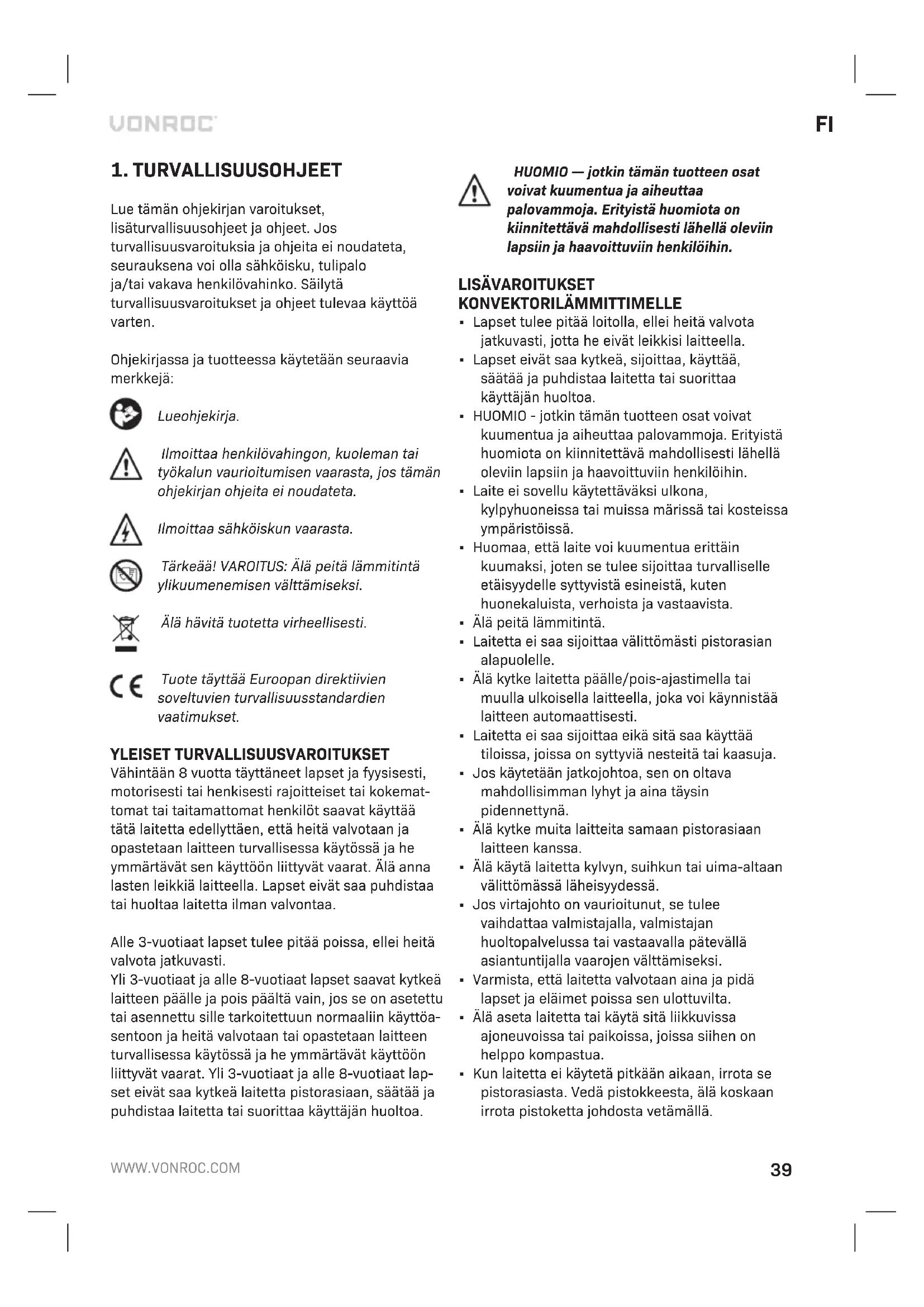 Lue tämän ohjekirjan varoitukset, lisäturvallisuusohjeet ja ohjeet. Jos turvallisuusvaroituksia ja ohjeita ei noudateta, seurauksena voi olla sähköisku, tulipalo ja/tai vakava henkilövahinko. Säilytä turvallisuusvaroitukset ja ohjeet tulevaa käyttöä varten. Ohjekirjassa ja tuotteessa käytetään seuraavia merkkejä: Lue ohjekirja. Ilmoittaa henkilövahingon, kuoleman tai työkalun vaurioitumisen vaarasta, jos tämän ohjekirjan ohjeita ei noudateta. Ilmoittaa sähköiskun vaarasta. Tärkeää! VAROITUS: Älä peitä lämmitintä ylikuumenemisen välttämiseksi. Älä hävitä tuotetta virheellisesti. Tuote täyttää Euroopan direktiivien soveltuvien turvallisuusstandardien vaatimukset. YLEISET TURVALLISUUSVAROITUKSET Vähintään 8 vuotta täyttäneet lapset ja fyysisesti, motorisesti tai henkisesti rajoitteiset tai kokemat- tomat tai taitamattomat henkilöt saavat käyttää tätä laitetta edellyttäen, että heitä valvotaan ja opastetaan laitteen turvallisessa käytössä ja he ymmärtävät sen käyttöön liittyvät vaarat. Älä anna lasten leikkiä laitteella. Lapset eivät saa puhdistaa tai huoltaa laitetta ilman valvontaa. Alle 3-vuotiaat lapset tulee pitää poissa, ellei heitä valvota jatkuvasti. Yli 3-vuotiaat ja alle 8-vuotiaat lapset saavat kytkeä laitteen päälle ja pois päältä vain, jos se on asetettu tai asennettu sille tarkoitettuun normaaliin käyttöa- sentoon ja heitä valvotaan tai opastetaan laitteen turvallisessa käytössä ja he ymmärtävät käyttöön liittyvät vaarat. Yli 3-vuotiaat ja alle 8-vuotiaat lap- set eivät saa kytkeä laitetta pistorasiaan, säätää ja puhdistaa laitetta tai suorittaa käyttäjän huoltoa. HUOMIO — jotkin tämän tuotteen osat voivat kuumentua ja aiheuttaa palovammoja. Erityistä huomiota on kiinnitettävä mahdollisesti lähellä oleviin lapsiin ja haavoittuviin henkilöihin. LISÄVAROITUKSET KONVEKTORILÄMMITTIMELLE