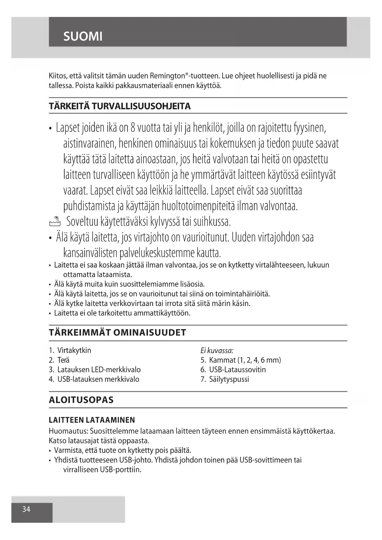 Jotta vältettäisiin vaarallisista aineista ympäristölle ja terveydelle koituvat haitat, näillä symboleilla varustettuja laitteita sekä ladattavia ja kertakäyttöisiä paristoja ei saa hävittää lajittelemattomana sekajätteenä. Hävitä sähkö- ja elektroniikkatuotteet sekä, mikäli sovellettavissa, ladattavat ja kertakäyttöiset paristot asianmukaiseen viralliseen kierrätys-/keräilypisteeseen. SUOMI37 PORTUGUÊS Obrigado por adquirir este novo produto Remington®. Leia o manual de instruções e conserve-o em lugar seguro. Retire todo o material de embalagem antes do uso.