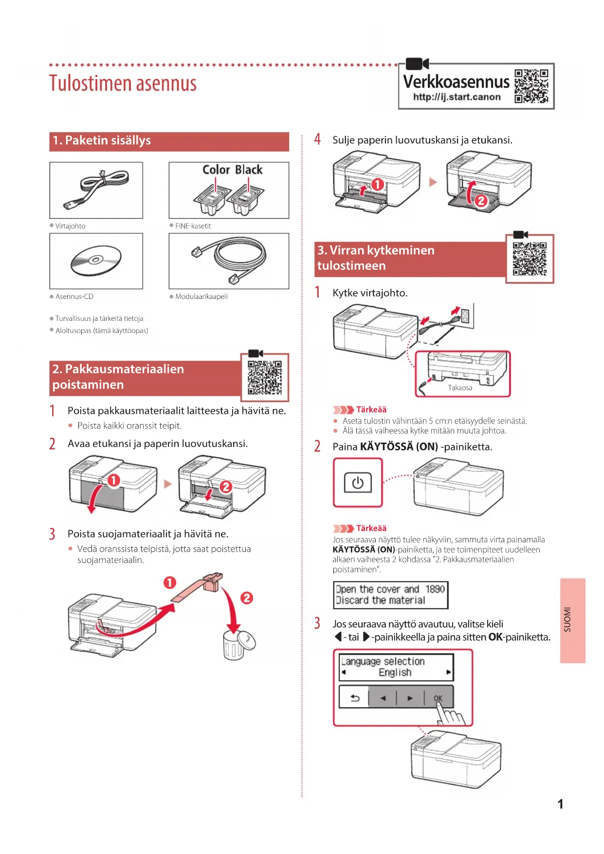 Kytke virtajohto. Takaosa Tärkeää Aseta tulostin vähintään 5 cm:n etäisyydelle seinästä. Älä tässä vaiheessa kytke mitään muuta johtoa. Paina KÄYTÖSSÄ (ON) -painiketta. TärkeääJos seuraava näyttö tulee näkyviin, sammuta virta painamalla KÄYTÖSSÄ (ON)-painiketta, ja tee toimenpiteet uudelleen alkaen vaiheesta 2 kohdassa "2. Pakkausmateriaalien poistaminen". Jos seuraava näyttö avautuu, valitse kieli [- tai ]-painikkeella ja paina sitten OK-painiketta. Tulostimen asennus Verkkoasennus2 Tulostimen asennus