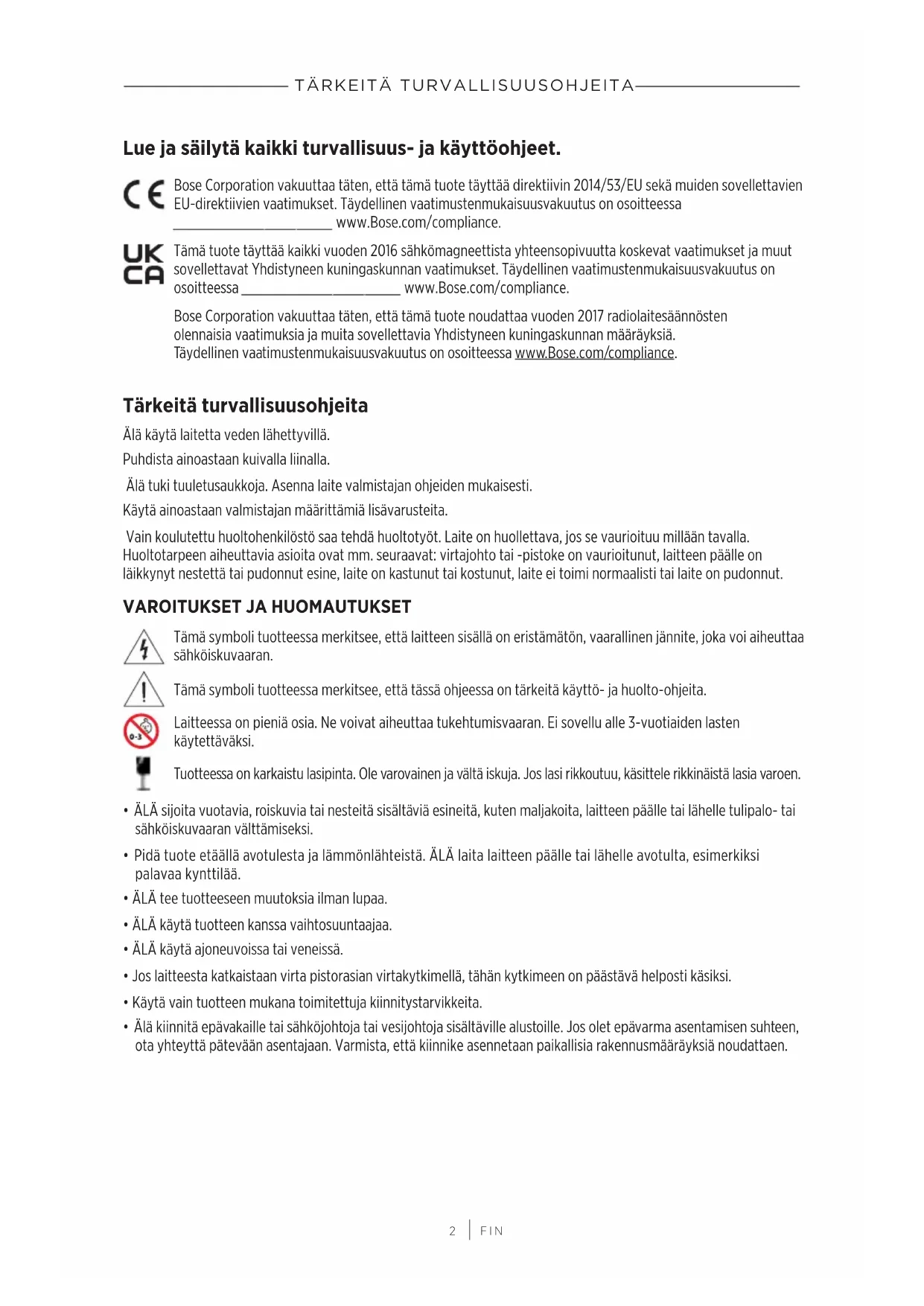 Lue ja säilytä kaikki turvallisuus- ja käyttöohjeet. Bose Corporation vakuuttaa täten, että tämä tuote täyttää direktiivin 2014/53/EU sekä muiden sovellettavien EU-direktiivien vaatimukset. Täydellinen vaatimustenmukaisuusvakuutus on osoitteessa www.Bose.com/compliancewww.Bose.com/compliance. Tämä tuote täyttää kaikki vuoden2016 sähkömagneettista yhteensopivuutta koskevat vaatimukset ja muut sovellettavat Yhdistyneen kuningaskunnan vaatimukset. Täydellinen vaatimustenmukaisuusvakuutus on osoitteessa www.Bose.com/compliancewww.Bose.com/compliance. Bose Corporation vakuuttaa täten, että tämä tuote noudattaa vuoden2017 radiolaitesäännösten olennaisia vaatimuksia ja muita sovellettavia Yhdistyneen kuningaskunnan määräyksiä. Täydellinenvaatimustenmukaisuusvakuutus on osoitteessa www.Bose.com/compliancewww.Bose.com/compliance. Tärkeitä turvallisuusohjeita Älä käytä laitetta veden lähettyvillä. Puhdista ainoastaan kuivalla liinalla. Älä tuki tuuletusaukkoja. Asenna laite valmistajan ohjeiden mukaisesti. Käytä ainoastaan valmistajan määrittämiä lisävarusteita. Vain koulutettu huoltohenkilöstö saa tehdä huoltotyöt. Laite on huollettava, jos se vaurioituu millään tavalla. Huoltotarpeen aiheuttavia asioita ovat mm. seuraavat: virtajohto tai -pistoke on vaurioitunut, laitteen päälle on läikkynyt nestettä tai pudonnut esine, laite on kastunut tai kostunut, laite ei toimi normaalisti tai laite on pudonnut.