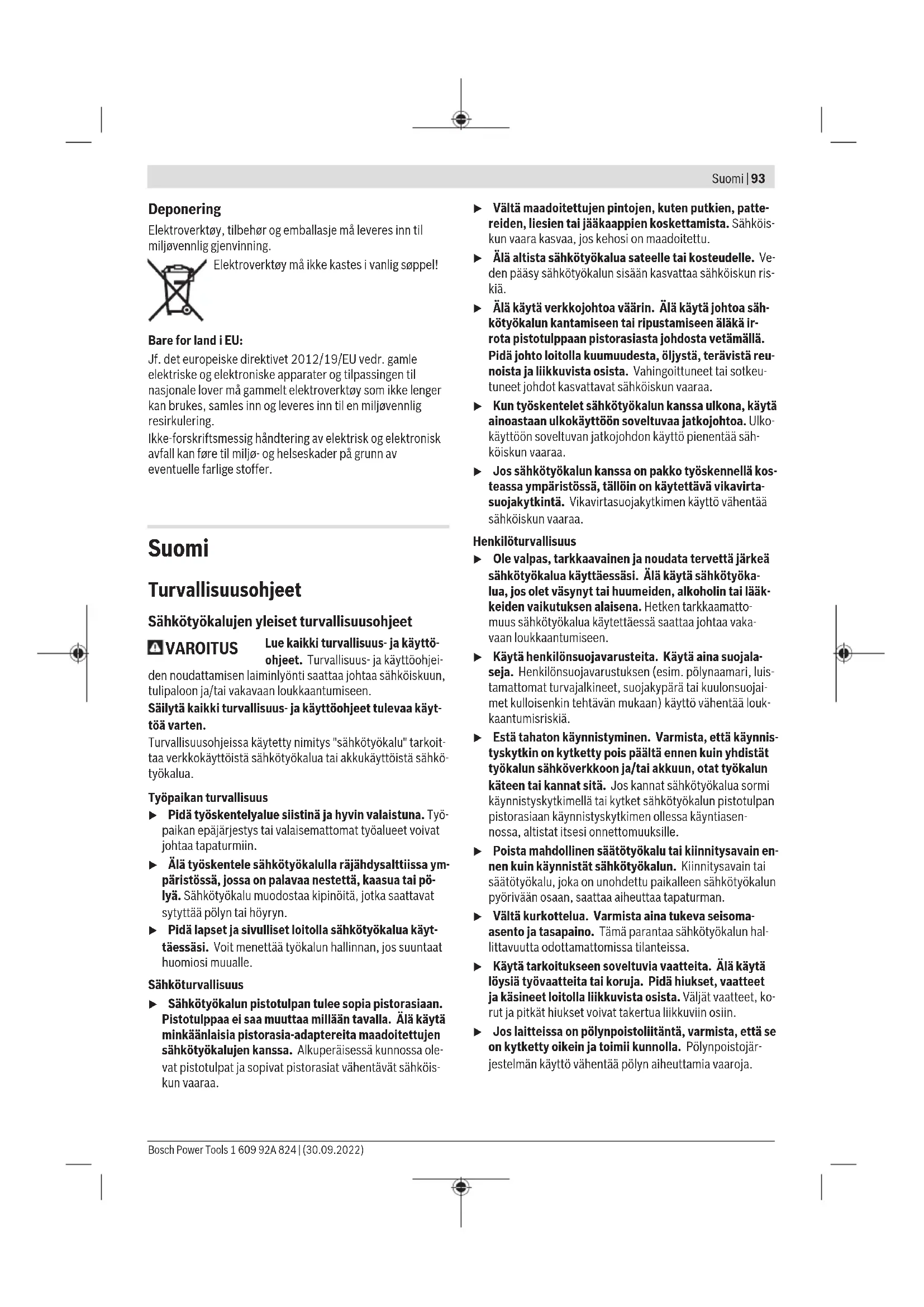 Näissä ohjeissa ilmoitettu tärinätaso on mitattu standardoi- dun mittausmenetelmän mukaisesti ja sitä voi käyttää sähkö- työkalujen keskinäiseen vertailuun. Se soveltuu myös tärinä- kuormituksen väliaikaiseen arviointiin. Ilmoitettu tärinätaso vastaa sähkötyökalun pääasiallisia käyt- tötapoja. Mikäli sähkötyökalua käytetään muunlaisissa töissä, erilaisilla käyttötarvikkeilla tai riittämättömästi huol- lettuna, tärinätaso saattaa poiketa ilmoitetusta arvosta. Tämä saattaa lisätä huomattavasti koko työskentelyjakson tärinäkuormitusta. Tärinäkuormituksen tarkaksi arvioimiseksi tulee huomioida myös ne ajat, jolloin laite on sammutettuna tai tyhjäkäynnillä. Tämä voi pienentää huomattavasti koko työskentelyjakson tärinäkuormitusta. Määrittele tarvittavat lisävarotoimenpiteet käyttäjän suojele- miseksi tärinän aiheuttamilta haitoilta (esimerkiksi sähkötyö- kalujen ja käyttötarvikkeiden huolto, käsien pitäminen lämpi- minä ja työprosessien organisointi). Asennus Suojusten asentaminen u Irrota pistotulppa pistorasiasta ennen kaikkia sähkö- työkaluun kohdistuvia töitä. Huomautus: Jos hiomalaikka on murtunut käytön aikana tai suojuksen/sähkötyökalun kiinnittimet ovat vioittuneet, säh- kötyökalu on lähetettävä välittömästi huoltopisteeseen kor- jausta varten, katso lisätiedot kappaleesta "Asiakaspalvelu ja käyttöneuvonta". Bosch Power Tools 1 609 92A 824 | (30.09.2022)98 | Suomi Hiontatöiden suojus Asenna suojus (6) karakaulan päälle. Säädä suojuksen (6) asento suoritettavan työn mukaan ja lukitse suojus (6) luki- tusruuvin (7) avulla. u Säädä suojus (6)niin, ettei kipinäsuihku kohdistu käyttäjän suuntaan. Katkaisutöiden suojus u Käytä hiontakatkaisulaikoilla tehtävissä katkaisu- töissä aina katkaisutöiden suojusta (14). u Käytä riittävän tehokasta pölynpoistoa, kun teet kivi- materiaalien katkaisutöitä. Katkaisutöiden suojus (14) asennetaan samalla tavalla kuin hiontatöiden suojus (6). Ohjaustuen avulla tehtävän katkaisutyön imusuojus Noudata imusuojuksen käyttöohjeita, kun asennat ohjaus- tuen avulla tehtävän katkaisutyön imusuojuksen(23). Lisäkahva u Käytä sähkötyökalua vain lisäkahvan (3) kanssa. Asenna lisäkahva (3) työskentelyasentosi mukaan vaihteis- ton pään oikealle tai vasemmalle puolelle. Käsisuojus u Asenna kumisen hiomalautasen (18) tai kuppiharjan/ laikkaharjan/lamellilaikan käyttöä varten aina käsi- suojus (16). Kiinnitä käsisuojus (16) lisäkahvan (3) kanssa. Hiomatarvikkeiden asennus u Irrota pistotulppa pistorasiasta ennen kaikkia sähkö- työkaluun kohdistuvia töitä. u Älä koske hioma- tai katkaisulaikkoihin, ennen kuin ne ovat jäähtyneet. Laikat kuumentuvat voimakkaasti käy- tön aikana. Puhdista hiomakara (5) ja kaikki asennettavat osat. Paina hiomatarvikkeen kiinnittämistä ja irrottamista varten karan lukituspainiketta (1), jotta saat lukittua hiomakaran paikalleen. u Älä paina karan lukituspainiketta ennen kuin hioma- kara on pysähtynyt. Muussa tapauksessa sähkötyökalu saattaa vaurioitua. Hioma-/katkaisulaikka Huomioi hiomatarvikkeiden mitat. Reiän halkaisijan täytyy sopia kiinnityslaippaan. Älä käytä adaptereita tai supistus- kappaleita. Jos käytät timanttikatkaisulaikkoja, varmista, että timantti- katkaisulaikkaan merkitty kiertosuuntanuoli ja sähkötyöka- lun pyörimissuunta (katso vaihteiston päässä oleva kierto- suuntanuoli) vastaavat toisiaan. Asennusjärjestys on esitetty kuvasivulla. Kun haluat kiinnittää hioma-/katkaisulaikan, ruuvaa kiinnitysmutteri(10) paikalleen ja kiristä se laikka-avaimella (katso "Pikakiinnitysmutteri ", Sivu98). u Asennettuasi hiomatarvikkeen tarkista ennen käyn- nistystä, että hiomatarvike on kunnolla paikallaan ja että laikka voi pyöriä vapaasti. Varmista, ettei hioma- tarvike hankaa suojusta tai muita osia vasten. Kiinnityslaipan (8) keskitysreunan ympärille on asennettu muoviosa (O-rengas). Jos O-rengas puuttuu tai se on rikki, kiinnityslaippa (8) täytyy ehdottomasti vaihtaa ennen käytön jat- kamista. Lamellilaikka u Asenna lamellilaikan käyttöä varten aina käsisuojus (16). Kuminen hiomalautanen u Asenna kumisen hiomalautasen (18) käyttöä varten aina käsisuojus (16). Asennusjärjestys on esitetty kuvasivulla. Asenna ennen kumisen hiomalautasen (18) kiinnittämistä 2 välikelevyä (17) hiomakaraan (5). Ruuvaa rengasmutteri (20) paikalleen ja kiristä se laikka- avaimen avulla. Kuppiharja/laikkaharja u Asenna kuppiharjan tai laikkaharjan käyttöä varten aina käsisuojus (16). Asennusjärjestys on esitetty kuvasivulla. Kuppiharja/laikkaharja täytyy ruuvata kunnolla kiinni hioma- karan laipan kierteen loppuun asti. Kiristä kuppiharja/laikka- harja kiintoavaimen avulla. Pikakiinnitysmutteri Hiomatarvikkeen vaihdon helpottamiseksi voit käyttää kiinni- tysmutterin (10) sijasta pikakiinnitysmutteria (12), jonka voi irrottaa ja asentaa ilman työkaluja. u Pikakiinnitysmutteria(12) saa käyttää vain sellaisten hioma-, katkaisu- ja harjalaikkojen kiinnitykseen, joi- den reikän halkaisija on 22,2 mm. Käytä vain ehjää ja moitteettomassa kunnossa olevaa pi- kakiinnitysmutteria (12). Varmista kiinnityksen yhteydessä, ettei pikakiinnitys- mutterin (12) tekstipuoli ole hiomalaikkaan päin; nuolen täytyy osoittaa merkintään (24). (24) Paina karan lukituspaini- ketta (1), jotta saat lukittua hiomakaran paikalleen. Ki- ristä pikakiinnitysmutteri kääntämällä hiomalaikkaa voimakkaasti myötäpäi- vään. 1 609 92A 824 | (30.09.2022) Bosch Power ToolsSuomi | 99 Oikein kiinnitetty ja ehjä pi- kakiinnitysmutteri on mah- dollista avata käsin. Avaa mutteri kiertämällä pyället- tyä rengasta vastapäivään. Älä missään tapauksessa avaa kiinni juuttunutta pi- kakiinnitysmutteria pih- deillä, vaan käytä laikka- avainta. Aseta laikka-avain kiinnityskohtaan kuvan mu- kaisesti. Sallitut hiomatarvikkeet Voit käyttää kaikkia 