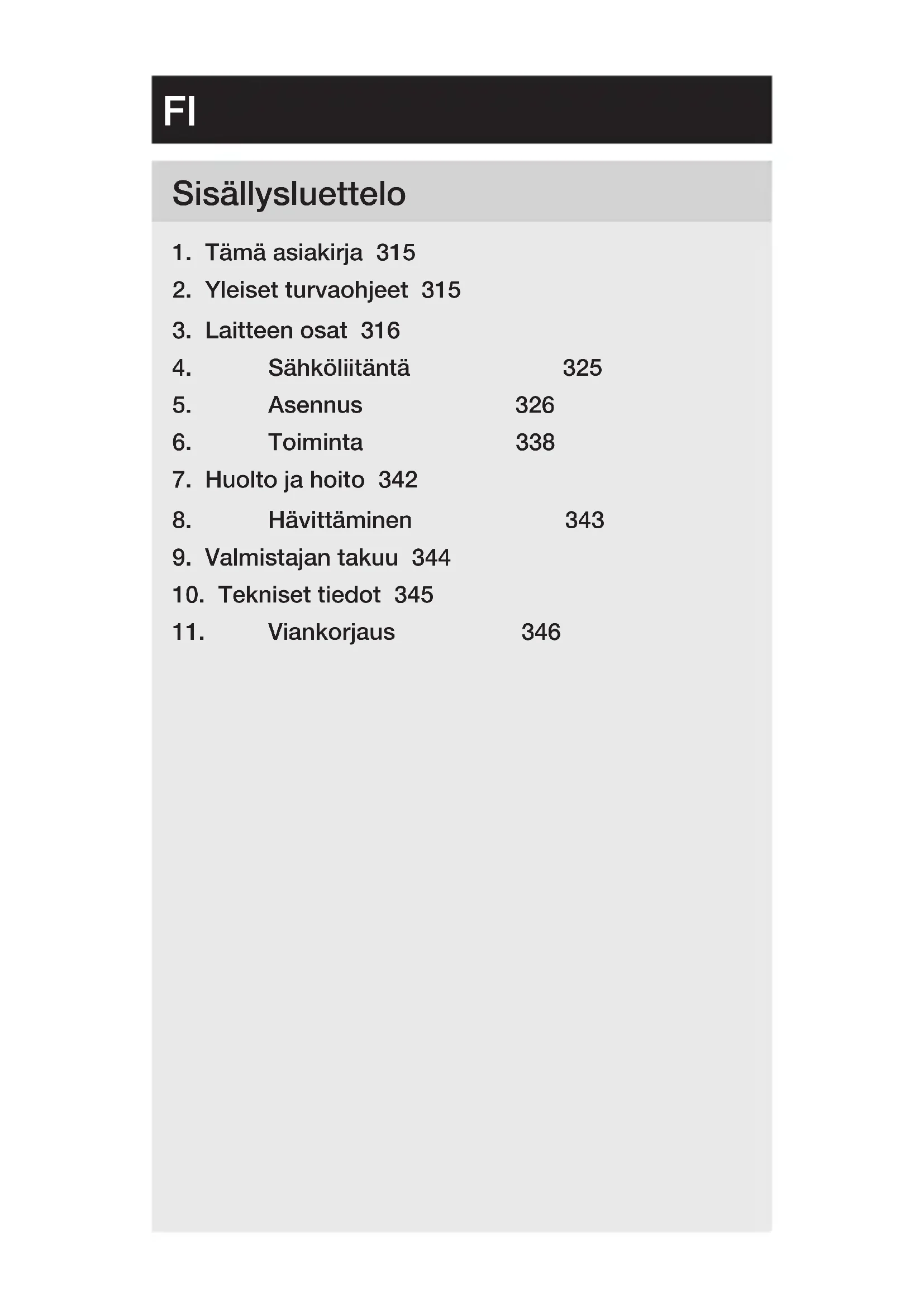 - Säilytä helposti saatavilla. – Sähkövirta voi johtaa vaarallisiin tilanteisiin. Sähköä johtavien osien koskettaminen voi johtaa sähköiskuun, palovammoihin tai kuolemaan. – Vain ammattitaitoinen henkilökunta saa tehdä verkkojän- nitettä koskevat työt. – Voimassa olevia maakohtaisia asennus- ja liitäntäohjeita on noudatettava. – Käytä ainoastaan alkuperäisiä varaosia. – Vain ammattiyritykset saavat tehdä korjauksia.– 316 – Sisällysluettelo