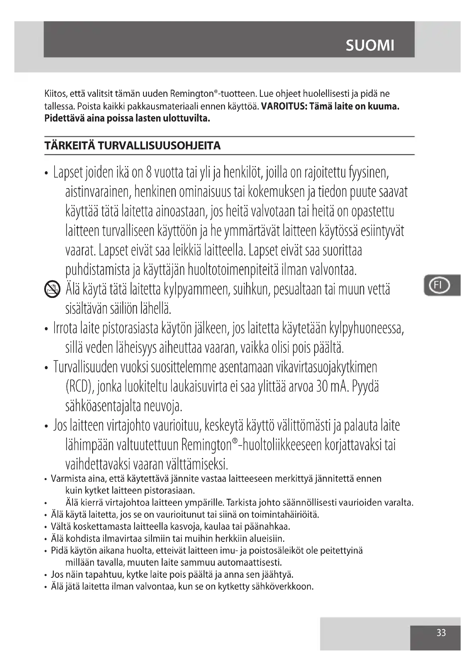 - Jos laitteen virtajohto vaurioituu, keskeytä käyttö välittömästi ja palauta laite lähimpään valtuutettuun Remington®-huoltoliikkeeseen korjattavaksi tai vaihdettavaksi vaaran välttämiseksi.
