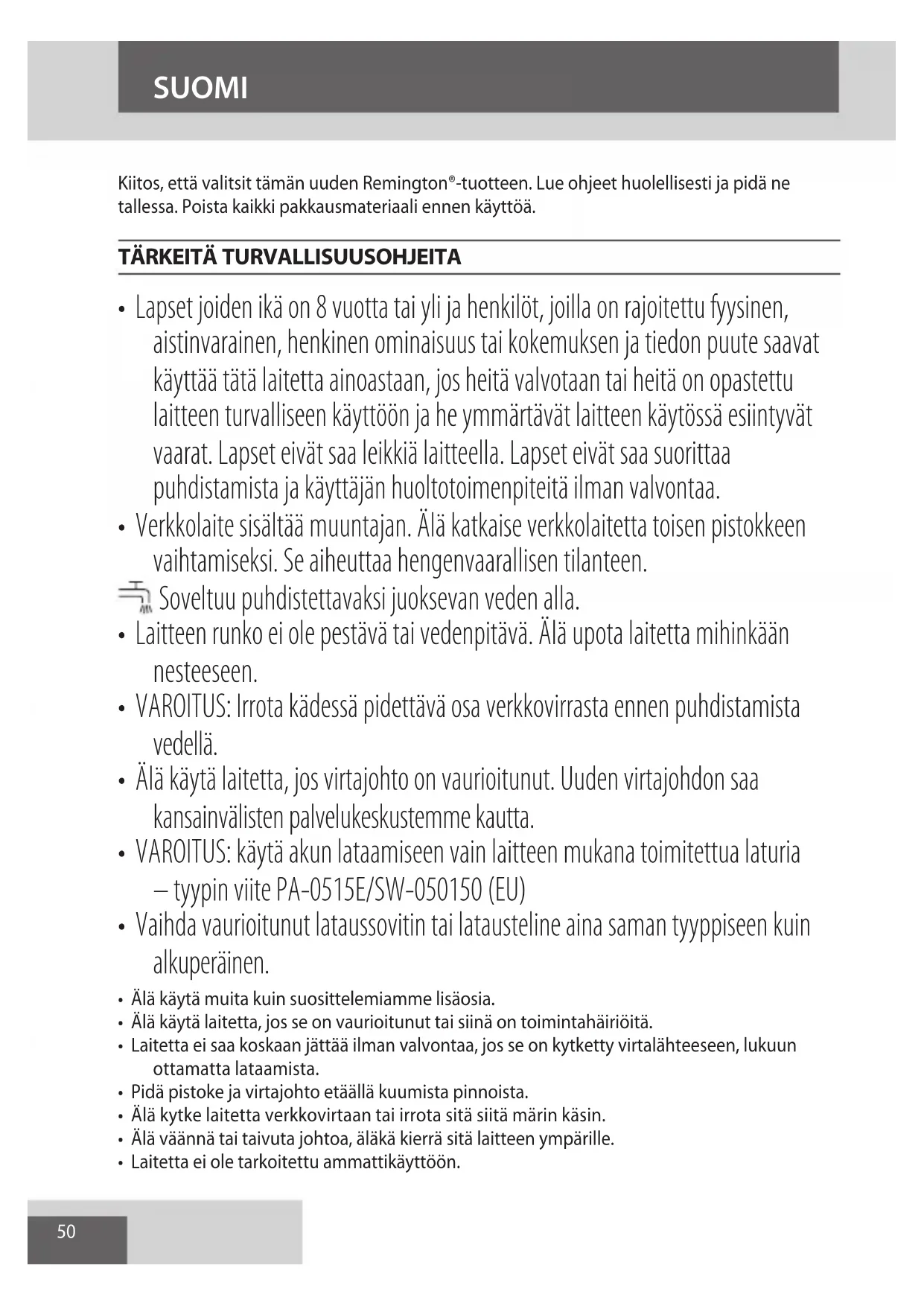 AE50 Kiitos, että valitsit tämän uuden Remington®-tuotteen. Lue ohjeet huolellisesti ja pidä ne tallessa. Poista kaikki pakkausmateriaali ennen käyttöä.