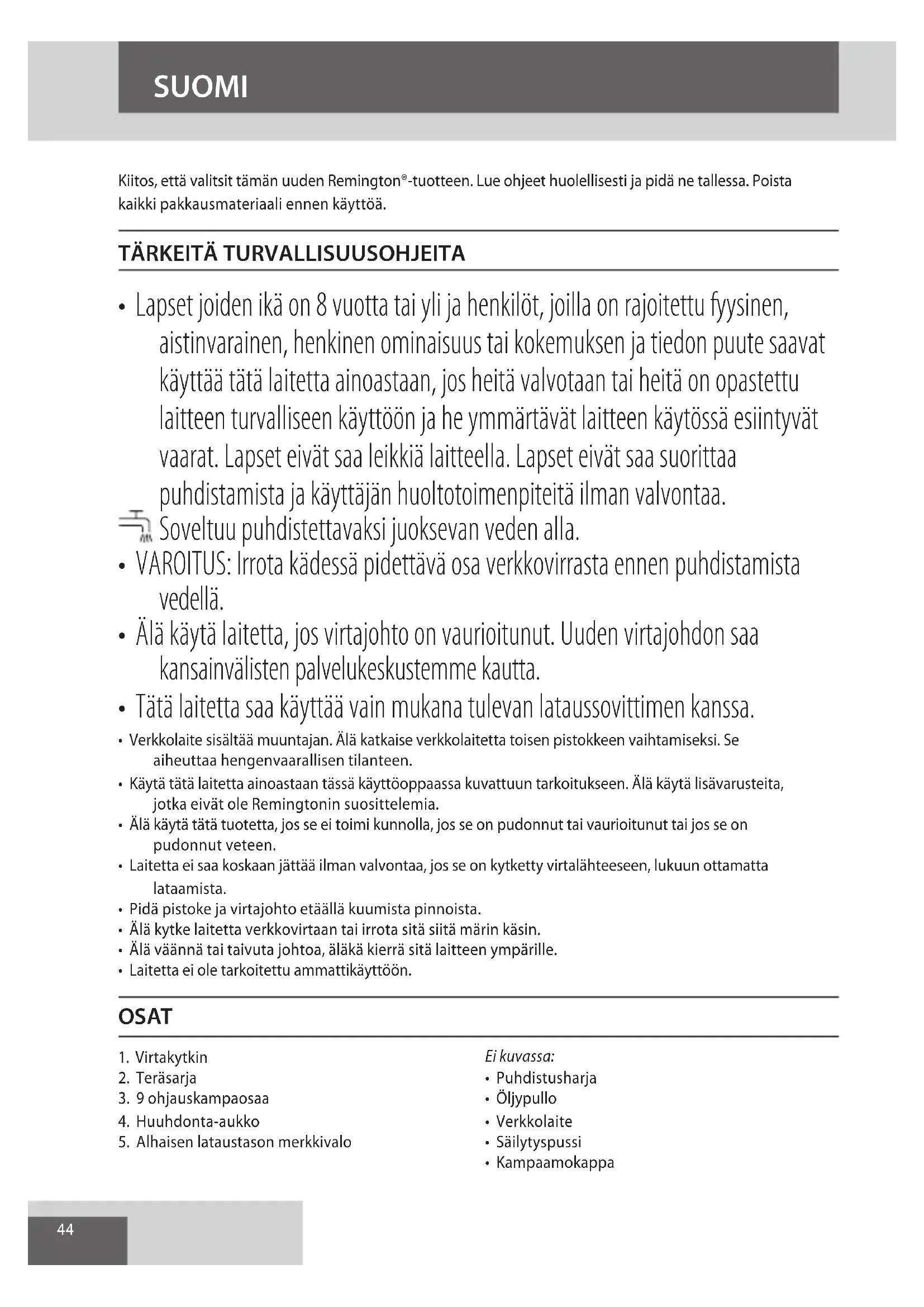 AE44 Kiitos, että valitsit tämän uuden Remington®-tuotteen. Lue ohjeet huolellisesti ja pidä ne tallessa. Poista kaikki pakkausmateriaali ennen käyttöä.