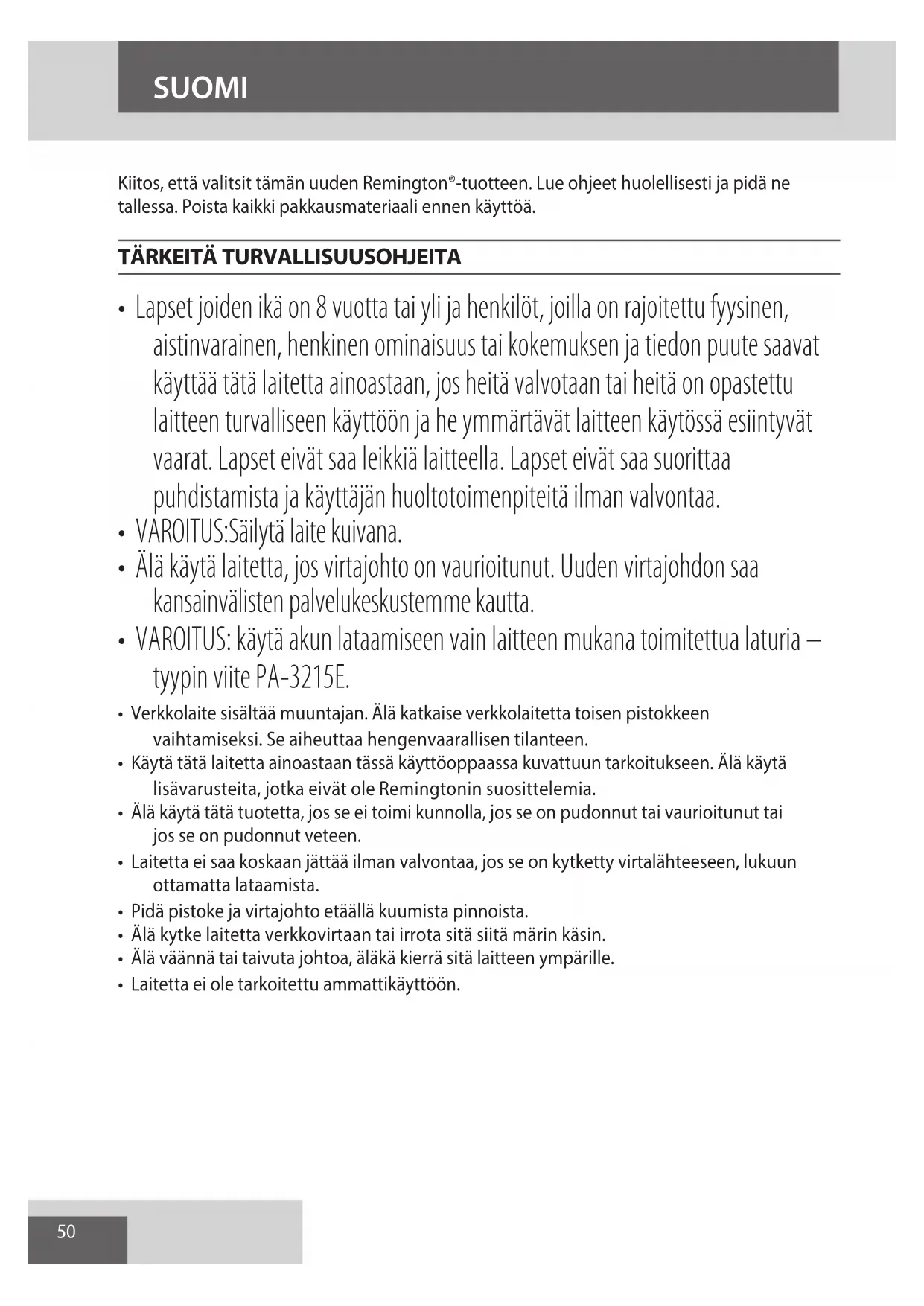 AE50 Kiitos, että valitsit tämän uuden Remington®-tuotteen. Lue ohjeet huolellisesti ja pidä ne tallessa. Poista kaikki pakkausmateriaali ennen käyttöä.
