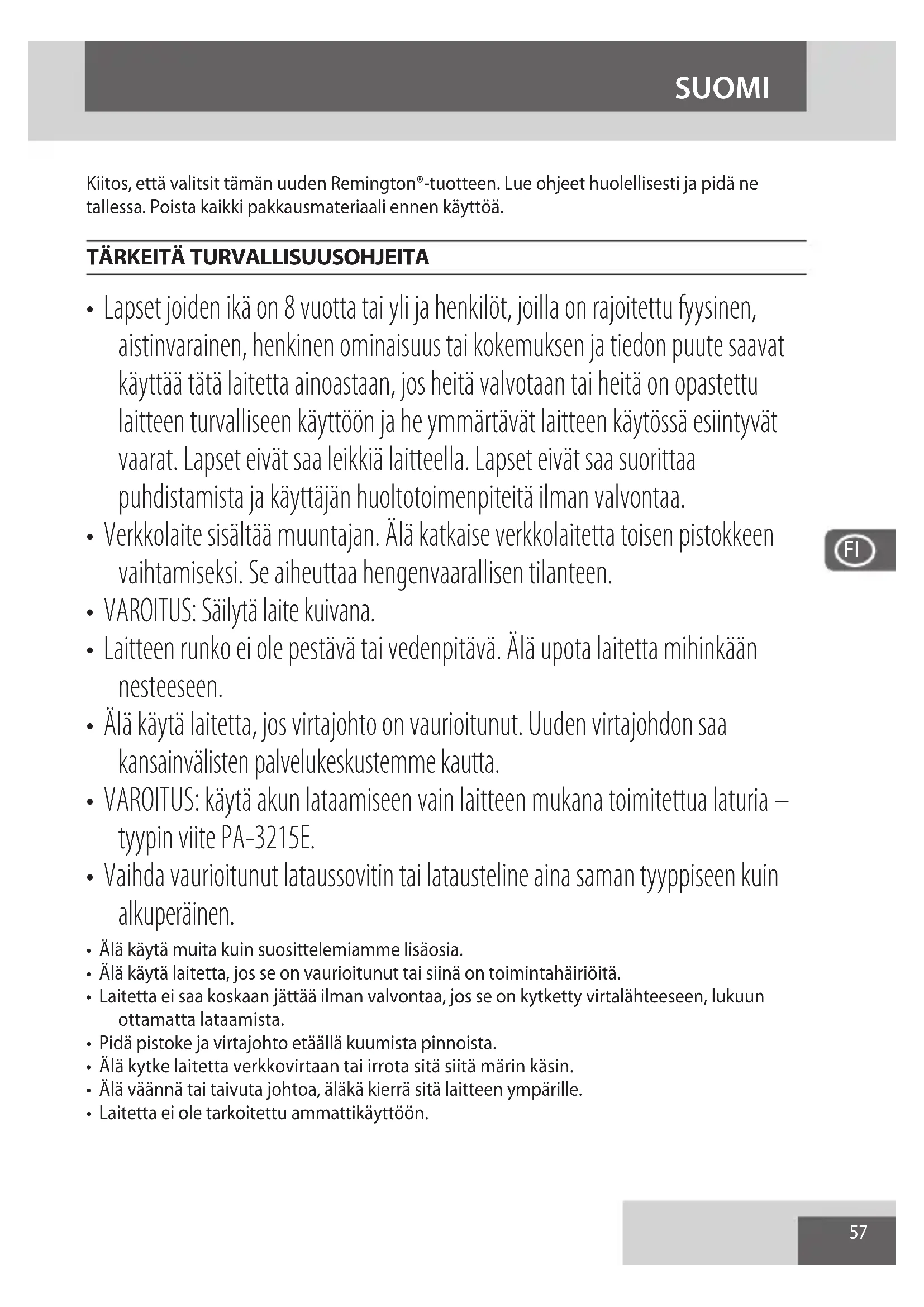 Utgangsstrøm 1.5 A Utgangseekt 4.8 W Gjennomsnittlig aktiv eektivitet ≥73.31% Eektivitet på 10% - Ingen belastning strømforbruk ≤0.1W57 SUOMI Kiitos, että valitsit tämän uuden Remington®-tuotteen. Lue ohjeet huolellisesti ja pidä ne tallessa. Poista kaikki pakkausmateriaali ennen käyttöä.