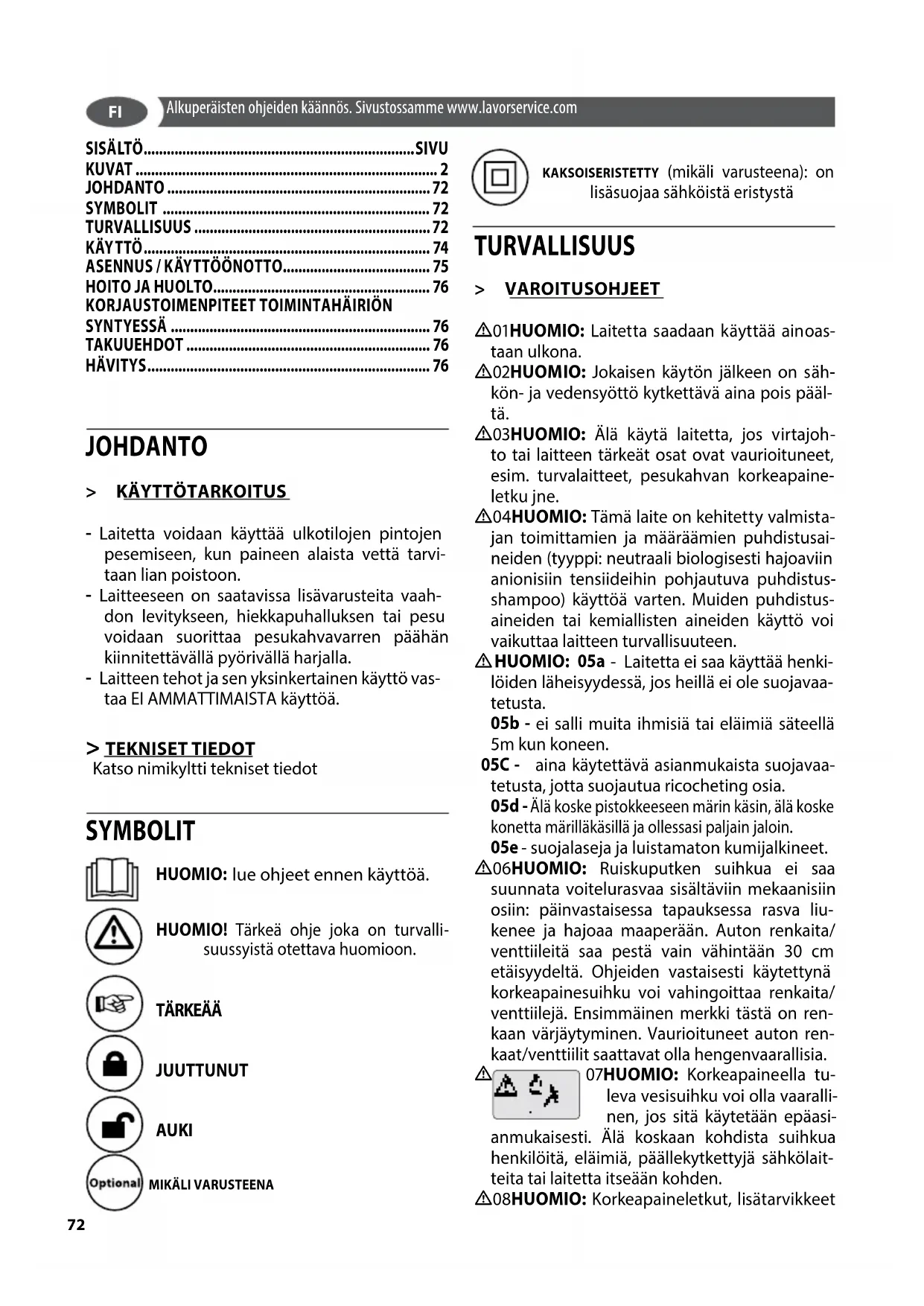 03HUOMIO: Älä käytä laitetta, jos virtajoh- to tai laitteen tärkeät osat ovat vaurioituneet, esim. turvalaitteet, pesukahvan korkeapaine- letku jne.
