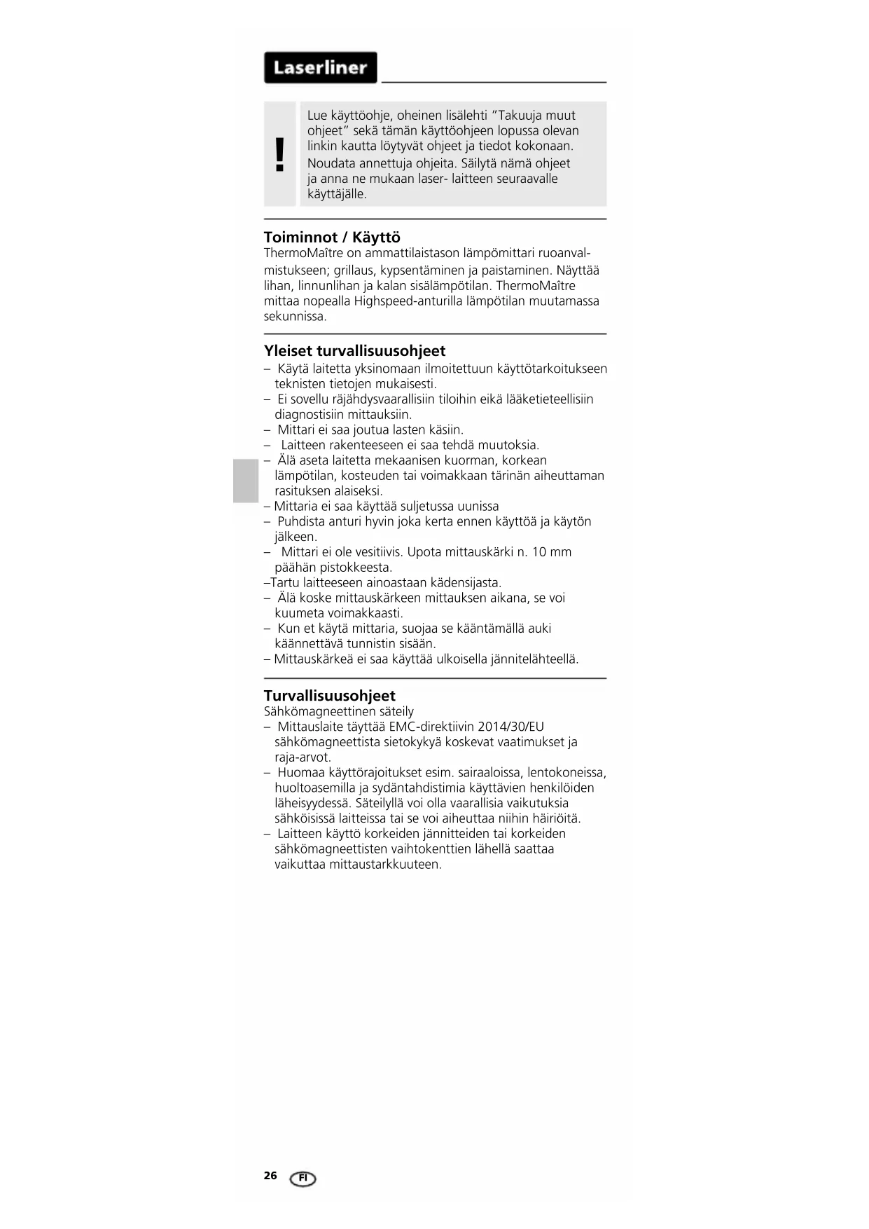 Toiminnot / Käyttö ThermoMaître on ammattilaistason lämpömittari ruoanval- mistukseen; grillaus, kypsentäminen ja paistaminen. Näyttää lihan, linnunlihan ja kalan sisälämpötilan. ThermoMaître mittaa nopealla Highspeed-anturilla lämpötilan muutamassa sekunnissa. Yleiset turvallisuusohjeet – Käytä laitetta yksinomaan ilmoitettuun käyttötarkoitukseen teknisten tietojen mukaisesti. – Ei sovellu räjähdysvaarallisiin tiloihin eikä lääketieteellisiin diagnostisiin mittauksiin. – Mittari ei saa joutua lasten käsiin. – Laitteen rakenteeseen ei saa tehdä muutoksia. – Älä aseta laitetta mekaanisen kuorman, korkean lämpötilan, kosteuden tai voimakkaan tärinän aiheuttaman rasituksen alaiseksi. – Mittaria ei saa käyttää suljetussa uunissa – Puhdista anturi hyvin joka kerta ennen käyttöä ja käytön jälkeen. – Mittari ei ole vesitiivis. Upota mittauskärki n. 10 mm päähän pistokkeesta. – Tartu laitteeseen ainoastaan kädensijasta. – Älä koske mittauskärkeen mittauksen aikana, se voi kuumeta voimakkaasti. – Kun et käytä mittaria, suojaa se kääntämällä auki käännettävä tunnistin sisään. – Mittauskärkeä ei saa käyttää ulkoisella jännitelähteellä. Turvallisuusohjeet Sähkömagneettinen säteily – Mittauslaite täyttää EMC-direktiivin 2014/30/EU sähkömagneettista sietokykyä koskevat vaatimukset ja raja-arvot. – Huomaa käyttörajoitukset esim. sairaaloissa, lentokoneissa, huoltoasemilla ja sydäntahdistimia käyttävien henkilöiden läheisyydessä. Säteilyllä voi olla vaarallisia vaikutuksia sähköisissä laitteissa tai se voi aiheuttaa niihin häiriöitä. – Laitteen käyttö korkeiden jännitteiden tai korkeiden sähkömagneettisten vaihtokenttien lähellä saattaa vaikuttaa mittaustarkkuuteen. FIThermoMaître