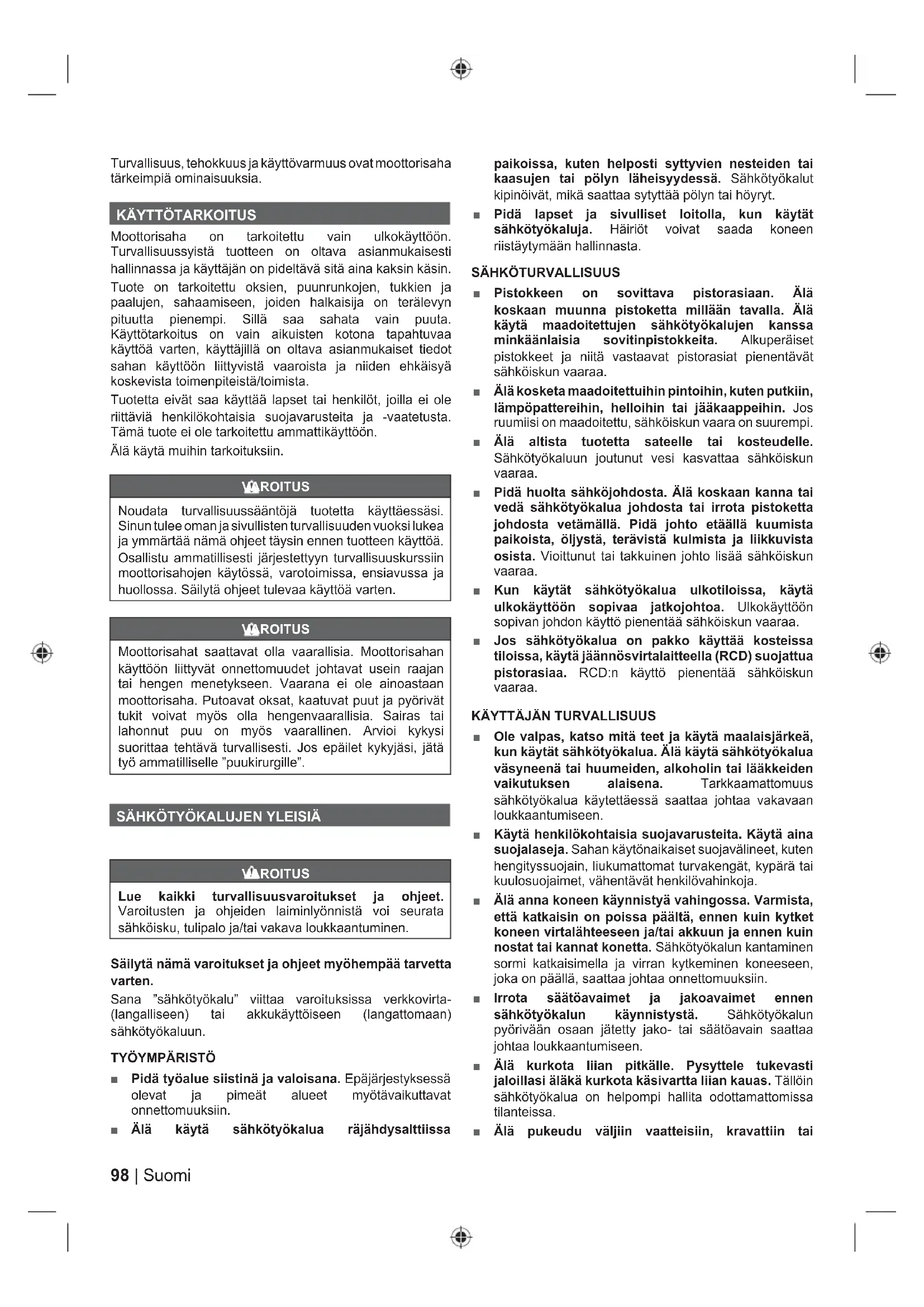 Moottorisaha on tarkoitettu vain ulkokäyttöön. Turvallisuussyistä tuotteen on oltava asianmukaisesti hallinnassa ja käyttäjän on pideltävä sitä aina kaksin käsin. Tuote on tarkoitettu oksien, puunrunkojen, tukkien ja paalujen, sahaamiseen, joiden halkaisija on terälevyn pituutta pienempi. Sillä saa sahata vain puuta. Käyttötarkoitus on vain aikuisten kotona tapahtuvaa käyttöä varten, käyttäjillä on oltava asianmukaiset tiedot sahan käyttöön liittyvistä vaaroista ja niiden ehkäisyä koskevista toimenpiteistä/toimista. Tuotetta eivät saa käyttää lapset tai henkilöt, joilla ei ole riittäviä henkilökohtaisia suojavarusteita ja -vaatetusta. Tämä tuote ei ole tarkoitettu ammattikäyttöön. Älä käytä muihin tarkoituksiin. VAROITUS Noudata turvallisuussääntöjä tuotetta käyttäessäsi. Sinun tulee oman ja sivullisten turvallisuuden vuoksi lukea ja ymmärtää nämä ohjeet täysin ennen tuotteen käyttöä. Osallistu ammatillisesti järjestettyyn turvallisuuskurssiin moottorisahojen käytössä, varotoimissa, ensiavussa ja huollossa. Säilytä ohjeet tulevaa käyttöä varten. VAROITUS Moottorisahat saattavat olla vaarallisia. Moottorisahan käyttöön liittyvät onnettomuudet johtavat usein raajan tai hengen menetykseen. Vaarana ei ole ainoastaan moottorisaha. Putoavat oksat, kaatuvat puut ja pyörivät tukit voivat myös olla hengenvaarallisia. Sairas tai lahonnut puu on myös vaarallinen. Arvioi kykysi suorittaa tehtävä turvallisesti. Jos epäilet kykyjäsi, jätä työ ammatilliselle ”puukirurgille”.