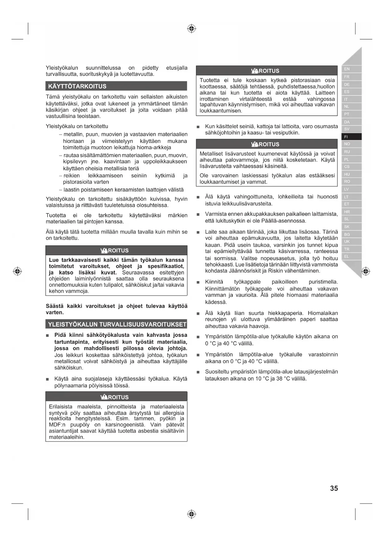 Tämä yleistyökalu on tarkoitettu vain sellaisten aikuisten käytettäväksi, jotka ovat lukeneet ja ymmärtäneet tämän käsikirjan ohjeet ja varoitukset ja joita voidaan pitää vastuullisina teoistaan. Yleistyökalu on tarkoitettu – metallin, puun, muovien ja vastaavien materiaalien hiontaan ja viimeistelyyn käyttäen mukana toimitettuja muotoon leikattuja hioma-arkkeja – rautaa sisältämättömien materiaalien, puun, muovin, kipsilevyn jne. kaavintaan ja uppoleikkaukseen käyttäen oheisia metallisia teriä – reikien leikkaamiseen seiniin kytkimiä ja pistorasioita varten – laastin poistamiseen keraamisten laattojen välistä Yleistyökalu on tarkoitettu sisäkäyttöön kuivissa, hyvin valaistuissa ja riittävästi tuuletetuissa olosuhteissa. Tuotetta ei ole tarkoitettu käytettäväksi märkien materiaalien tai pintojen kanssa. Älä käytä tätä tuotetta millään muulla tavalla kuin mihin se on tarkoitettu. VAROITUS Lue tarkkaavaisesti kaikki tämän työkalun kanssa toimitetut varoitukset, ohjeet ja spesifikaatiot, ja katso lisäksi kuvat. Seuraavassa esitettyjen ohjeiden laiminlyönnistä saattaa olla seurauksena onnettomuuksia kuten tulipalot, sähköiskut ja/tai vakavia kehon vammoja. Säästä kaikki varoitukset ja ohjeet tulevaa käyttöä varten.