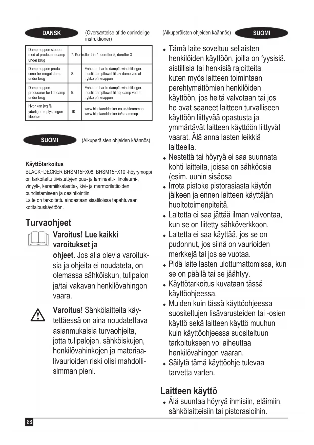 uPaina työtason pienen lattiapään vapautuspainiketta (10a) ja vedä se irti käsin pidettävästä höyrytysyksiköstä (3). Varoitus! Anna laitteen ja kaikkien lisävarusteiden jäähtyä ennen niiden irrottamista. Vinkkejä optimaaliseen käyttöön Yleistä Huomio: Älä koskaan käytä höyrymoppia ilman puhdistuslevyä. uImuroi tai lakaise lattia aina ennen höyrymopin käyttöä. uHelpoin tapa käyttää laitetta on kallistaa yksikkö 45 asteen kulmaan ja puhdistaa hitaasti pieni alue kerrallaan. uKäytä höyrymopissa ainoastaan vettä. Älä käytä lisäaineita tai kemikaaleja. Vinyyli- tai linoleumilattioilla olevat pinttyneet tahrat voidaan poistaa käsittelemällä ne miedolla puhdistusaineella ja vedellä ennen höyrymopin käyttöä. Höyrypuhdistus mopin avulla uKiinnitä käsin pidettävä höyrypuhdistuslaite lattiapidennykseen (7). uAseta puhdistuslevy (18) lattialle niin, että tarranauhapuoli on ylöspäin. uPaina höyrymoppi kevyesti puhdistuslevyn (18) päälle. uKytke höyrymoppi verkkovirtaan. uPaina virtakytkintä (1). Kuumavesisäiliö lämpenee noin 30 sekunnissa. Huomautus! Höyryn muodostuminen voi kestää 45 sekuntia ensimmäisen täytön tai kuivakäytön jälkeen. uKun kuumavesisäiliö on saavuttanut oikean lämpötilan, paina vaadittua höyryasetuksen painiketta höyryvirtauksen aloittamiseksi uKestää muutaman sekunnin, ennen kuin höyry pääsee puhdistuslevyyn. Höyrymoppi liukuu nyt kevyesti puhdistettavan tai desinoitavan pinnan yli. uPuhdista pinta perusteellisesti liikuttamalla höyrymoppia hitaasti työntämällä ja vetämällä. uPaina höyryvirtauksen painiketta virtauksen lopettamiseksi ja aseta takaisin pystyasentoon höyrymopin käytön jälkeen varmistaen, että se on tuettuna. Katkaise sitten laitteen virta. Odota, kunnes höyrymoppi on jäähtynyt (n. 5 minuuttia). Huomio! On tärkeää valvoa vesisäiliössä olevan veden määrää. Jos haluat täyttää vesisäiliön ja jatkaa puhdistamista tai desinointia, aseta moppi tukevasti pystyasentoon ja katkaise höyrymopin virta. Irrota laite pistorasiasta ja täytä vesisäiliö. Huomio! Älä jätä höyrymoppia pidemmäksi ajaksi yhteen paikkaan. Aseta höyrymoppi tukevasti pystyasentoon. Varmista, että höyrymopin virta on katkaistu, kun laite ei ole käytössä. Käytön jälkeen uOdota, kunnes höyrymoppi on jäähtynyt. uIrrota höyrymoppi pistorasiasta. uTyhjennä vesisäiliö. uPoista puhdistuslevy (18) ja pese se valmiiksi seuraavaa käyttökertaa varten (noudata puhdistuslevyyn painettuja pesuohjeita). Höyrypuhdistus työtason pienellä moppipäällä uAsenna käsin pidettävä höyrytysyksikkö työtason moppiin (10) uAseta puhdistuslevy (18a) työtasolle niin, että tarranauhapuoli on ylöspäin uPaina työtason lattiapää kevyesti puhdistuslevyn (18a) päälle uKytke käsin pidettävä höyrymoppi pistorasiaan uPaina virtakytkintä (1). Kuumavesisäiliö lämpenee noin 30 sekunnissa uKun kuumavesisäiliö on saavuttanut oikean lämpötilan, paina vaadittua höyryasetuksen painiketta höyryvirtauksen aloittamiseksi uKestää muutaman sekunnin, ennen kuin höyry pääsee puhdistuslevyyn. Höyrymoppi liukuu nyt helposti puhdistettavalla pinnalla.95 (Alkuperäisten ohjeiden käännös) SUOMI uPaina höyryvirtauksen painiketta virtauksen lopettamiseksi ja aseta takaisin pystyasentoon höyrymopin käytön jälkeen varmistaen, että se on tuettuna. Katkaise sitten laitteen virta. Odota, kunnes höyrymoppi on jäähtynyt (n. 5 minuuttia). Lisävarusteet Laitteen suorituskyky riippuu käytetystä lisävarusteesta. Korkealaatuiset BLACK+DECKER-lisävarusteet on suunniteltu parantamaan laitteen suorituskykyä. Käyttämällä näitä lisävarusteita saat laitteestasi parhaan hyödyn. Tekstiilien höyrystäminen (kuva H) (saatavilla malliin BHSM15FX10) uKiinnitä tarvittava lisävaruste (15). uKiinnitä tarvittava levy (15a). Huomautus! Tekstiilipäätä (15) ei saa käyttää ilman levyä (15a). uKytke käsin pidettävä höyrypuhdistuslaite pistorasiaan. uPaina virtakytkintä (1). Kuumavesisäiliö lämpenee noin 30 sekunnissa. Huomautus! Höyryn muodostuminen voi kestää 45 sekuntia ensimmäisen täytön tai kuivakäytön jälkeen. uKun kuumavesisäiliö on saavuttanut oikean lämpötilan, paina vaadittua höyryasetuksen painiketta höyryvirtauksen aloittamiseksi. uPaina höyryvirtauksen painiketta virtauksen lopettamiseksi ja aseta takaisin pystyasentoon höyrymopin käytön jälkeen varmistaen, että se on tuettuna. Katkaise sitten laitteen virta. Odota, kunnes höyrymoppi on jäähtynyt (n. 5 minuuttia). Pylvään säilytyskotelo (kuva I) (saatavilla malliin BHSM15FX10) Laitteessa on pylvään säilytyskotelo (17). uKiinnitä pylvään säilytyskotelo (17) lattiapidennyksen tankoon (7). uSovitinta (9) voidaan säilyttää pylvään säilytyskotelon yläosassa olevassa aukossa kuvan I mukaisesti. uPylvään säilytyskotelon (17) pohjaulokkeessa voidaan säilyttää yksittäisiä lisälaitteita (11), (12), (13), (14) tai (15). Seinän säilytyskotelo (kuva J) (saatavilla malliin BHSM15FX10) Laitteessa on seinän säilytyskotelo (16). Säilytysyksikkö sisältää 3 osaa: uSeinään ruuvattava seinäkannatin (16a). uKaapelia voidaan säilyttää siististi seinäkannattimeen kiinnitettävässä säilytyskoukussa (16b). uKannellinen säilytyskotelo (16c). Liukuu paikoilleen seinäkannattimeen kiskojärjestelmän avulla. Tässä voidaan säilyttää kaikkia lisävarusteita, joita ei säilytetä pylvään säilytyskotelossa. Tekniset tiedot