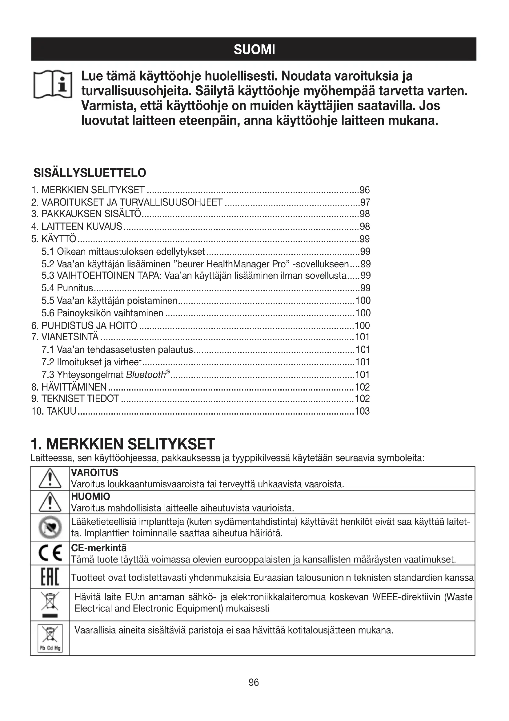 Laitteessa, sen käyttöohjeessa, pakkauksessa ja tyyppikilvessä käytetään seuraavia symboleita: VAROITUS Varoitus loukkaantumisvaaroista tai terveyttä uhkaavista vaaroista. HUOMIO Varoitus mahdollisista laitteelle aiheutuvista vaurioista. Lääketieteellisiä implantteja (kuten sydämentahdistinta) käyttävät henkilöt eivät saa käyttää laitet- ta. Implanttien toiminnalle saattaa aiheutua häiriötä. CE-merkintä Tämä tuote täyttää voimassa olevien eurooppalaisten ja kansallisten määräysten vaatimukset. Tuotteet ovat todistettavasti yhdenmukaisia Euraasian talousunionin teknisten standardien kanssa Hävitä laite EU:n antaman sähkö- ja elektroniikkalaiteromua koskevan WEEE-direktiivin (Waste Electrical and Electronic Equipment) mukaisesti Vaarallisia aineita sisältäviä paristoja ei saa hävittää kotitalousjätteen mukana.97 Ison-Britannian vaatimustenmukaisuuden arviointimerkintä Valmistaja Irrota pakkauksen osat ja hävitä paikallisten määräysten mukaisesti. Irrota pakkauksen osat tuot- teesta ja hävitä paikallisten määräysten mukaisesti.