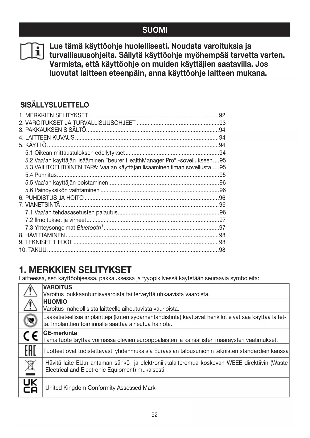 Laitteessa, sen käyttöohjeessa, pakkauksessa ja tyyppikilvessä käytetään seuraavia symboleita: VAROITUS Varoitus loukkaantumisvaaroista tai terveyttä uhkaavista vaaroista. HUOMIO Varoitus mahdollisista laitteelle aiheutuvista vaurioista. Lääketieteellisiä implantteja (kuten sydämentahdistinta) käyttävät henkilöt eivät saa käyttää laitet- ta. Implanttien toiminnalle saattaa aiheutua häiriötä. CE-merkintä Tämä tuote täyttää voimassa olevien eurooppalaisten ja kansallisten määräysten vaatimukset. Tuotteet ovat todistettavasti yhdenmukaisia Euraasian talousunionin teknisten standardien kanssa Hävitä laite EU:n antaman sähkö- ja elektroniikkalaiteromua koskevan WEEE-direktiivin (Waste Electrical and Electronic Equipment) mukaisesti United Kingdom Conformity Assessed Mark93 Valmistaja