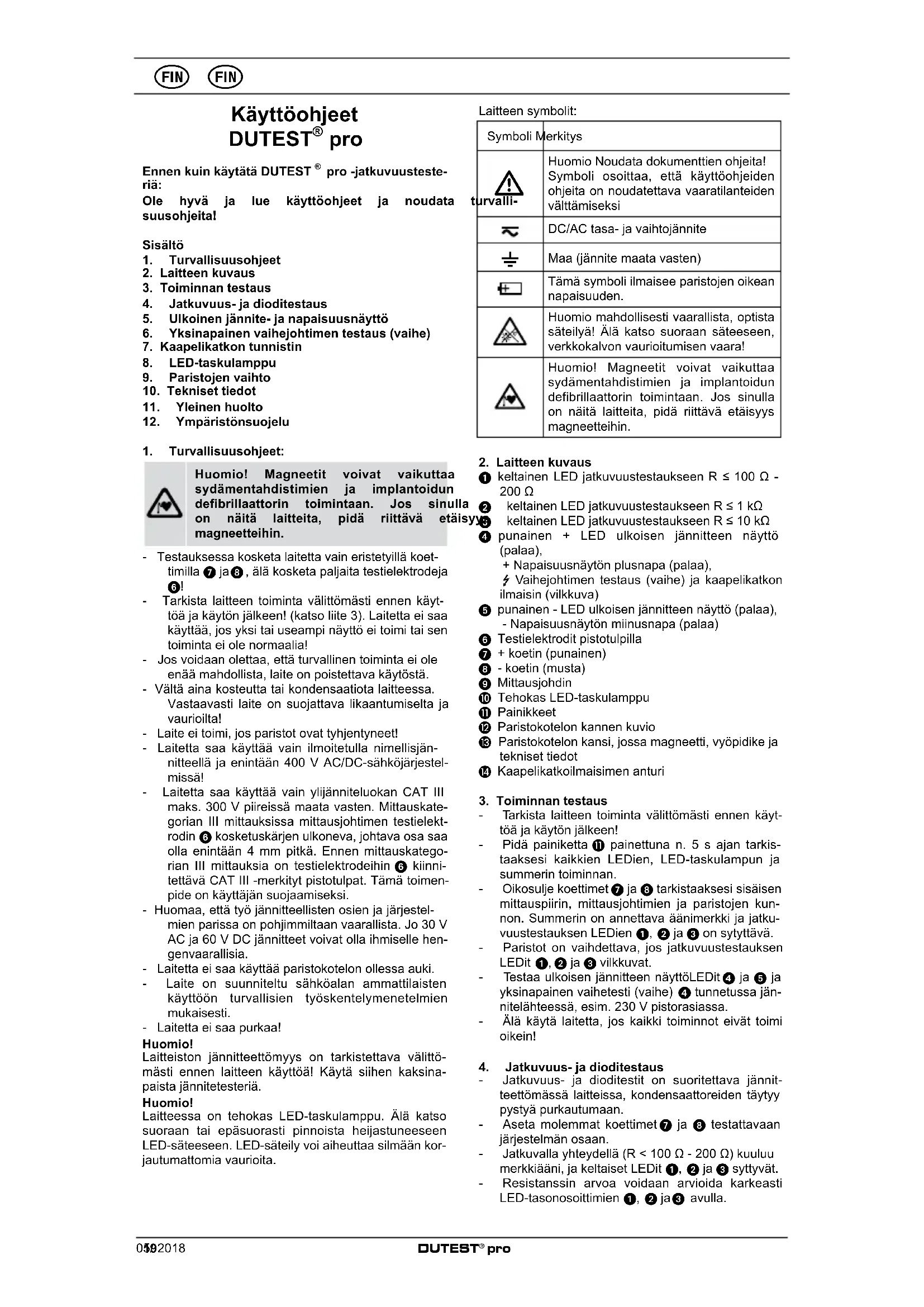 Ole hyvä ja toimita käytetyt paristot ja laite se käyttöiän lopussa käytössä oleviin palautus- ja kierrätysjärjestelmiin.05/ 2018 DUTEST
