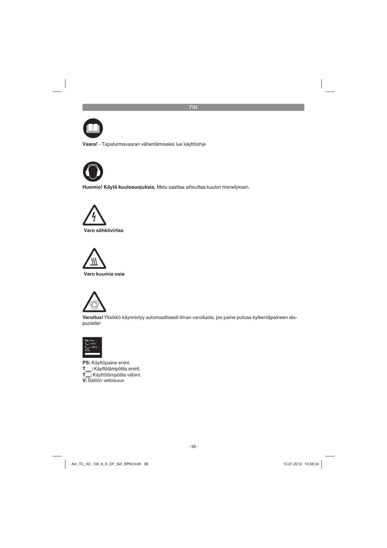 Vaara! Irroita verkkopistoke ennen kaikkia puhdis- tus- ja huoltotoimia. Varoitus! Odota, kunnes tiivistin on jäähtynyt täysin! Palovamman vaara! Varoitus! Ennen kaikkia puhdistus- ja huoltotoimia tu- lee kattila tehdä paineettomaksi. Anl_TC_AC_190_6_8_OF_Set_SPK9.indb 99Anl_TC_AC_190_6_8_OF_Set_SPK9.indb 99 10.07.2019 10:08:3510.07.2019 10:08:35FIN