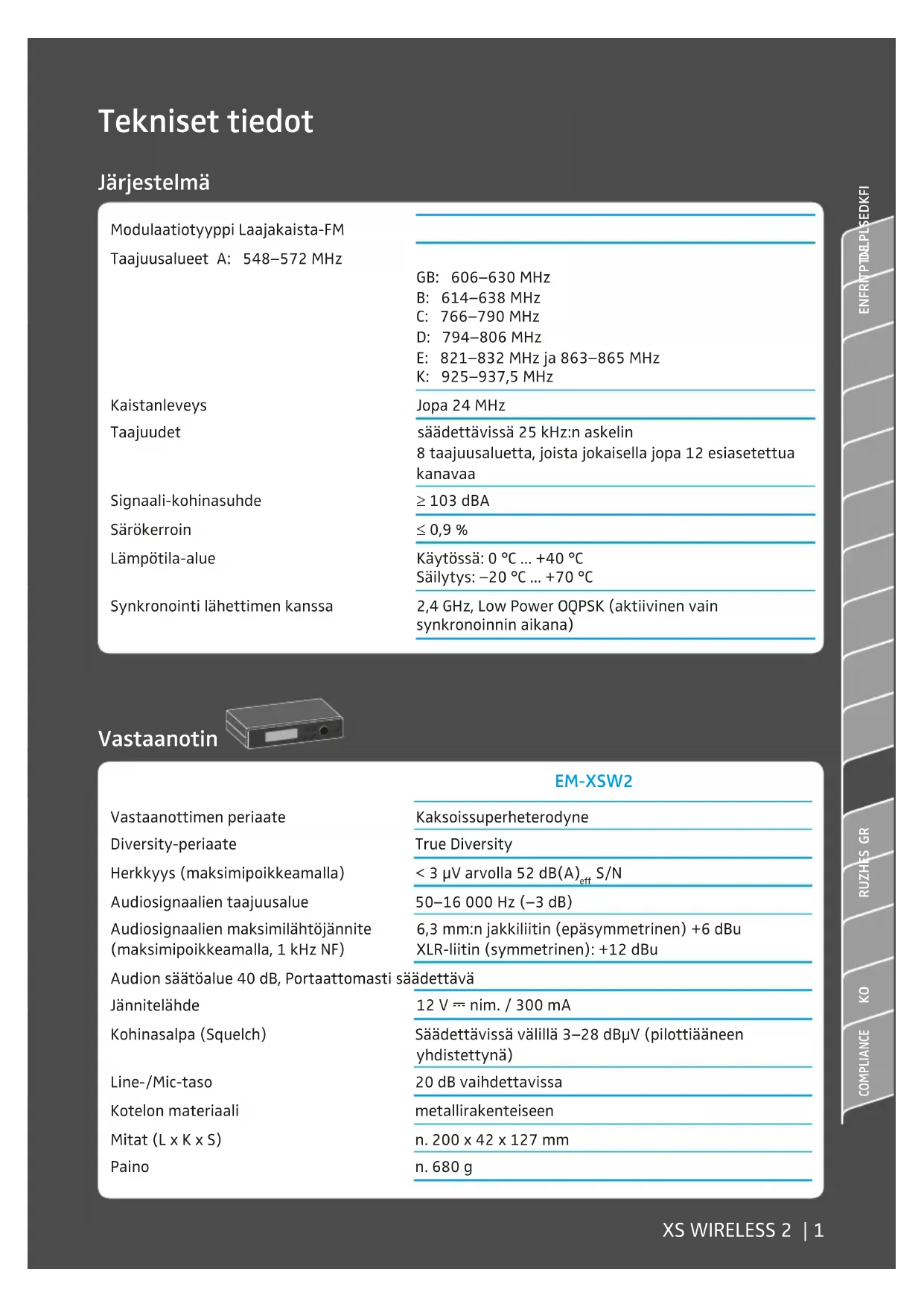 COMPLIANCE Tekniset tiedot Modulaatiotyyppi Laajakaista-FM Taajuusalueet A: 548–572 MHz GB: 606–630 MHz B: 614–638 MHz C: 766–790 MHz D: 794–806 MHz E: 821–832 MHz ja 863–865 MHz K: 925–937,5 MHz Kaistanleveys Jopa 24 MHz Taajuudet säädettävissä 25 kHz:n askelin 8 taajuusaluetta, joista jokaisella jopa 12 esiasetettua kanavaa Signaali-kohinasuhde ≥ 103 dBA Särökerroin ≤ 0,9 % Lämpötila-alue Käytössä: 0 °C ... +40 °C Säilytys: –20 °C ... +70 °C Synkronointi lähettimen kanssa 2,4 GHz, Low Power OQPSK (aktiivinen vain synkronoinnin aikana) Järjestelmä EM-XSW2 Vastaanottimen periaate Kaksoissuperheterodyne Diversity-periaate True Diversity Herkkyys (maksimipoikkeamalla) < 3 μV arvolla 52 dB(A) eff S/N Audiosignaalien taajuusalue 50–16 000 Hz ( –3 dB) Audiosignaalien maksimilähtöjännite (maksimipoikkeamalla, 1 kHz NF) 6,3 mm:n jakkiliitin (epäsymmetrinen) +6 dBu XLR-liitin (symmetrinen): +12 dBu Audion säätöalue 40 dB, Portaattomasti säädettävä Jännitelähde 12 V ⎓ nim. / 300 mA Kohinasalpa (Squelch) Säädettävissä välillä 3–28 dBμV (pilottiääneen yhdistettynä) Line-/Mic-taso 20 dB vaihdettavissa Kotelon materiaali metallirakenteiseen Mitat (L x K x S) n. 200 x 42 x 127 mm Paino n. 680 g Vastaanotin2 | XS WIRELESS 2 Lähetin SK-XSW SKM-XSW e 835 e 865 HF-lähtöteho 10 mW Audiosignaalien taajuusalue 50–16 000 Hz (Line) 80–16 000 Hz (Mic) 80–16000 Hz Audiotulo 3,5 mm:n jakkiliitin – Maksimitulojännite (Mic/Line), kun särökerroin on 3 % tyyp. 1,5 V RMS Mic/ tyyp. 2,6 V RMS Line @ –30 dB Gain