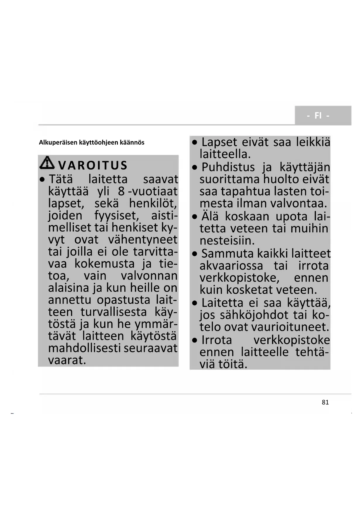 - Puhdistus ja käyttäjän suorittama huolto eivät saa tapahtua lasten toi- mesta ilman valvontaa.