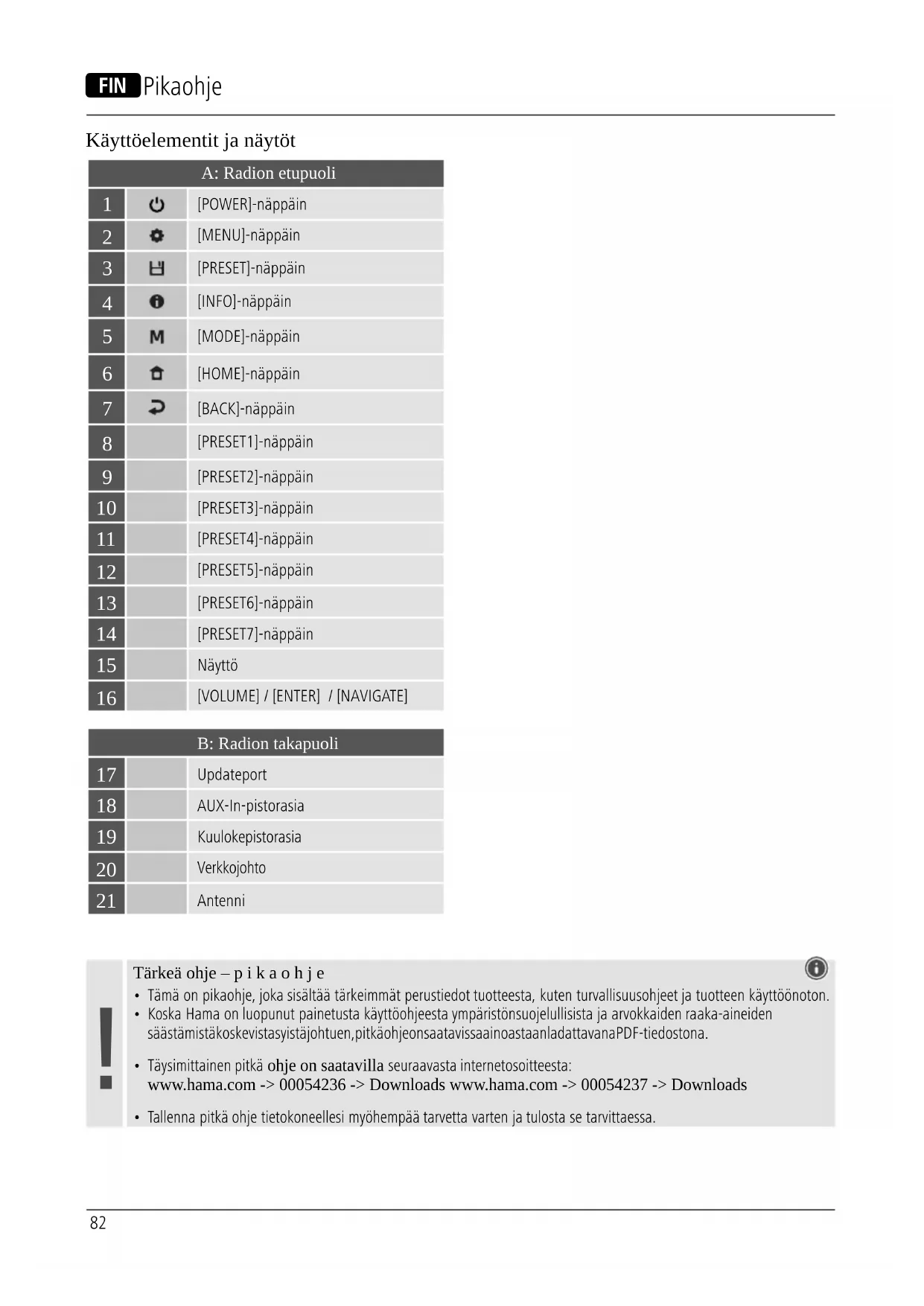 N:o 1275/2008 mukaan, joita on muutettu asetuksella (EY) N:o 801/2013 Tila Kesto Laukaisuaika Tehonkulutus (Watt) pois päältä -tilalla 0/I verkkokytkin (vain laitteissa, joissa on 0/I-verkkokytkin) – ≤ 0,50 W Manuaalinen valmiustila (valmiustila laitteissa, joissa ei ole tietoja tai tilanäyttöä (manuaalinen)*) – ≤ 0,50 W Manuaalinen valmiustila (valmiustila laitteissa, joissa on tiedot tai tilanäyttö (manuaalinen)*) – ≤ 1,00 W Automaattinen valmiustila (valmiustila laitteissa, joissa ei ole tietoja tai tilanäyttöä**) ≤ 20 min ≤ 0,50 W tieto- tai tilanäyttö (automaattinen valmiustila laitteissa, joissa on tiedot tai tilanäyttö**) ≤ 20 min ≤ 1,00 W Verkkovalmiustila*** ≤ 20 min ≤ 2,00 W *Power-painikkeen painallus **Ei verkkoyhteyttä –”Pidä verkkoyhteys –EI”. Ei käytettävissä FM-käyttötilassa, jos sellainen on. ***Verkkoyhteys –”Pidä verkkoyhteys –KYLLÄ”. Huomioi, että todellinen tehon kulutus voi riippua useista eri tekijöistä. Siihen vaikuttavat henkilökohtaiset asetukset, käyttötila, ympäristön lämpötila ja tuotteessa käytettävä laiteohjelmisto. Yllä mainitut arvot ovat maksimiarvoja. Todelliset viitearvot löytyvät seuraavasta osoitteesta: www.hama.com -> 00054236 -> Downloads -> Kulutustiedot www.hama.com -> 00054237 -> Downloads -> Kulutustiedot87 K Lynvejledning Betjeningselementer og visninger A: Radio forside