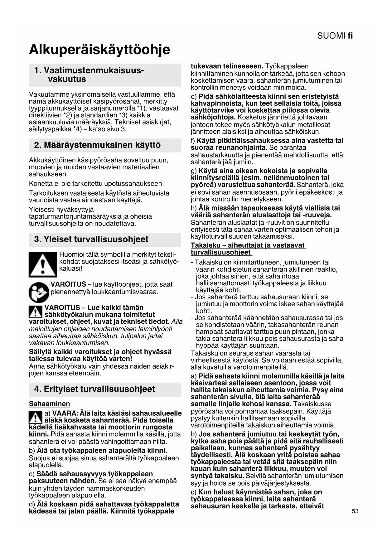 Alkuperäiskäyttöohje Vakuutamme yksinomaisella vastuullamme, että nämä akkukäyttöiset käsipyörösahat, merkitty tyyppitunnuksella ja sarjanumerolla *1), vastaavat direktiivien *2) ja standardien *3) kaikkia asiaankuuluvia määräyksiä. Tekniset asiakirjat, säilytyspaikka *4) – katso sivu 3. Akkukäyttöinen käsipyörösaha soveltuu puun, muovien ja muiden vastaavien materiaalien sahaukseen. Konetta ei ole tarkoitettu upotussahaukseen. Tarkoituksen vastaisesta käytöstä aiheutuvista vaurioista vastaa ainoastaan käyttäjä. Yleisesti hyväksyttyjä tapaturmantorjuntamääräyksiä ja oheisia turvallisuusohjeita on noudatettava. Huomioi tällä symbolilla merkityt teksti- kohdat suojataksesi itseäsi ja sähkötyö- kaluasi! VAROITUS – lue käyttöohjeet, jotta saat pienennettyä loukkaantumisvaaraa. VAROITUS – Lue kaikki tämän sähkötyökalun mukana toimitetut varoitukset, ohjeet, kuvat ja tekniset tiedot. Alla mainittujen ohjeiden noudattamisen laiminlyönti saattaa aiheuttaa sähköiskun, tulipalon ja/tai vakavan loukkaantumisen. Säilytä kaikki varoitukset ja ohjeet hyvässä tallessa tulevaa käyttöä varten! Anna sähkötyökalu vain yhdessä näiden asiakir- jojen kanssa eteenpäin. Sahaaminen a) VAARA: Älä laita käsiäsi sahausalueelle äläkä kosketa sahanterää. Pidä toisella kädellä lisäkahvasta tai moottorin rungosta kiinni. Pidä sahasta kiinni molemmilla käsillä, jotta sahanterä ei voi päästä vahingoittamaan niitä. b) Älä ota työkappaleen alapuolelta kiinni. Suojus ei suojaa sinua sahanterältä työkappaleen alapuolella. c) Säädä sahaussyvyys työkappaleen paksuuteen nähden. Se ei saa näkyä enempää kuin yhden täyden hammaskorkeuden työkappaleen alapuolella. d) Älä koskaan pidä sahattavaa työkappaletta kädessä tai jalan päällä. Kiinnitä työkappale tukevaan telineeseen. Työkappaleen kiinnittäminen kunnolla on tärkeää, jotta sen kehoon koskettamisen vaara, sahanterän jumiutuminen tai kontrollin menetys voidaan minimoida. e) Pidä sähkölaitteesta kiinni sen eristetyistä kahvapinnoista, kun teet sellaisia töitä, joissa käyttötarvike voi koskettaa piilossa olevia sähköjohtoja. Kosketus jännitettä johtavaan johtoon tekee myös sähkötyökalun metalliosat jännitteen alaisiksi ja aiheuttaa sähköiskun. f) Käytä pitkittäissahauksessa aina vastetta tai suoraa reunanohjainta. Se parantaa sahaustarkkuutta ja pienentää mahdollisuutta, että sahanterä jää jumiin. g) Käytä aina oikean kokoista ja sopivalla kiinnitysreiällä (esim. neliönmuotoinen tai pyöreä) varustettua sahanterää. Sahanterä, joka ei sovi sahan asennusosaan, pyörii epäkeskosti ja johtaa kontrollin menetykseen. h) Älä missään tapauksessa käytä viallisia tai vääriä sahanterän aluslaattoja tai -ruuveja. Sahanterän aluslaatat ja -ruuvit on suunniteltu erityisesti tätä sahaa varten optimaalisen tehon ja käyttöturvallisuuden takaamiseksi. Takaisku – aiheuttajat ja vastaavat turvallisuusohjeet - Takaisku on kiinnitarttuneen, jumiutuneen tai väärin kohdistetun sahanterän äkillinen reaktio, joka johtaa siihen, että saha irtoaa hallitsemattomasti työkappaleesta ja liikkuu käyttäjää kohti. - Jos sahanterä tarttuu sahausuraan kiinni, se jumiutuu ja moottorin voima iskee sahan käyttäjää kohti. - Jos sahanterää käännetään sahausurassa tai jos se kohdistetaan väärin, takasahanterän reunan hampaat saattavat tarttua puun pintaan, jonka takia sahanterä liikkuu pois sahausurasta ja saha hyppää käyttäjän suuntaan. Takaisku on seuraus sahan väärästä tai virheellisestä käytöstä. Se voidaan estää sopivilla, alla kuvatuilla varotoimenpiteillä. a) Pidä sahasta kiinni molemmilla käsillä ja laita käsivartesi sellaiseen asentoon, jossa voit hallita takaiskun aiheuttamia voimia. Pysy aina sahanterän sivulla, älä laita sahanterää samalle linjalle kehosi kanssa. Takaiskussa pyörösaha voi ponnahtaa taaksepäin. Käyttäjä pystyy kuitenkin hallitsemaan sopivilla varotoimenpiteillä takaiskun aiheuttamia voimia. b) Jos sahanterä jumiutuu tai keskeytät työn, kytke saha pois päältä ja pidä sitä rauhallisesti paikallaan, kunnes sahanterä pysähtyy täydellisesti. Älä koskaan yritä poistaa sahaa työkappaleesta tai vetää sitä taaksepäin niin kauan kuin sahanterä liikkuu, muuten voi syntyä takaisku. Selvitä sahanterän jumiutumisen syy ja hoida se pois päiväjärjestyksestä. c) Kun haluat käynnistää sahan, joka on työkappaleessa kiinni, laita sahanterä sahausuran keskelle ja tarkasta, etteivät