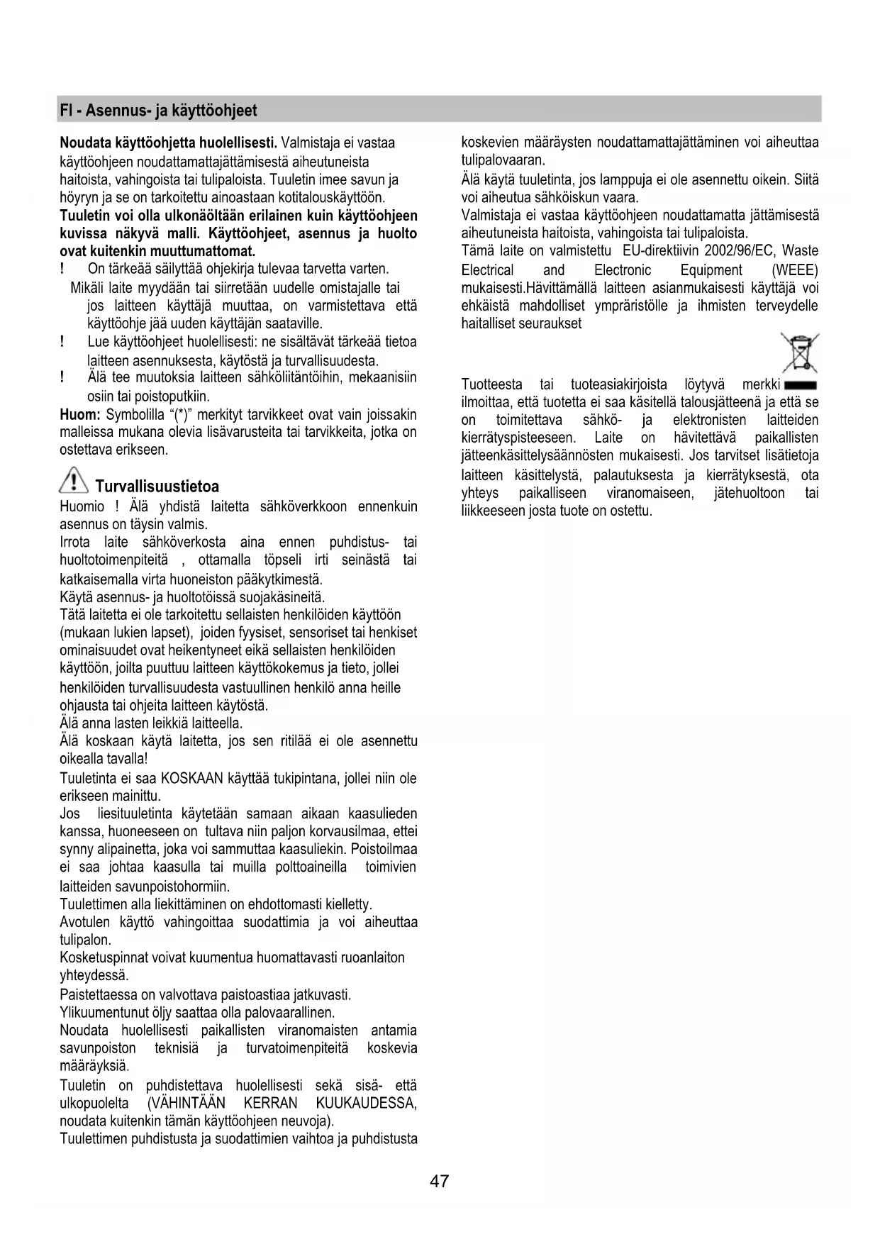 Tryck in tangenten under 3 sekunder, fläktens elektroniska kontrollfunktion stängs av. Denna funktion är till hjälp i samband med rengöring av produkten. För att aktivera den elektroniska funktionen igen upprepas operationen. I det fall eventuella funktionsstörningar uppstår skall den elektriska anslutningen kopplas ifrån under minst 5 sekunder genom att kontakten dras ur, innan servicetjänst kontaktas. Om funktionsstörningen fortsätter, kontakta servicekontoret.46 Underhåll Varning! Gör alltid fläkten strömlös innan någon typ av underhållsarbete eller rengöring inleds genom att slå ifrån bostadens huvudströmbrytare. Rengöring Fläkten skall rengöras ofta, såväl invändigt som utvändigt (åtminstone med samma underhållsintervall som för fettfiltren). Använd en trasa fuktad med neutrala rengöringsmedel vid rengöring. Undvik produkter som innehåller slipmedel. ANVÄND INTE ALKOHOL! Varning: Observera att en bristande rengöring av apparaten och icke utförda filterbyten kan medföra brandrisk. Följ därför ovanstående instruktioner noga. Tillverkaren frånsäger sig allt ansvar för eventuella motorskador, eldsvådor beroende på ett bristande underhåll eller att dessa instruktioner inte respekterats. Observera att en bristande rengöring av apparaten och filtren kan medföra brandrisk. Följ därför ovanstående instruktioner noga. Fettfilter Fig. 19-25 Detta suger upp fettpartiklar som bildas i samband med matlagningen. Filtret skall rengöras en gång i månaden (eller när indikatorn för filtrets mättning – om sådan finns på er modell – anger att detta är nödvändigt), med ett milt rengöringsmedel, för hand eller i diskmaskin, med låg temperatur och kort program. Vi tvätt i diskmaskin kan fettfiltret av metall missfärgas utan att detta på något sätt påverkar filtrets uppsugningsförmåga. När filtret skall monteras ur drar man i handtaget som lossas med hjälp av en fjäder. Kolfilter (gäller endast filterversionen) Fig. 23 Kolfiltret fångar upp obehagliga odörer som uppstår i samband med matlagningen. Kolfiltret bör tvättas varannan månad (eller när signalsystemet för filtrets mättning – i det fall den aktuella modellen är utrustad med ett sådant- signalerar detta) med varmt vatten och ett lämpligt rengöringsmedel, eller diskas i diskmaskin, 65°C (i det fall filtret diskas i diskmaskin skall en komplett tvättcykel köras utan annan disk i maskinen). Krama försiktig ur överflödigt vatten utan att skada filtret, torka det därefter i ungen i 10 minuter, 100°C. Byt ut dynan vart 3:dje år eller så fort filten uppvisar skador. Byte av Lampor Fläkten är utrustad med ett belysningssystem som bygger på lysdiodsteknologi. Lysdioderna garanterar optimal belysning, upptill 10 gånger längre livslängd jämfört med konventionella lampor och möjliggör en energibesparing på 90%. Kontakta det tekniska servicekontoret för byte av lysdioderna.47 FI - Asennus- ja käyttöohjeet Noudata käyttöohjetta huolellisesti. Valmistaja ei vastaa käyttöohjeen noudattamattajättämisestä aiheutuneista haitoista, vahingoista tai tulipaloista. Tuuletin imee savun ja höyryn ja se on tarkoitettu ainoastaan kotitalouskäyttöön. Tuuletin voi olla ulkonäöltään erilainen kuin käyttöohjeen kuvissa näkyvä malli. Käyttöohjeet, asennus ja huolto ovat kuitenkin muuttumattomat. ! On tärkeää säilyttää ohjekirja tulevaa tarvetta varten. Mikäli laite myydään tai siirretään uudelle omistajalle tai jos laitteen käyttäjä muuttaa, on varmistettava että käyttöohje jää uuden käyttäjän saataville. ! Lue käyttöohjeet huolellisesti: ne sisältävät tärkeää tietoa laitteen asennuksesta, käytöstä ja turvallisuudesta. ! Älä tee muutoksia laitteen sähköliitäntöihin, mekaanisiin osiin tai poistoputkiin. Huom: Symbolilla “(*)” merkityt tarvikkeet ovat vain joissakin malleissa mukana olevia lisävarusteita tai tarvikkeita, jotka on ostettava erikseen. Turvallisuustietoa Huomio ! Älä yhdistä laitetta sähköverkkoon ennenkuin asennus on täysin valmis. Irrota laite sähköverkosta aina ennen puhdistus- tai huoltotoimenpiteitä , ottamalla töpseli irti seinästä tai katkaisemalla virta huoneiston pääkytkimestä. Käytä asennus- ja huoltotöissä suojakäsineitä. Tätä laitetta ei ole tarkoitettu sellaisten henkilöiden käyttöön (mukaan lukien lapset), joiden fyysiset, sensoriset tai henkiset ominaisuudet ovat heikentyneet eikä sellaisten henkilöiden käyttöön, joilta puuttuu laitteen käyttökokemus ja tieto, jollei henkilöiden turvallisuudesta vastuullinen henkilö anna heille ohjausta tai ohjeita laitteen käytöstä. Älä anna lasten leikkiä laitteella. Älä koskaan käytä laitetta, jos sen ritilää ei ole asennettu oikealla tavalla! Tuuletinta ei saa KOSKAAN käyttää tukipintana, jollei niin ole erikseen mainittu. Jos liesituuletinta käytetään samaan aikaan kaasulieden kanssa, huoneeseen on tultava niin paljon korvausilmaa, ettei synny alipainetta, joka voi sammuttaa kaasuliekin. Poistoilmaa ei saa johtaa kaasulla tai muilla polttoaineilla toimivien laitteiden savunpoistohormiin. Tuulettimen alla liekittäminen on ehdottomasti kielletty. Avotulen käyttö vahingoittaa suodattimia ja voi aiheuttaa tulipalon. Kosketuspinnat voivat kuumentua huomattavasti ruoanlaiton yhteydessä. Paistettaessa on valvottava paistoastiaa jatkuvasti. Ylikuumentunut öljy saattaa olla palovaarallinen. Noudata huolellisesti paikallisten viranomaisten antamia savunpoiston teknisiä ja turvatoimenpiteitä koskevia määräyksiä. Tuuletin on puhdistettava huolellisesti sekä sisä- että ulkopuolelta (VÄHINTÄÄN KERRAN KUUKAUDESSA, noudata kuitenkin tämän käyttöohjeen neuvoja). Tuulettimen puhdistusta ja suodattimien vaihtoa ja puhdistusta koskevien määräysten noudattamattajättäminen voi aiheuttaa tulipalovaaran. Älä käytä tuuletinta, jos lamppuja ei ole asennettu oikein. Siitä v