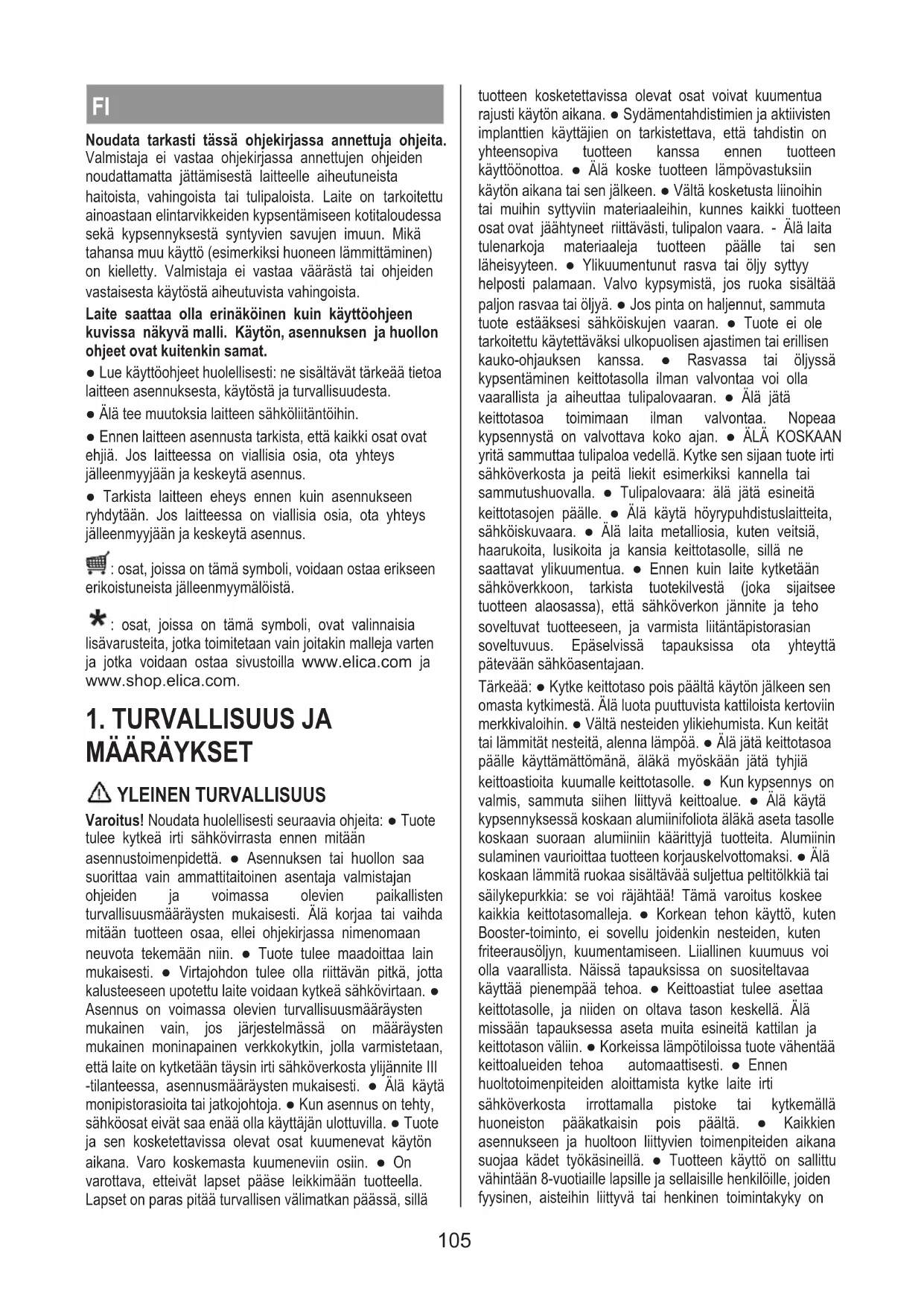 FELSÖKNINGSTABELL Informationskod Beskrivning Möjliga orsaker Lösning Kontrollpanelen stängs av på grund av för hög temperatur De elektroniska komponenternas invändiga temperatur är för hög Vänta tills spishällen svalnat innan den används igen Icke lämpligt kokkärl Magnetinduktionen fungerar inte Ta av kokkärlet Kommunikationsproblem mellan användargränssnitt och induktionsmodul Elektrisk ström når inte modulen; matningskabeln har inte anslutits korrekt eller är defekt Dra ur kontakten till spishällen och kontrollera anslutningen För alla andra felsignaler Kontakta det tekniska servicekontoret och ange felkoden SERVICEKONTOR Innan ni kontaktar servicekontoret 1.Kontrollera att problemet inte går att lösa med hjälp av indikationerna i “Felsökning”. 2.Stäng av och slå på apparaten för att kontrollera om problemet kvarstår. Kontakta närmaste Servicekontor om dessa kontroller inte leder till att felet åtgärdas. 104FI Noudata tarkasti tässä ohjekirjassa annettuja ohjeita. Valmistaja ei vastaa ohjekirjassa annettujen ohjeiden noudattamatta jättämisestä laitteelle aiheutuneista haitoista, vahingoista tai tulipaloista. Laite on tarkoitettu ainoastaan elintarvikkeiden kypsentämiseen kotitaloudessa sekä kypsennyksestä syntyvien savujen imuun. Mikä tahansa muu käyttö (esimerkiksi huoneen lämmittäminen) on kielletty. Valmistaja ei vastaa väärästä tai ohjeiden vastaisesta käytöstä aiheutuvista vahingoista. Laite saattaa olla erinäköinen kuin käyttöohjeen kuvissa näkyvä malli. Käytön, asennuksen ja huollon ohjeet ovat kuitenkin samat. ● Lue käyttöohjeet huolellisesti: ne sisältävät tärkeää tietoa laitteen asennuksesta, käytöstä ja turvallisuudesta. ● Älä tee muutoksia laitteen sähköliitäntöihin. ● Ennen laitteen asennusta tarkista, että kaikki osat ovat ehjiä. Jos laitteessa on viallisia osia, ota yhteys jälleenmyyjään ja keskeytä asennus. ● Tarkista laitteen eheys ennen kuin asennukseen ryhdytään. Jos laitteessa on viallisia osia, ota yhteys jälleenmyyjään ja keskeytä asennus. : osat, joissa on tämä symboli, voidaan ostaa erikseen erikoistuneista jälleenmyymälöistä. : osat, joissa on tämä symboli, ovat valinnaisia lisävarusteita, jotka toimitetaan vain joitakin malleja varten ja jotka voidaan ostaa sivustoilla www.elica.com ja www.shop.elica.com.