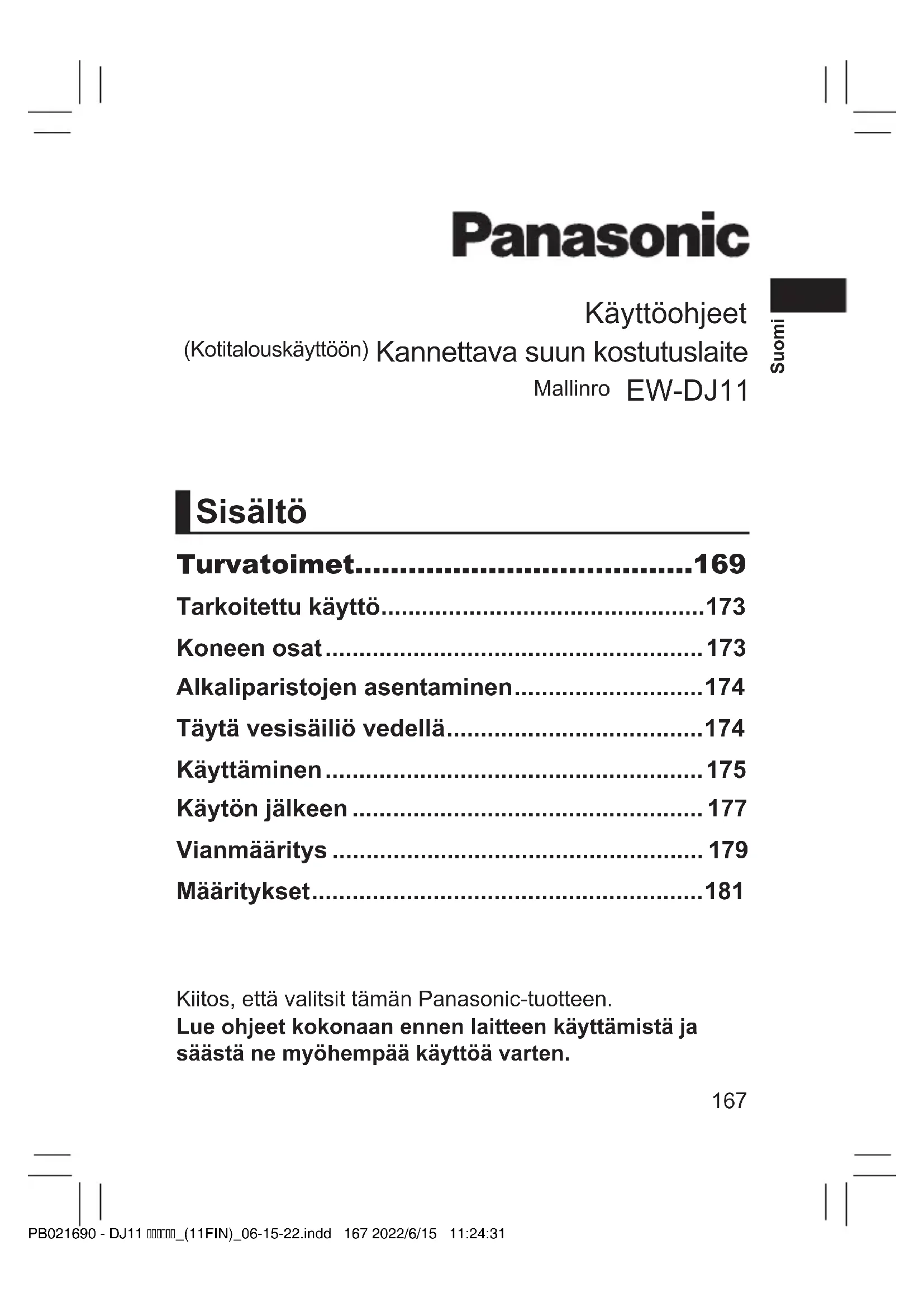 - Paina PB021690 - DJ11 _(11FIN)_06-15-22.indd 180 2022/6/15 11:24:34181 Suomi Määritykset Sähkön toimitus Alkaliparisto Akku Kaksi LR6 (AA-alkaliparistoa) (myydään erikseen) Käyttöaika Noin 20 minuuttia (Kun käytetään kahta Panasonic LR6 (AA- alkaliparistoa), vedenpaineen taso on asetettu 2:een ja huoneen lämpötila on 20 °C) Säiliön tilavuus Noin 150 mL (N. 35 sekunnin käytön ajan, kun vedenpaineen taso on asetettu tasolle 2) Mitat Noin 30,9 cm (tai 23,4 cm, kun suutinta ei ole asennettu) (K) x 5,2 cm (L) x 5,7 cm (S) Säilytyksessä: Noin 15,4 cm (K) x 5,2 cm (L) x 5,7 cm (S) Ilmassa kantautuva melu 72 (dB (A) re 1 pW) Tämä tuote on tarkoitettu vain kotitalouskäyttöön. PB021690 - DJ11 _(11FIN)_06-15-22.indd 181 2022/6/15 11:24:34182 Suomi Vanhojen laitteiden hävittäminen Vain EU-jäsenmaille ja kierrätysjärjestelmää käyttäville maille Tämä symboli tuotteissa, pakkauksessa ja/tai asiakirjoissa tarkoittaa, että käytettyjä sähköllä toimivia ja elektronisia tuotteita ei saa laittaa yleisiin talousjätteisiin. Johda vanhat tuotteet käsittelyä, uusiointia tai kierrätystä varten vastaaviin keräyspisteisiin laissa annettujen määräysten mukaisesti. Hävittämällä tuotteet asiaankuuluvasti autat samalla suojaamaan arvokkaita luonnonvaroja ja estämään mahdollisia negatiivisia vaikutuksia ihmiseen ja luontoon. Lisätietoa keräämisestä ja kierrätyksestä saa paikalliselta jätehuollosta vastuulliselta viranomaiselta. Maiden lainsäädännön mukaisesti tämän jätteen määräystenvastaisesta hävittämisestä voidaan antaa sakkorangaistuksia. Maahantuoja: Panasonic Marketing Europe GmbH Valtuutettu edustaja EU:ssa: Panasonic Testing Centre Winsbergring 15, 22525 Hampuri, Saksa Valmistaja: Panasonic Corporation 1006, Oaza Kadoma, Kadoma-kaupunki, Osaka, Japani PB021690 - DJ11 _(11FIN)_06-15-22.indd 182 2022/6/15 11:24:34183 Polski Dziękujemy za wybór produktu Panasonic. Przed rozpoczęciem użytkowania tego urządzenia prosimy o przeczytanie całej instrukcji i zachowanie jej do wykorzystania w przyszłości. Instrukcja obsługi (Do użytku domowego) Bezprzewodowy irygator do zębów Nr modelu EW-DJ11 Spis treści Środki ostrożności p. 185