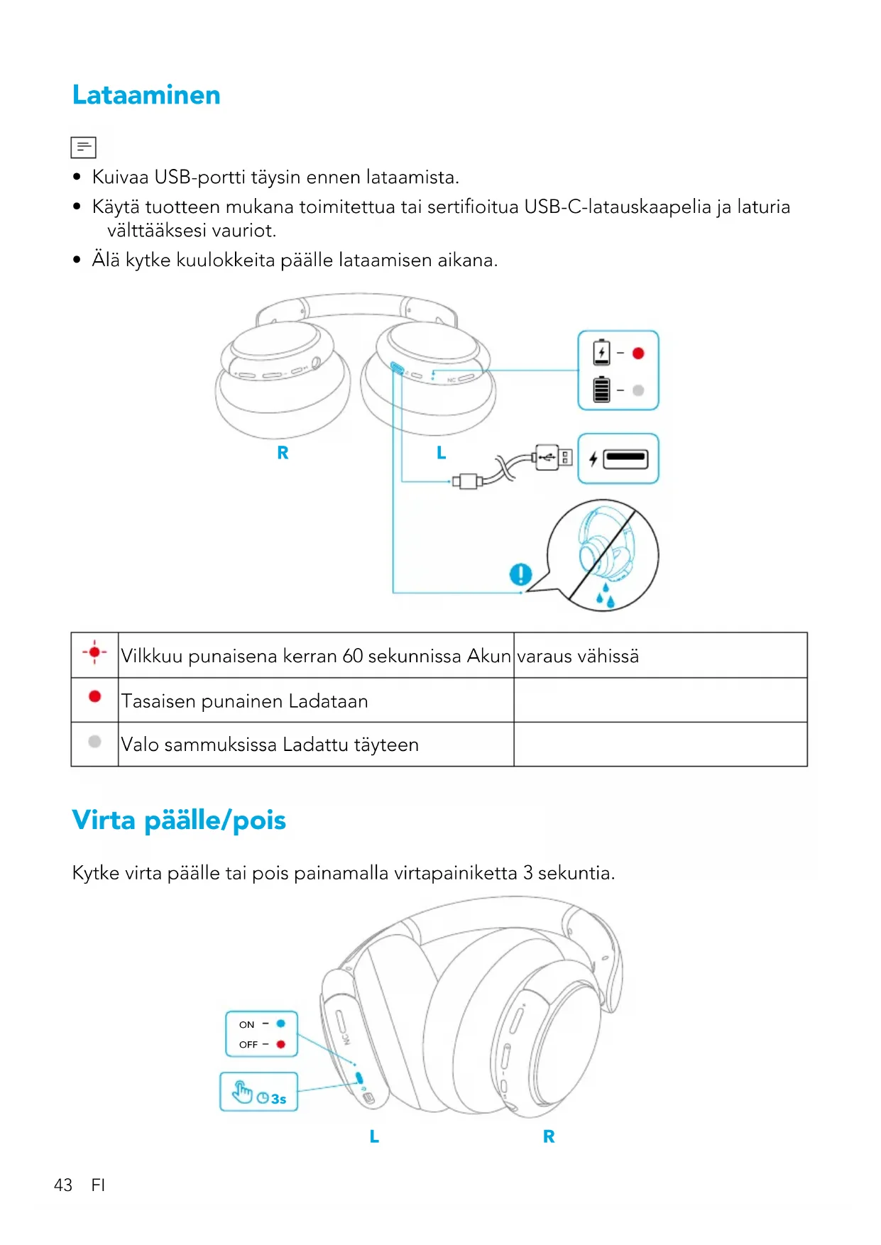 - Älä kytke kuulokkeita päälle lataamisen aikana. R L Vilkkuu punaisena kerran 60 sekunnissa Akun varaus vähissä Tasaisen punainen Ladataan Valo sammuksissa Ladattu täyteen Virta päälle/pois Kytke virta päälle tai pois painamalla virtapainiketta 3 sekuntia.