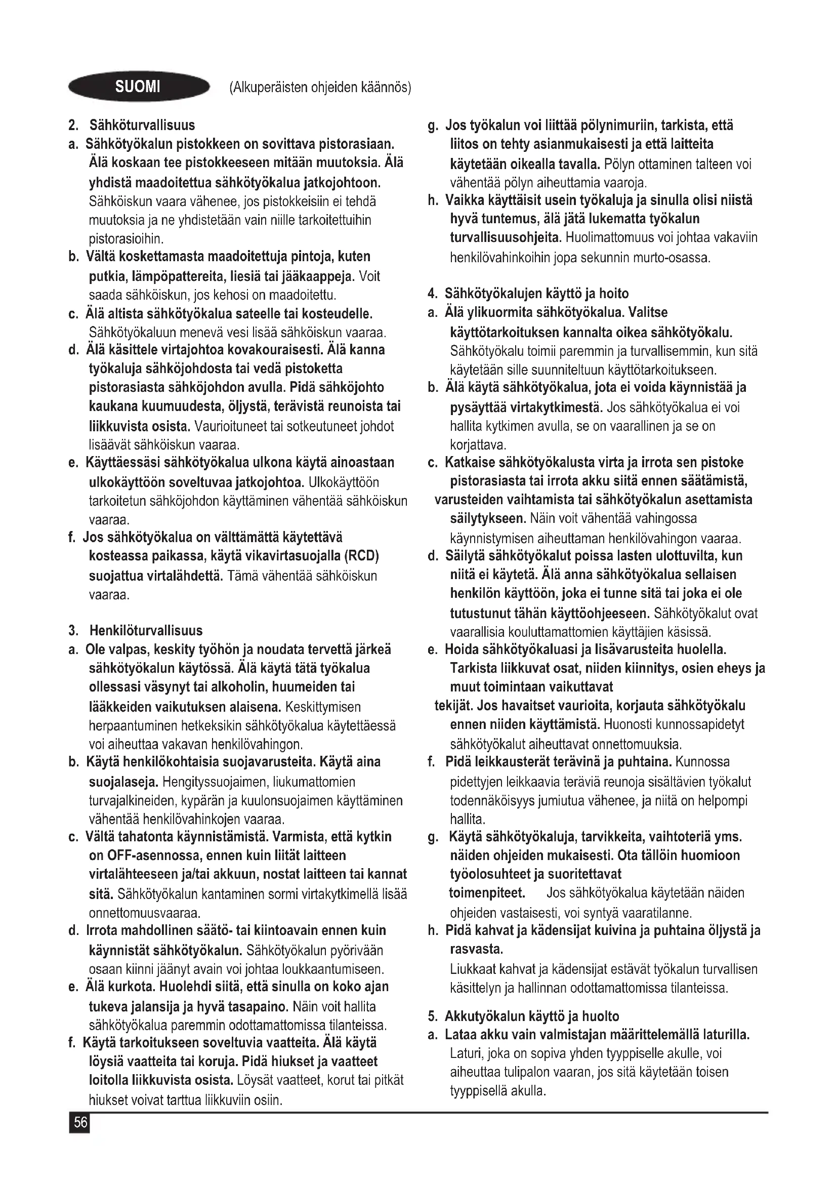 a. Pidä työalue puhtaana ja hyvin valaistuna. Onnettomuuksia sattuu herkemmin epäsiistissä tai huonosti valaistussa ympäristössä. b. Älä käytä sähkötyökalua räjähdysalttiissa ympäristössä, jossa on syttyvää nestettä, kaasua tai pölyä. Sähkötyökalujen aiheuttamat kipinät voivat sytyttää pölyn tai kaasut. c. Pidä lapset ja sivulliset loitolla sähkötyökalua käyttäessäsi. Keskittymiskyvyn herpaantuminen voi aiheuttaa hallinnan menettämisen.56 (Alkuperäisten ohjeiden käännös) SUOMI
