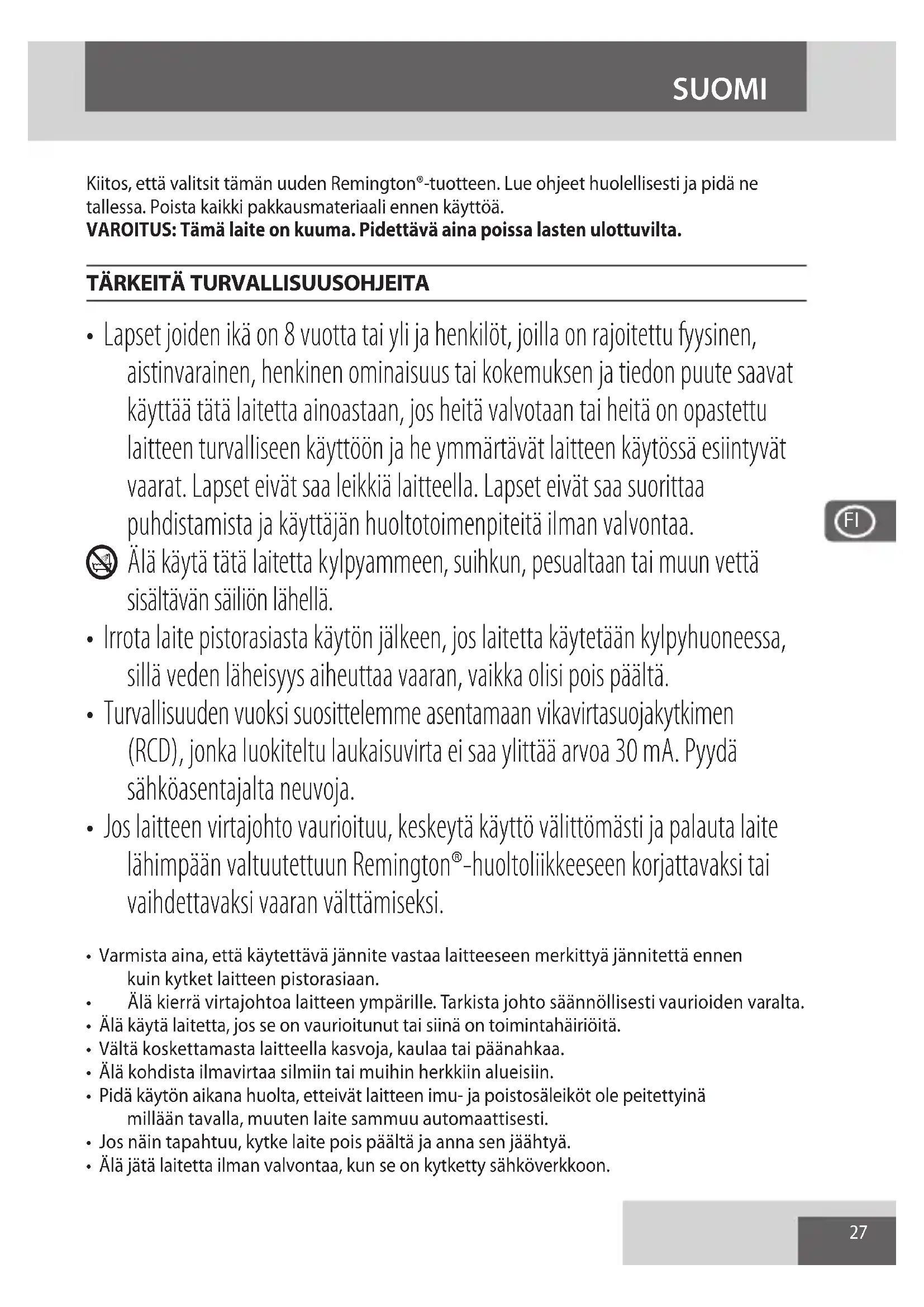 Kiitos,etta valitsit tāmān uuden Remington®-tuotteen. Lue ohjeet huolellisesti ja pidä ne tallessa. Poista kaikki pakkausmaterialiaali ennen käyttoä.