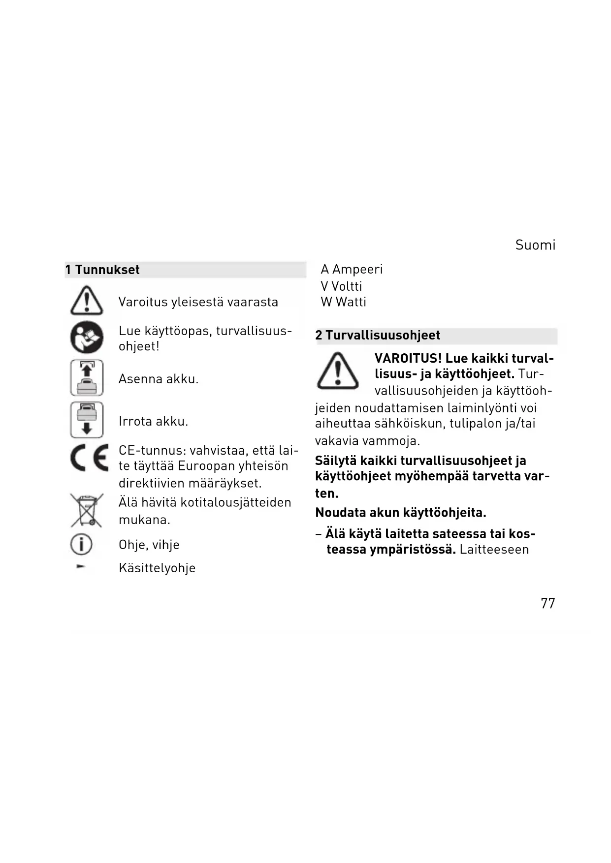 ► Kahjustuste vältimiseks puhastage seadet pehme ja kuiva lapiga. Ärge kasutage lahusteid. 9 Keskkond Ärge käidelge seadet koos olmejäätmetega! Seadmed, lisavarustus ja pakendid tu leb suunata keskkonnasõ bralikult taaskasutusse. Järgige kehtivaid riiklikke eeskirju. Üksnes EL riikidele: Vastavalt Euroopa Liidu direktiivile elektri- ja elektrooni kaseadmete jäätmete kohta tuleb kasu tusressursi ammendanud elektrilised tööriistad eraldi kokku koguda ja kesk konnasäästlikult korduskasutada. REACh teave: www.festool.com/reach Eesti 761 Tunnukset Varoitus yleisestä vaarasta Lue käyttöopas, turvallisuus ohjeet! Asenna akku. Irrota akku. CE-tunnus: vahvistaa, että lai te täyttää Euroopan yhteisön direktiivien määräykset. Älä hävitä kotitalousjätteiden mukana. Ohje, vihje Käsittelyohje A Ampeeri V Voltti W Watti 2 Turvallisuusohjeet VAROITUS! Lue kaikki turval lisuus- ja käyttöohjeet. Tur vallisuusohjeiden ja käyttöoh jeiden noudattamisen laiminlyönti voi aiheuttaa sähköiskun, tulipalon ja/tai vakavia vammoja. Säilytä kaikki turvallisuusohjeet ja käyttöohjeet myöhempää tarvetta var ten. Noudata akun käyttöohjeita. – Älä käytä laitetta sateessa tai kos teassa ympäristössä. Laitteeseen Suomi 77pääsevä kosteus voi aiheuttaa oikosu lun tai tulipalon. – Ei työnnä naulaa, rautalankaa tms. USB-porttiin. Oikosulku-, savunmuo dostus- ja tulipalopalovaara, jos et noudata tätä neuvoa. – Älä kytke USB-portteja pistorasiaan, muuhun virtalähteeseen tai mihin kään korkeajännitelaitteeseen. Muu ten syntyy palovaara. USB-portit on tarkoitettu vain pienjännitelaitteiden lataukseen. (USB-A-lähtö = 5 V / 2,4 A; USB‑C
