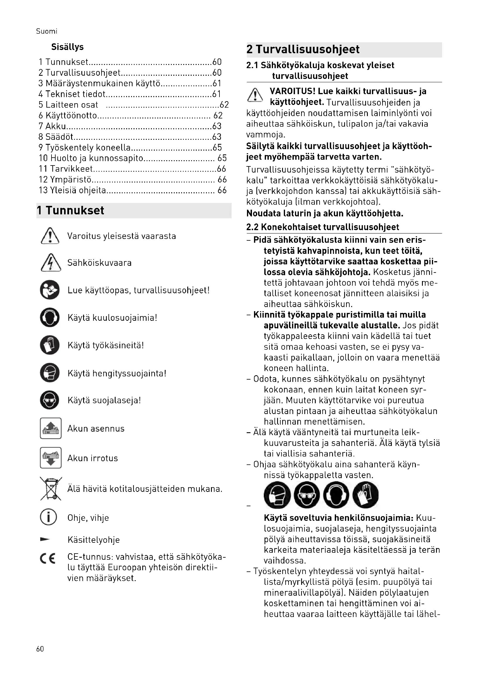 - 13 Yleisiä ohjeita 1 Tunnukset Varoitus yleisestä vaarasta Sähköiskuvaara Lue käyttöopas, turvallisuusohjeet! Käytä kuulosuojaimia! Käytä työkäsineitä! Käytä hengityssuojainta! Käytä suojalaseja! Akun asennus Akun irrotus Älä hävitä kotitalousjätteiden mukana. Ohje, vihje Käsittelyohje CE-tunnus: vahvistaa, että sähkötyöka lu täyttää Euroopan yhteisön direktii vien määräykset. 2 Turvallisuusohjeet p. 66
