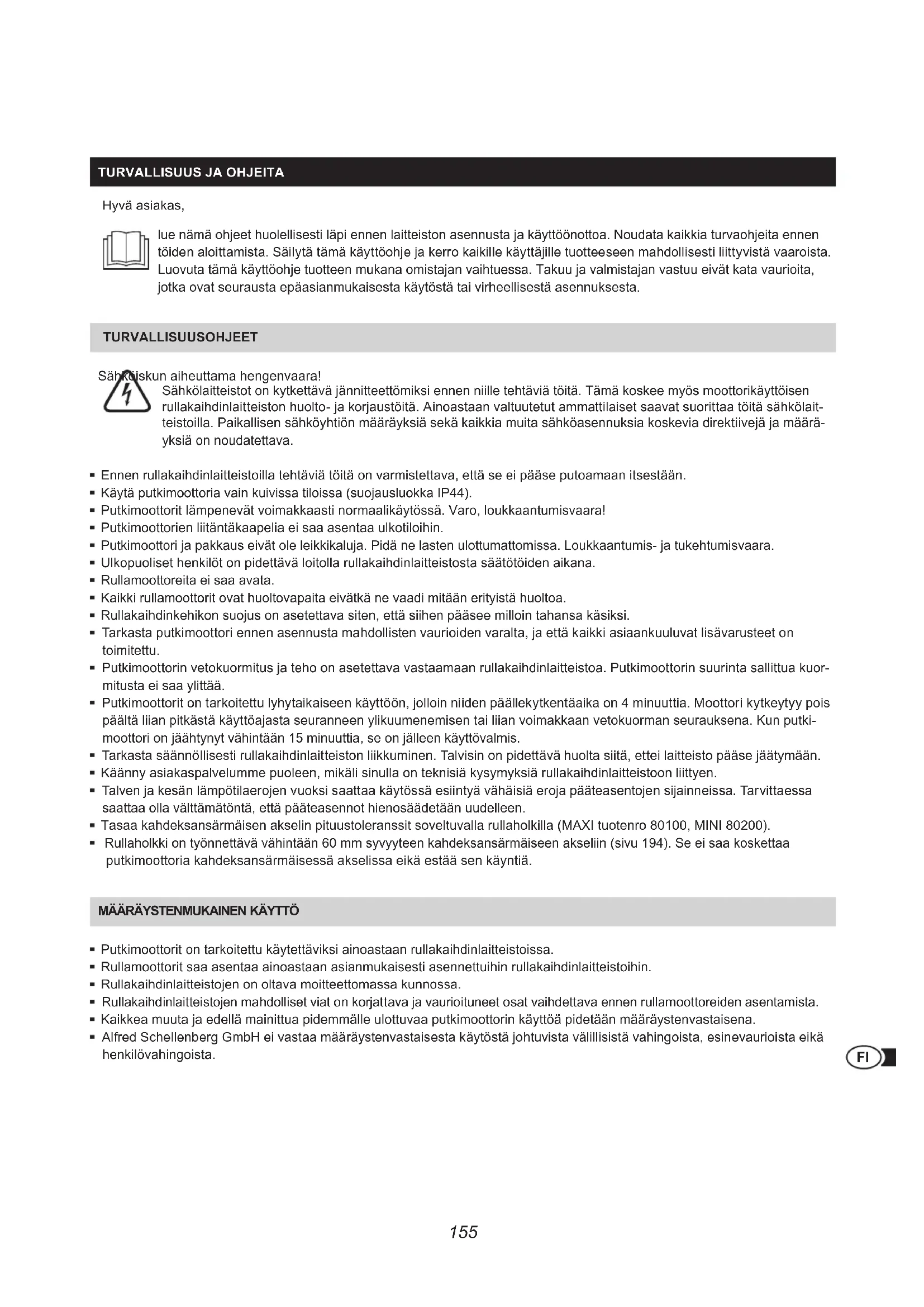 Hyvä asiakas, lue nämä ohjeet huolellisesti läpi ennen laitteiston asennusta ja käyttöönottoa. Noudata kaikkia turvaohjeita ennen töiden aloittamista. Säilytä tämä käyttöohje ja kerro kaikille käyttäjille tuotteeseen mahdollisesti liittyvistä vaaroista. Luovuta tämä käyttöohje tuotteen mukana omistajan vaihtuessa. Takuu ja valmistajan vastuu eivät kata vaurioita, jotka ovat seurausta epäasianmukaisesta käytöstä tai virheellisestä asennuksesta. TURVALLISUUSOHJEET Sähköiskun aiheuttama hengenvaara! Sähkölaitteistot on kytkettävä jännitteettömiksi ennen niille tehtäviä töitä. Tämä koskee myös moottorikäyttöisen rullakaihdinlaitteiston huolto- ja korjaustöitä. Ainoastaan valtuutetut ammattilaiset saavat suorittaa töitä sähkölait- teistoilla. Paikallisen sähköyhtiön määräyksiä sekä kaikkia muita sähköasennuksia koskevia direktiivejä ja määrä- yksiä on noudatettava. Ennen rullakaihdinlaitteistoilla tehtäviä töitä on varmistettava, että se ei pääse putoamaan itsestään. Käytä putkimoottoria vain kuivissa tiloissa (suojausluokka IP44). Putkimoottorit lämpenevät voimakkaasti normaalikäytössä. Varo, loukkaantumisvaara! Putkimoottorien liitäntäkaapelia ei saa asentaa ulkotiloihin. Putkimoottori ja pakkaus eivät ole leikkikaluja. Pidä ne lasten ulottumattomissa. Loukkaantumis- ja tukehtumisvaara. Ulkopuoliset henkilöt on pidettävä loitolla rullakaihdinlaitteistosta säätötöiden aikana. Rullamoottoreita ei saa avata. Kaikki rullamoottorit ovat huoltovapaita eivätkä ne vaadi mitään erityistä huoltoa. Rullakaihdinkehikon suojus on asetettava siten, että siihen pääsee milloin tahansa käsiksi. Tarkasta putkimoottori ennen asennusta mahdollisten vaurioiden varalta, ja että kaikki asiaankuuluvat lisävarusteet on toimitettu. Putkimoottorin vetokuormitus ja teho on asetettava vastaamaan rullakaihdinlaitteistoa. Putkimoottorin suurinta sallittua kuor- mitusta ei saa ylittää. Putkimoottorit on tarkoitettu lyhytaikaiseen käyttöön, jolloin niiden päällekytkentäaika on 4 minuuttia. Moottori kytkeytyy pois päältä liian pitkästä käyttöajasta seuranneen ylikuumenemisen tai liian voimakkaan vetokuorman seurauksena. Kun putki- moottori on jäähtynyt vähintään 15 minuuttia, se on jälleen käyttövalmis. Tarkasta säännöllisesti rullakaihdinlaitteiston liikkuminen. Talvisin on pidettävä huolta siitä, ettei laitteisto pääse jäätymään. Käänny asiakaspalvelumme puoleen, mikäli sinulla on teknisiä kysymyksiä rullakaihdinlaitteistoon liittyen. Talven ja kesän lämpötilaerojen vuoksi saattaa käytössä esiintyä vähäisiä eroja pääteasentojen sijainneissa. Tarvittaessa saattaa olla välttämätöntä, että pääteasennot hienosäädetään uudelleen. Tasaa kahdeksansärmäisen akselin pituustoleranssit soveltuvalla rullaholkilla (MAXI tuotenro 80100, MINI 80200). Rullaholkki on työnnettävä vähintään 60 mm syvyyteen kahdeksansärmäiseen akseliin (sivu 194). Se ei saa koskettaa putkimoottoria kahdeksansärmäisessä akselissa eikä estää sen käyntiä. määRäySTENmUKAINEN KäyTTö Putkimoottorit on tarkoitettu käytettäviksi ainoastaan rullakaihdinlaitteistoissa. Rullamoottorit saa asentaa ainoastaan asianmukaisesti asennettuihin rullakaihdinlaitteistoihin. Rullakaihdinlaitteistojen on oltava moitteettomassa kunnossa. Rullakaihdinlaitteistojen mahdolliset viat on korjattava ja vaurioituneet osat vaihdettava ennen rullamoottoreiden asentamista. Kaikkea muuta ja edellä mainittua pidemmälle ulottuvaa putkimoottorin käyttöä pidetään määräystenvastaisena. Alfred Schellenberg GmbH ei vastaa määräystenvastaisesta käytöstä johtuvista välillisistä vahingoista, esinevaurioista eikä henkilövahingoista.156