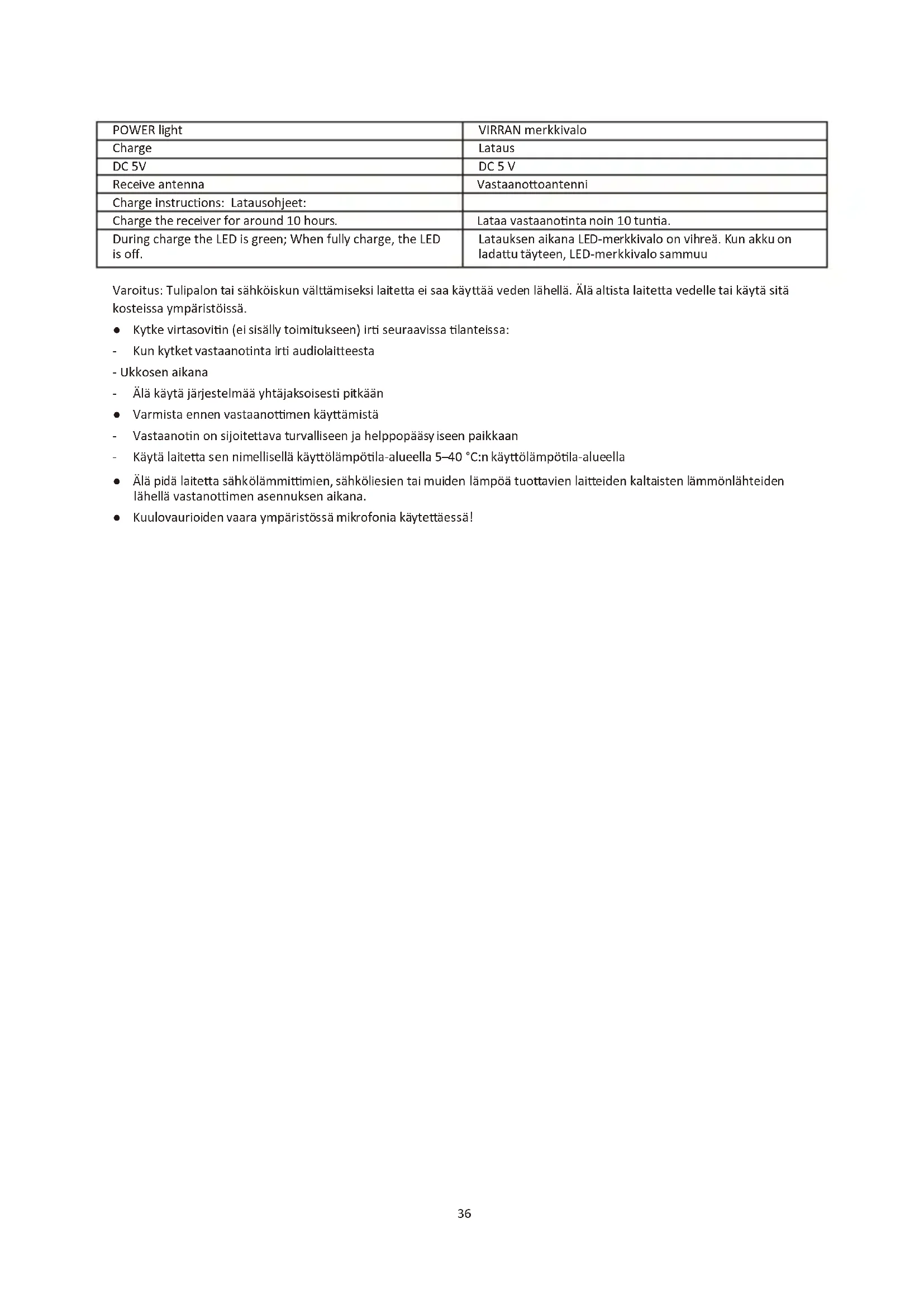 Varoitus: Tulipalon tai sahkoiskun valttamiseksi laitetta ei saa kayttä veden lahellä. Alä altista laitetta vedelle tai kaytä sitä kosteissa ymparistöissä.
