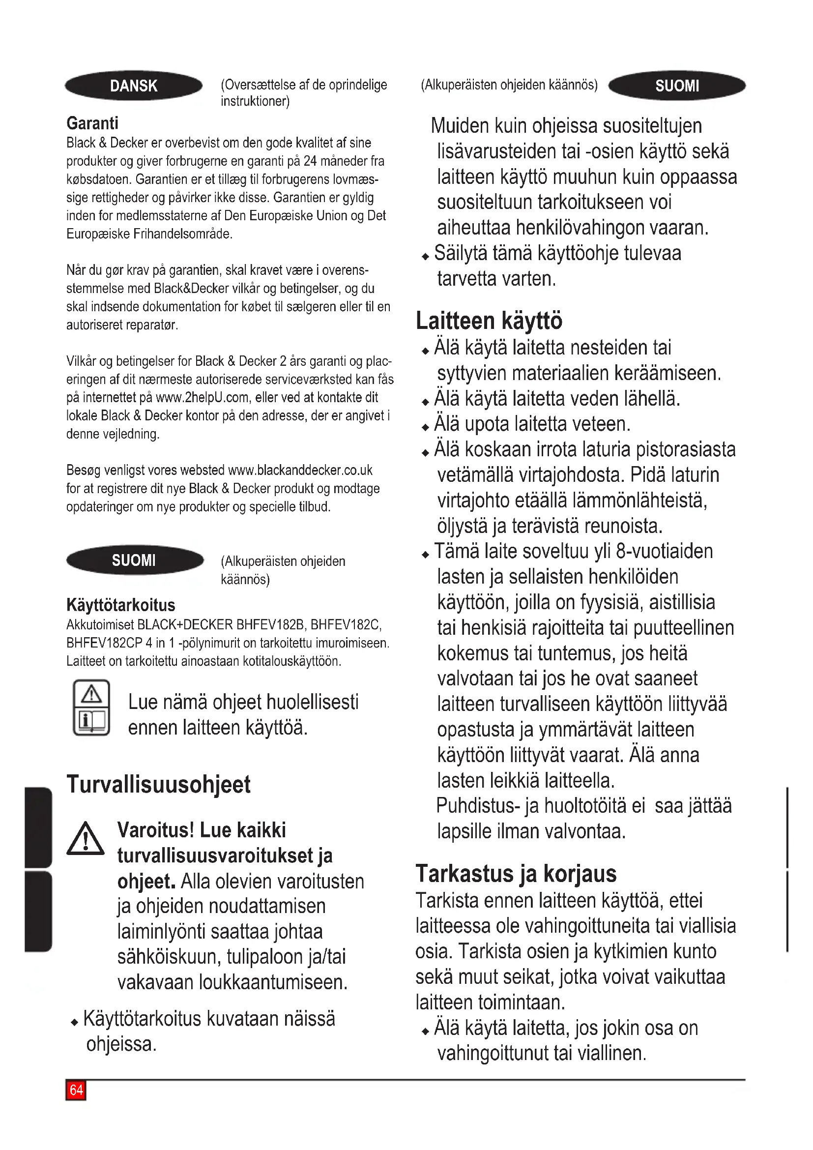 Varoitus! Lue kaikki turvallisuusvaroitukset ja ohjeet. Alla olevien varoitusten ja ohjeiden noudattamisen laiminlyönti saattaa johtaa sähköiskuun,tulipaloonja/tai vakavaan loukkaantumiseen. u Käyttötarkoituskuvataannäissä ohjeissa. Muiden kuin ohjeissa suositeltujen lisävarusteidentai-osienkäyttösekä laitteenkäyttömuuhunkuinoppaassa suositeltuun tarkoitukseen voi aiheuttaa henkilövahingon vaaran. u Säilytätämäkäyttöohjetulevaa tarvetta varten. Laitteen käyttö u Äläkäytälaitettanesteidentai syttyvienmateriaalienkeräämiseen. u Äläkäytälaitettavedenlähellä.u Äläupotalaitettaveteen.u Äläkoskaanirrotalaturiapistorasiasta vetämällävirtajohdosta.Pidälaturin virtajohtoetäällälämmönlähteistä, öljystäjaterävistäreunoista. u Tämälaitesoveltuuyli8-vuotiaiden lasten ja sellaisten henkilöiden käyttöön,joillaonfyysisiä,aistillisia taihenkisiärajoitteitataipuutteellinen kokemustaituntemus,josheitä valvotaan tai jos he ovat saaneet laitteenturvalliseenkäyttöönliittyvää opastustajaymmärtävätlaitteen käyttöönliittyvätvaarat.Äläanna lastenleikkiälaitteella. Puhdistus-jahuoltotöitäei saajättää lapsille ilman valvontaa. Tarkastus ja korjaus Tarkistaennenlaitteenkäyttöä,ettei laitteessa ole vahingoittuneita tai viallisia osia. Tarkista osien ja kytkimien kunto sekämuutseikat,jotkavoivatvaikuttaa laitteen toimintaan. u Äläkäytälaitetta,josjokinosaon vahingoittunut tai viallinen.65 (Alkuperäisten ohjeiden käännös)SUOMIu Korjauta tai vaihdata vaurioituneet tai vialliset osat valtuutetussa huoltoliikkeessä. u Tarkistasäännöllisesti,etteilaturin virtajohto ole vahingoittunut. Vaihda laturi, jos virtajohto on vahingoittunut tai viallinen. u Äläyritäkorjatataivaihtaamuita kuintässäkäyttöohjeessaerikseen määriteltyjäosia. Lisäturvaohjeet Käytön jälkeen u Irrota laturi pistorasiasta ennen laturin tai lataustelineen puhdistamista. u Kunlaitettaeikäytetä,seon säilytettäväkuivassapaikassa. u Pidälaitelastenulottumattomissa. Jäännösriskit Myös muut kuin turvavaroituksissa maini- tutriskitovatmahdollisialaitettakäytet- täessä.Nämäriskitvoivatliittyämuun muassavirheelliseentaipitkäaikaiseen käyttöön. Tiettyjäjäännösriskejäeivoivälttää, vaikkanoudatatkaikkiaturvamääräyksiä jakäytätturvalaitteita.Näitäovat: u Pyörivien tai liikkuvien osien koskettamisen aiheuttamat vahingot. u Osia,teriätailisävarusteita vaihdettaessa aiheutuneet vahingot. u Työkalunpitkäaikaisenkäytön aiheuttamatvahingot.Varmista,että pidätsäännöllisestitaukojalaitteen pitkäaikaisenkäytönaikana. u Kuulon heikkeneminen.u Laitettakäytettäessä(esimerkiksi puuta,erityisestitammea,pyökkiäja MDF-levyjä,käsiteltäessä)syntyneen pölynsisäänhengityksenaiheuttamat terveysriskit). Laturit Laturiontarkoitettutietyllejännitteelle. Tarkistaaina,ettäverkkojännitevastaa arvokilvessäilmoitettuajännitettä. Varoitus!Äläyritävaihtaalaturiintaval- lista verkkovirran pistoketta. u KäytäBLACK+DECKER-laturiavain laitteen mukana toimitetun akun lataamiseen.Muutakutvoivaträjähtää ja aiheuttaa henkilövahinkoja tai aineellisia vahinkoja. u Äläkoskaanyritäladataakkuja,joitaei ole tarkoitettu ladattaviksi. u Jos virtajohto vahingoittuu, sen vaihtaminenonturvallisuussyistä jätettävävalmistajantaivaltuutetun BLACK+DECKER-huollontehtäväksi. u Suojaalaturivedeltä.u Äläavaalaturia.u Älätyönnämitäänlaturinsisään.u Lataalaite/akkuvainhyvin tuuletetussa paikassa. Sähköturvallisuus Laturin symbolit