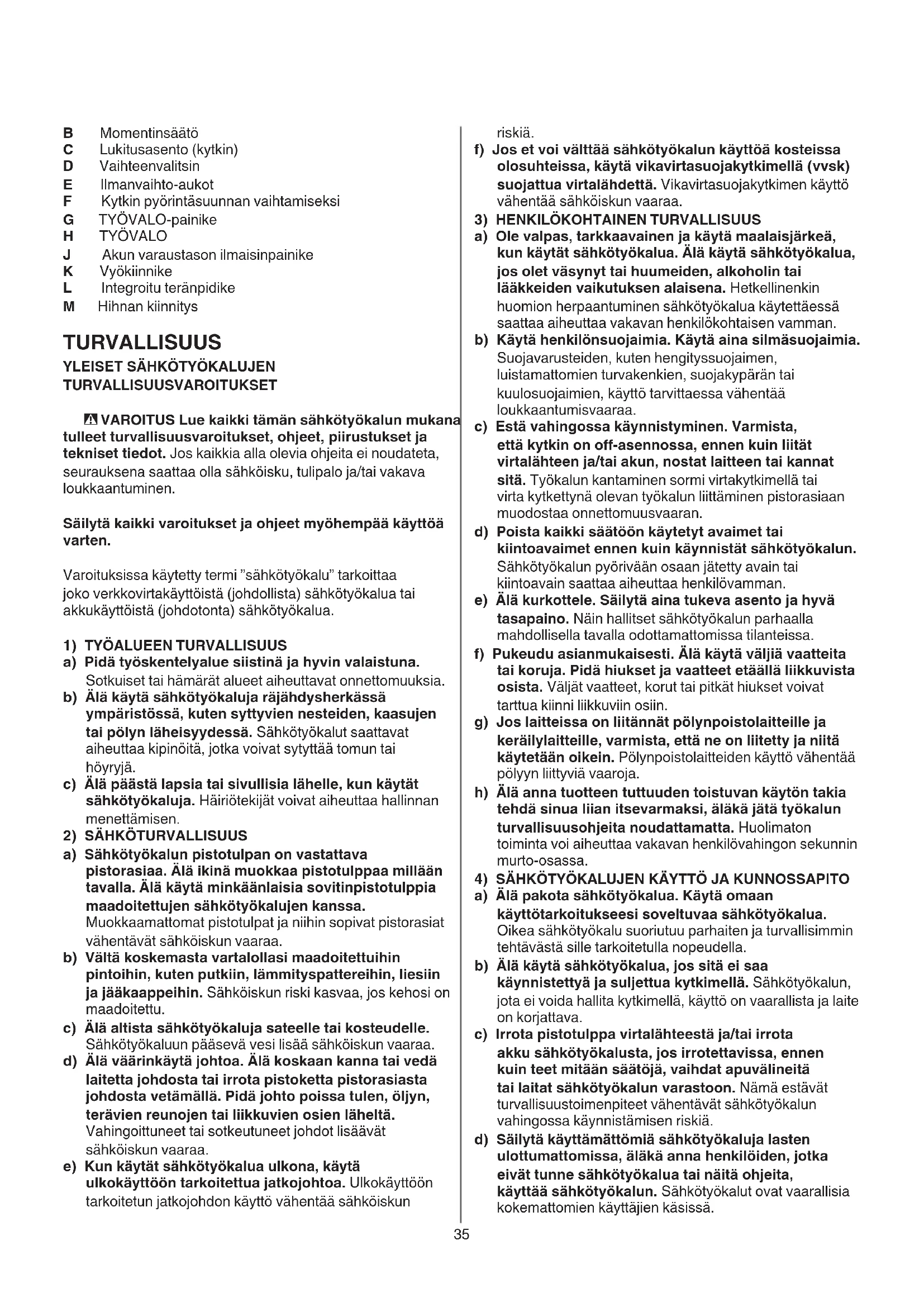 J Akun varaustason ilmaisinpainike K Vyökiinnike L Integroitu teränpidike M Hihnan kiinnitys TURVALLISUUS