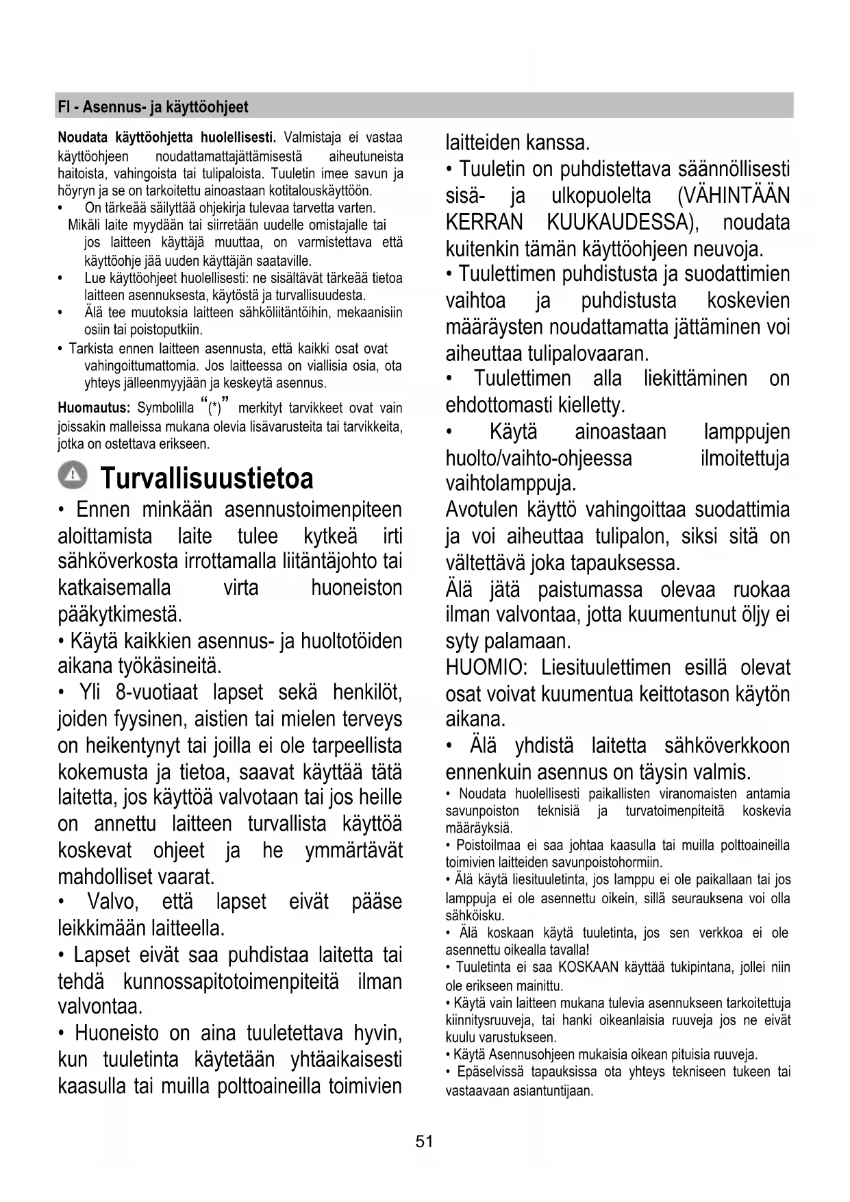 - Huoneisto on aina tuuletettava hyvin, kun tuuletinta käytetään yhtäaikaisesti kaasulla tai muilla polttoaineilla toimivien laitteiden kanssa.