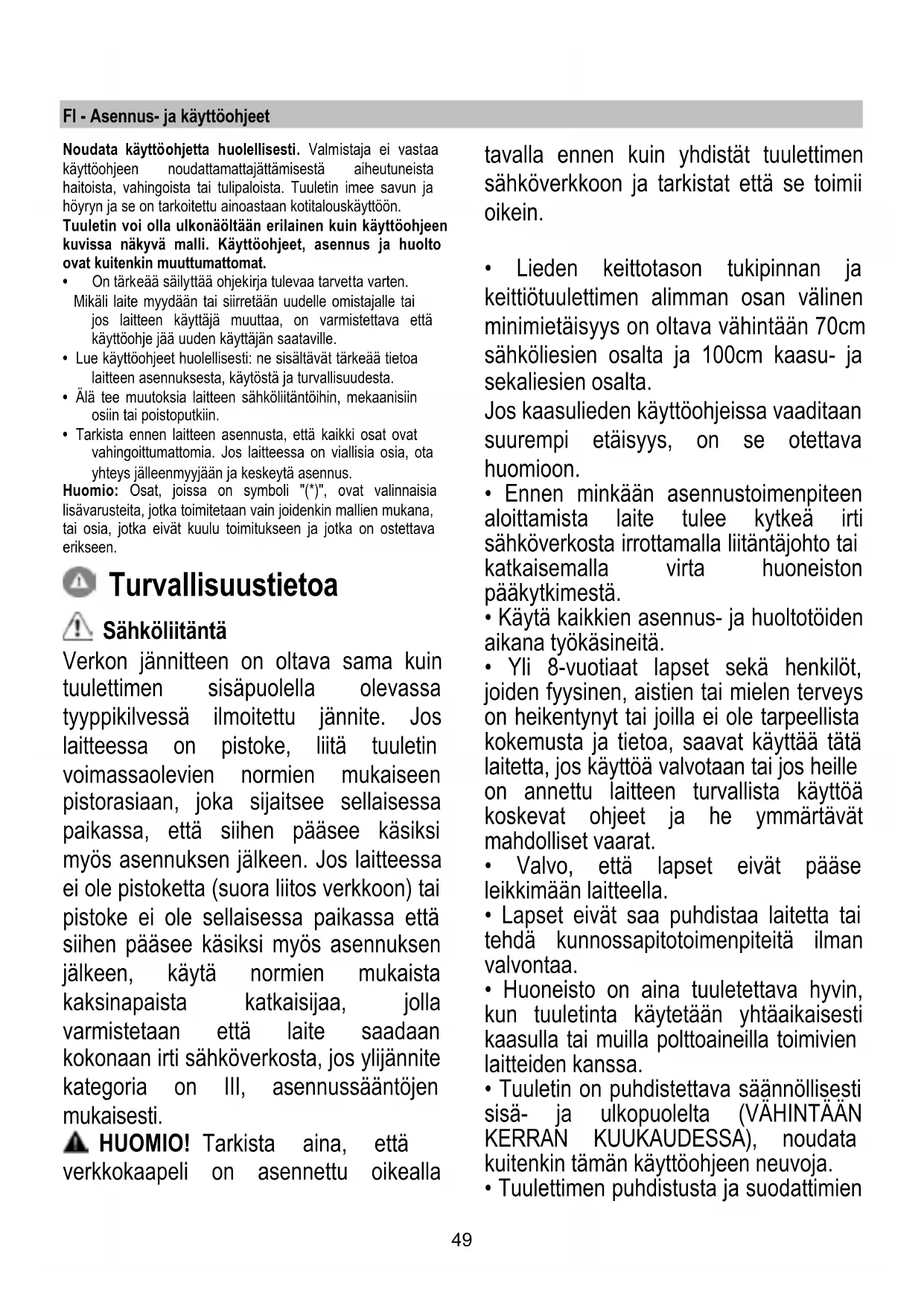 - Huoneisto on aina tuuletettava hyvin, kun tuuletinta käytetään yhtäaikaisesti kaasulla tai muilla polttoaineilla toimivien laitteiden kanssa.