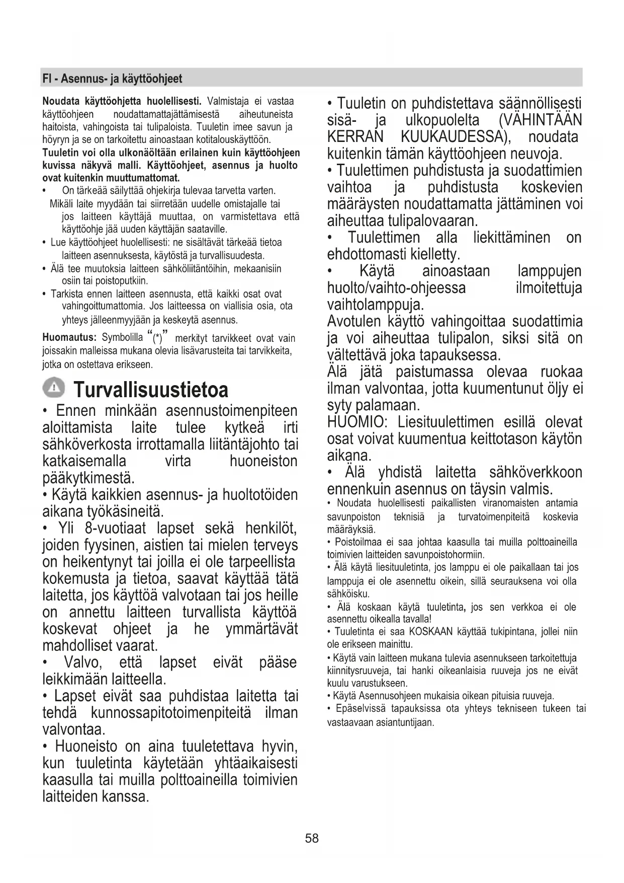 - Huoneisto on aina tuuletettava hyvin, kun tuuletinta käytetään yhtäaikaisesti kaasulla tai muilla polttoaineilla toimivien laitteiden kanssa.