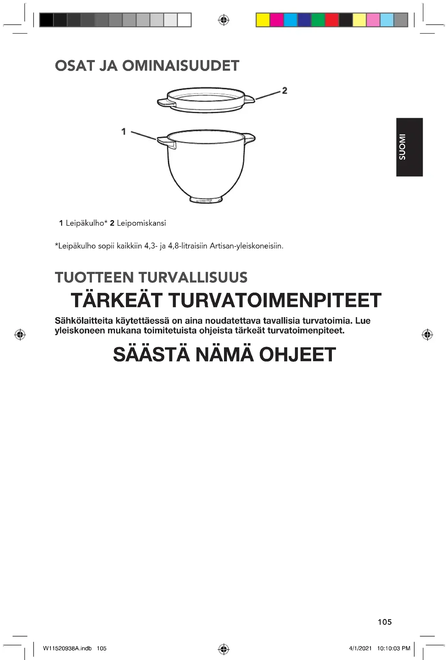 *Leipäkulho sopii kaikkiin 4,3- ja 4,8-litraisiin Artisan-yleiskoneisiin. W11520938A.indb 105W11520938A.indb 105 4/1/2021 10:10:03 PM4/1/2021 10:10:03 PM106 Aseta leipäkulho paikalleen pidikelaatalle.