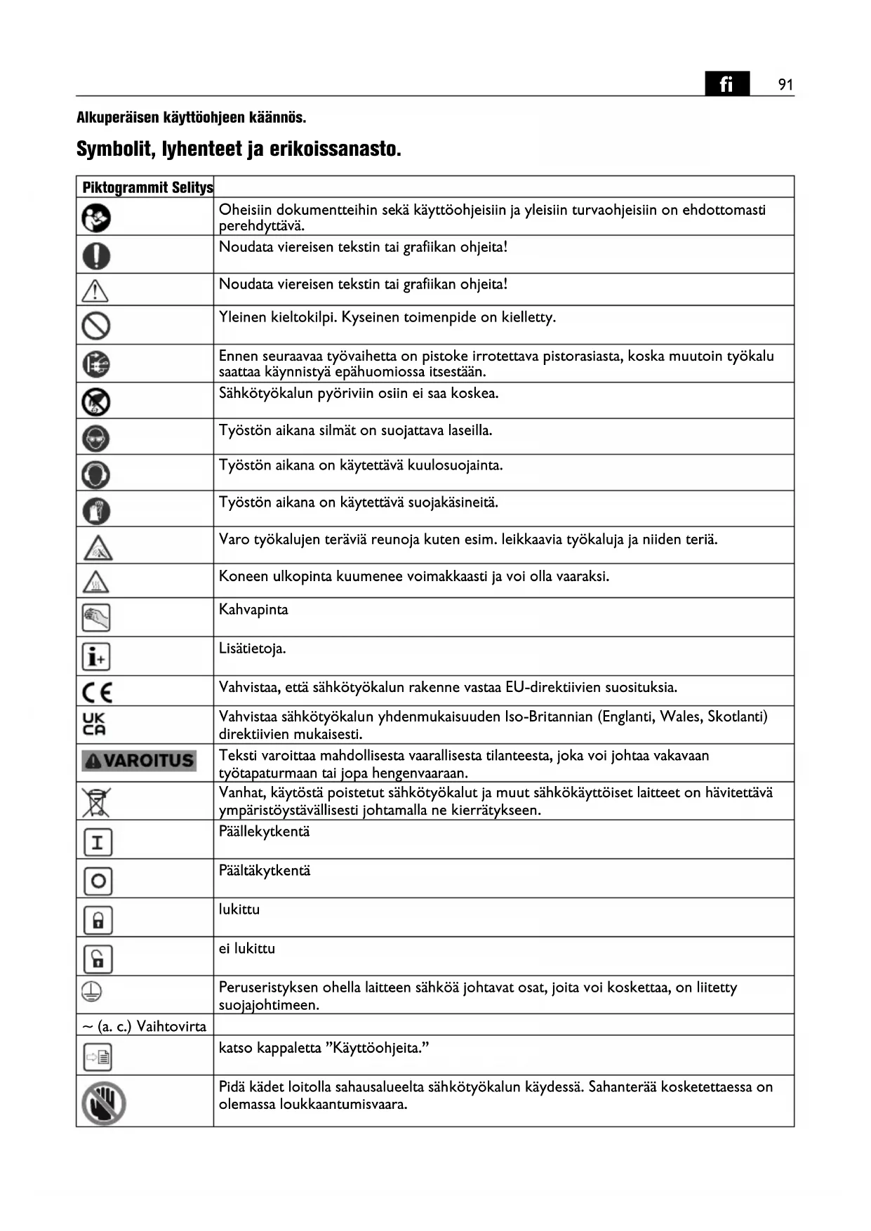 Alkuperäisen käyttöohjeen käännös. Symbolit, lyhenteet ja erikoissanasto. Piktogrammit Selitys Oheisiin dokumentteihin sekä käyttöohjeisiin ja yleisiin turvaohjeisiin on ehdottomasti perehdyttävä. Noudata viereisen tekstin tai grafiikan ohjeita! Noudata viereisen tekstin tai grafiikan ohjeita! Yleinen kieltokilpi. Kyseinen toimenpide on kielletty. Ennen seuraavaa työvaihetta on pistoke irrotettava pistorasiasta, koska muutoin työkalu saattaa käynnistyä epähuomiossa itsestään. Sähkötyökalun pyöriviin osiin ei saa koskea. Työstön aikana silmät on suojattava laseilla. Työstön aikana on käytettävä kuulosuojainta. Työstön aikana on käytettävä suojakäsineitä. Varo työkalujen teräviä reunoja kuten esim. leikkaavia työkaluja ja niiden teriä. Koneen ulkopinta kuumenee voimakkaasti ja voi olla vaaraksi. Kahvapinta Lisätietoja. Vahvistaa, että sähkötyökalun rakenne vastaa EU-direktiivien suosituksia. Vahvistaa sähkötyökalun yhdenmukaisuuden Iso-Britannian (Englanti, Wales, Skotlanti) direktiivien mukaisesti. Teksti varoittaa mahdollisesta vaarallisesta tilanteesta, joka voi johtaa vakavaan työtapaturmaan tai jopa hengenvaaraan. Vanhat, käytöstä poistetut sähkötyökalut ja muut sähkökäyttöiset laitteet on hävitettävä ympäristöystävällisesti johtamalla ne kierrätykseen. Päällekytkentä Päältäkytkentä lukittu ei lukittu Peruseristyksen ohella laitteen sähköä johtavat osat, joita voi koskettaa, on liitetty suojajohtimeen. ~ (a. c.) Vaihtovirta katso kappaletta ”Käyttöohjeita.” Pidä kädet loitolla sahausalueelta sähkötyökalun käydessä. Sahanterää kosketettaessa on olemassa loukkaantumisvaara.92